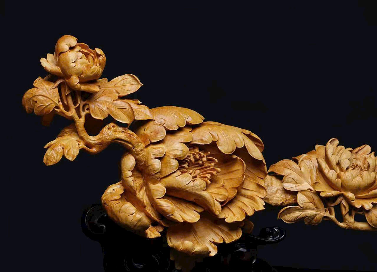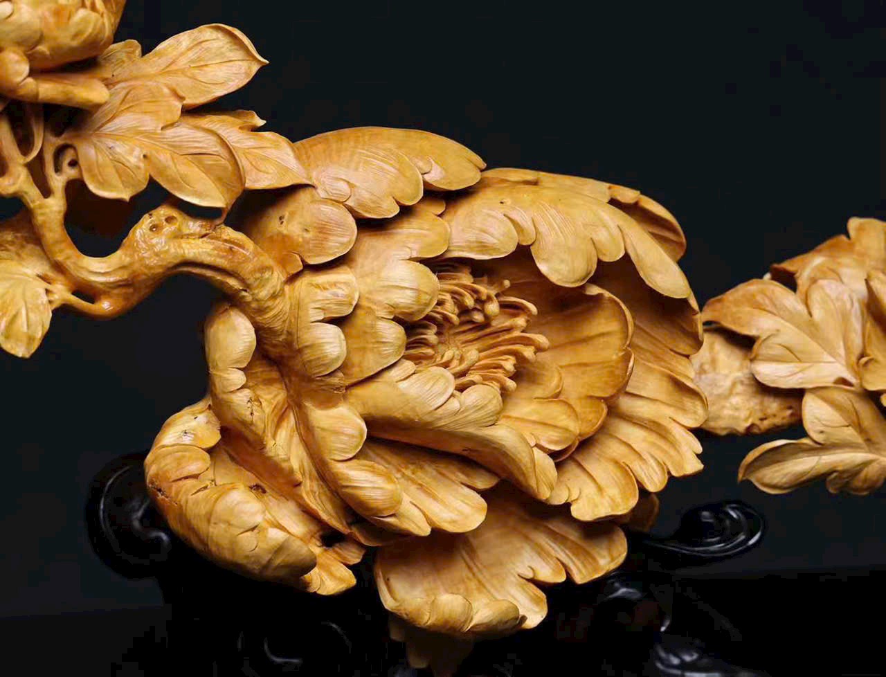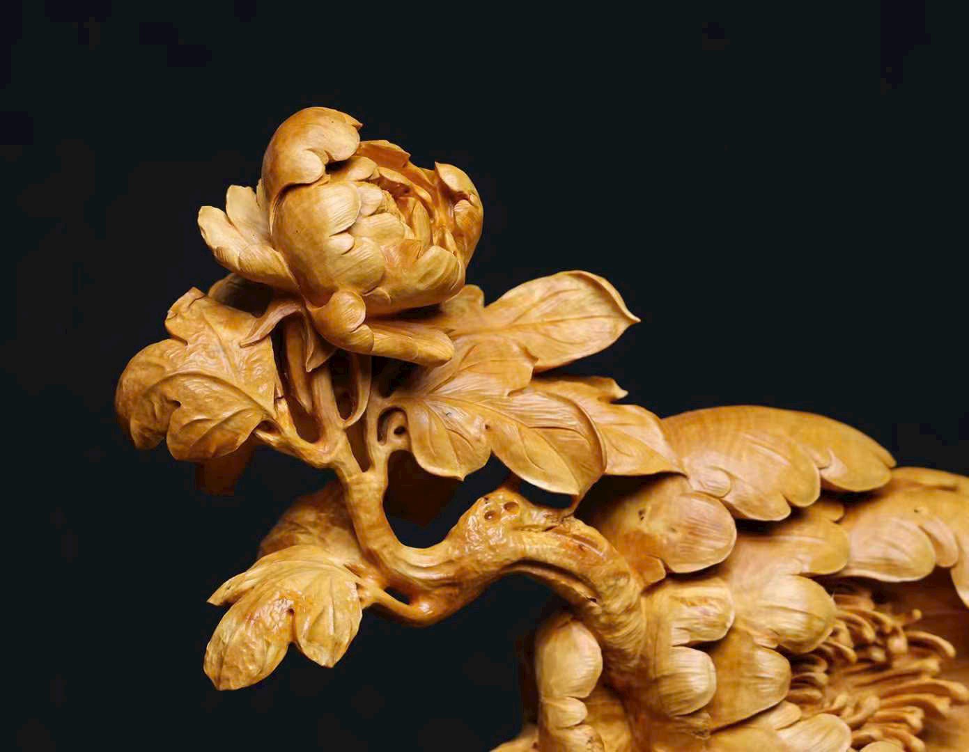 Chạm khắc thủ công từ nguyên khối. Hình tượng hoa mẫu đơn mang ý nghĩa phú quý cát tường, chim hỷ thước đậu cành tượng trưng cho may mắn, mọi sự như ý. Thiết kế kèm đế, tổng thể bề thế trang nhã, chi tiết làm kỹ, tình trạng bảo quản rất tốt.