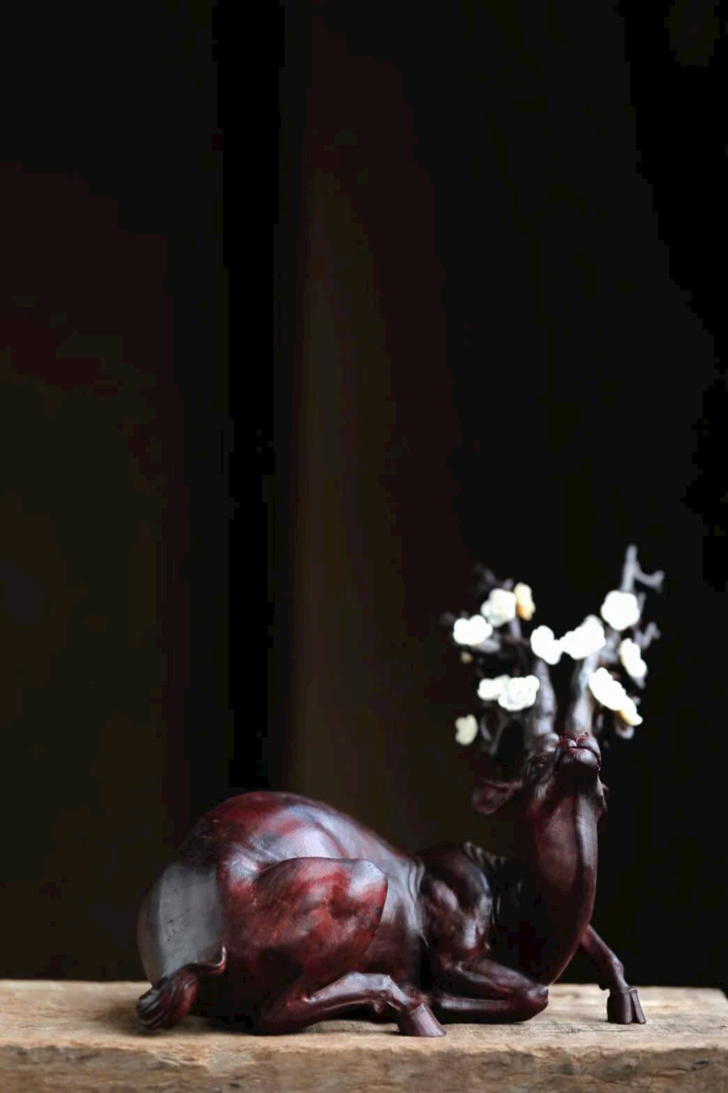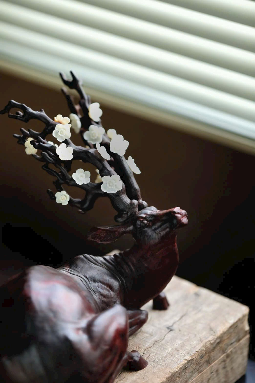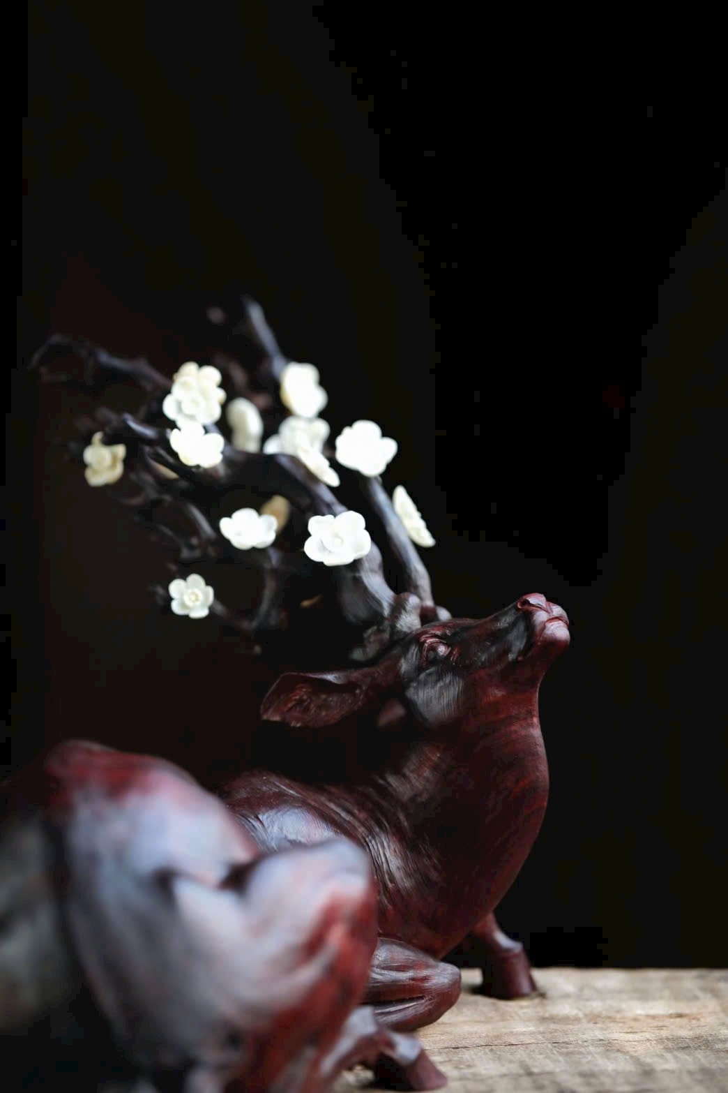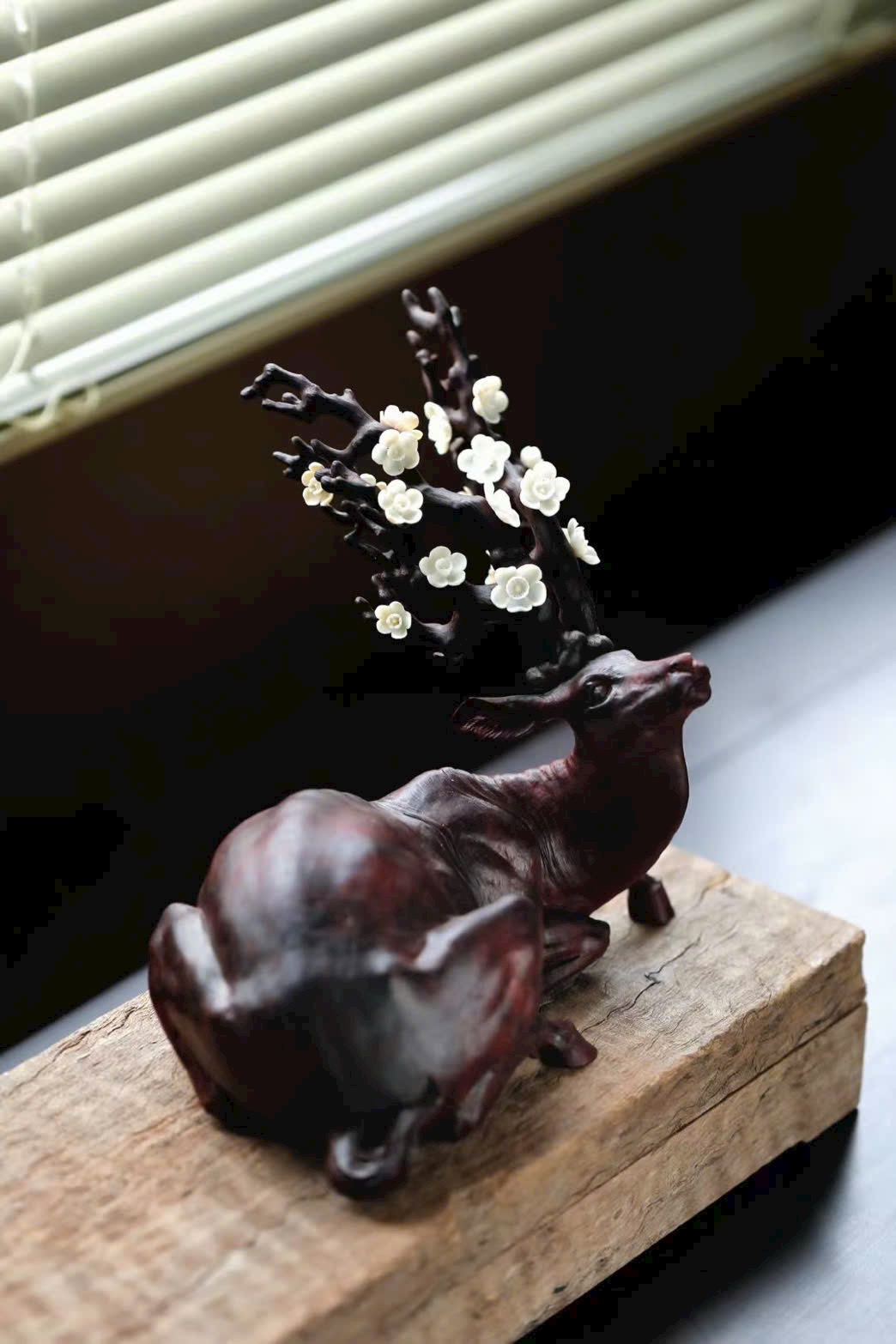 • Phần sừng hươu và đầu hươu được khảm ngà voi ma mút điểm hoa mai, tinh xảo.