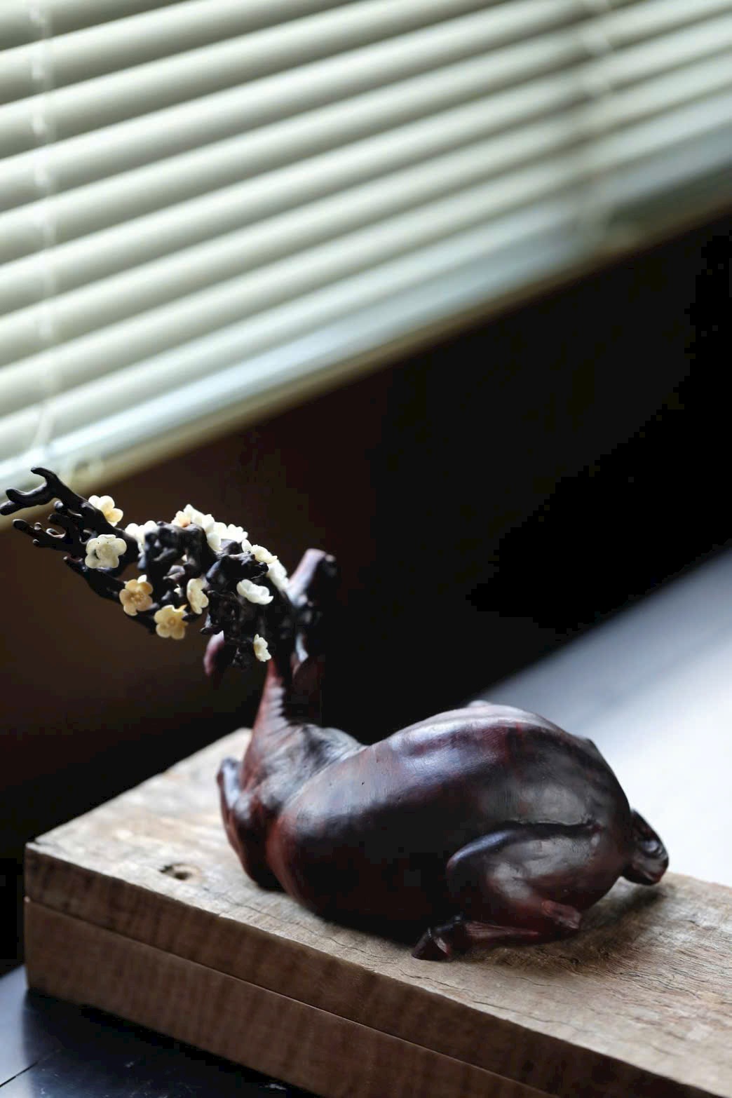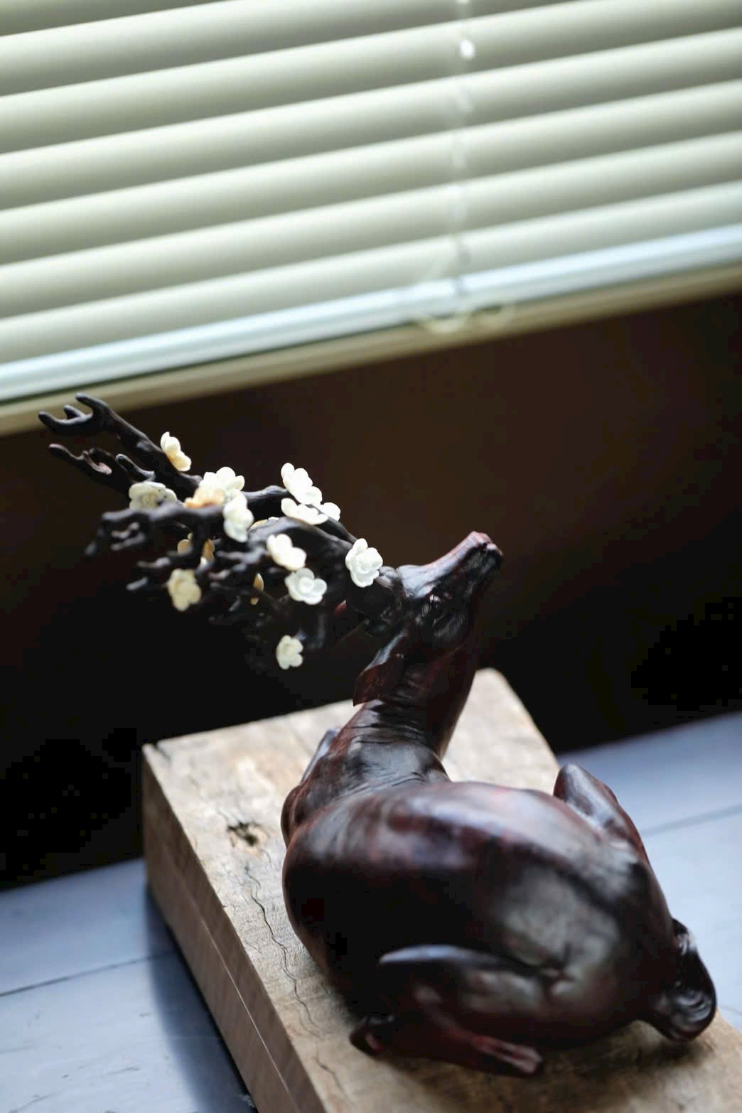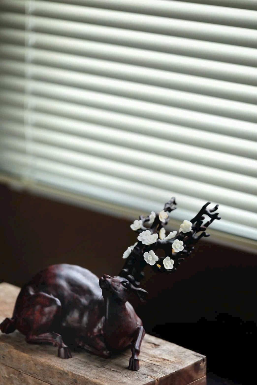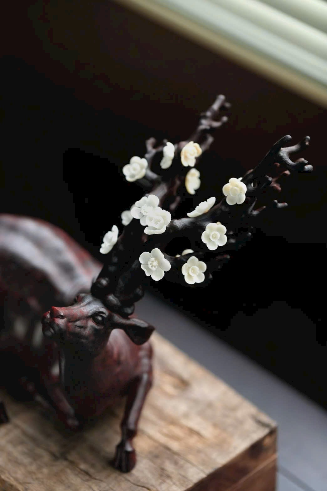 • Phần sừng hươu và đầu hươu được khảm ngà voi ma mút điểm hoa mai, tinh xảo.