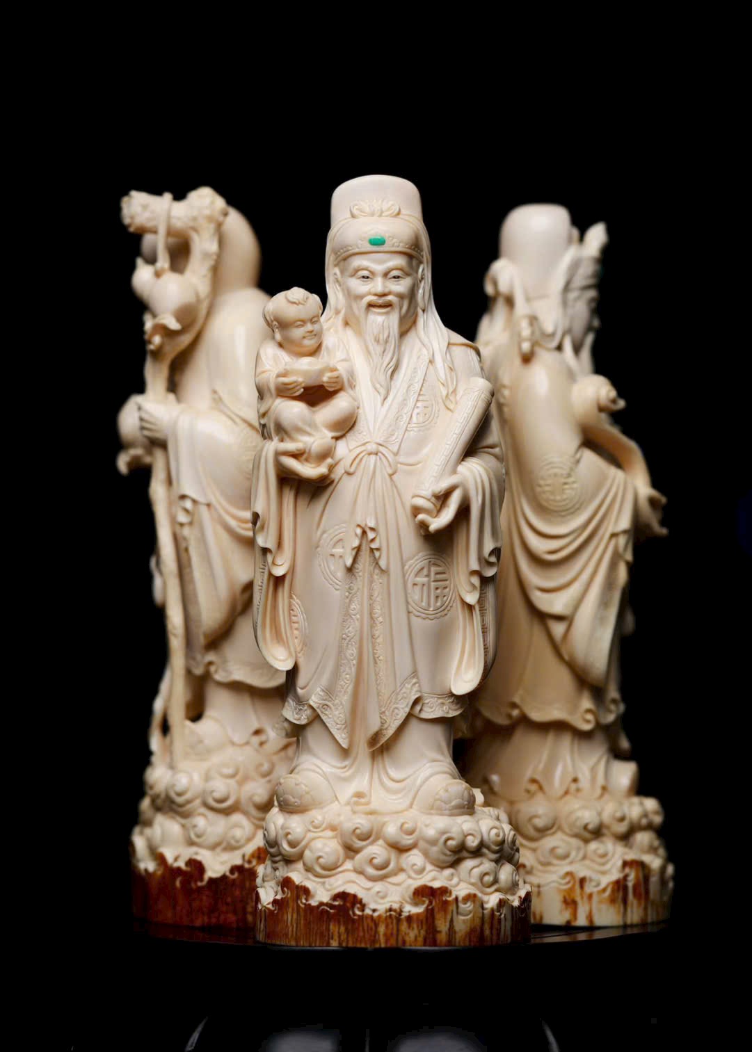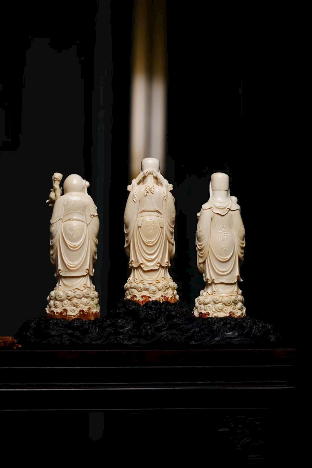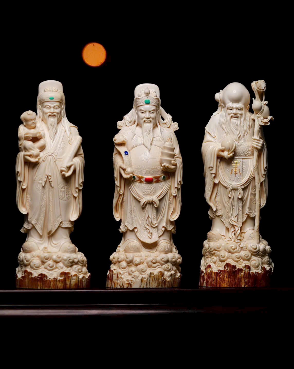 Chọn lọc n.gà mamut 5A tuyệt phẩm, được danh gia chạm khắc thủ công tinh xảo. Bộ tượng không chỉ thể hiện thể trạng đầy đặn, uy nghi, mà khuôn mặt cũng được khắc họa hiền hòa và sinh động. Phúc, Lộc, Thọ tay cầm các bảo vật, mang niềm vui và phúc đến khắp nơi, đem lại may mắn tràn đầy cho cả gia đình.