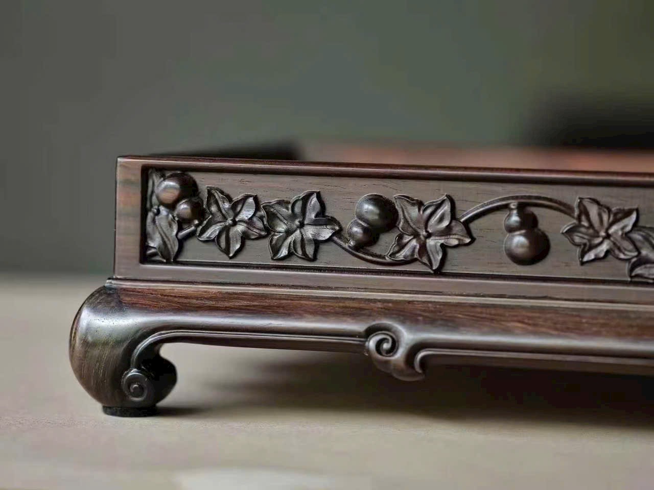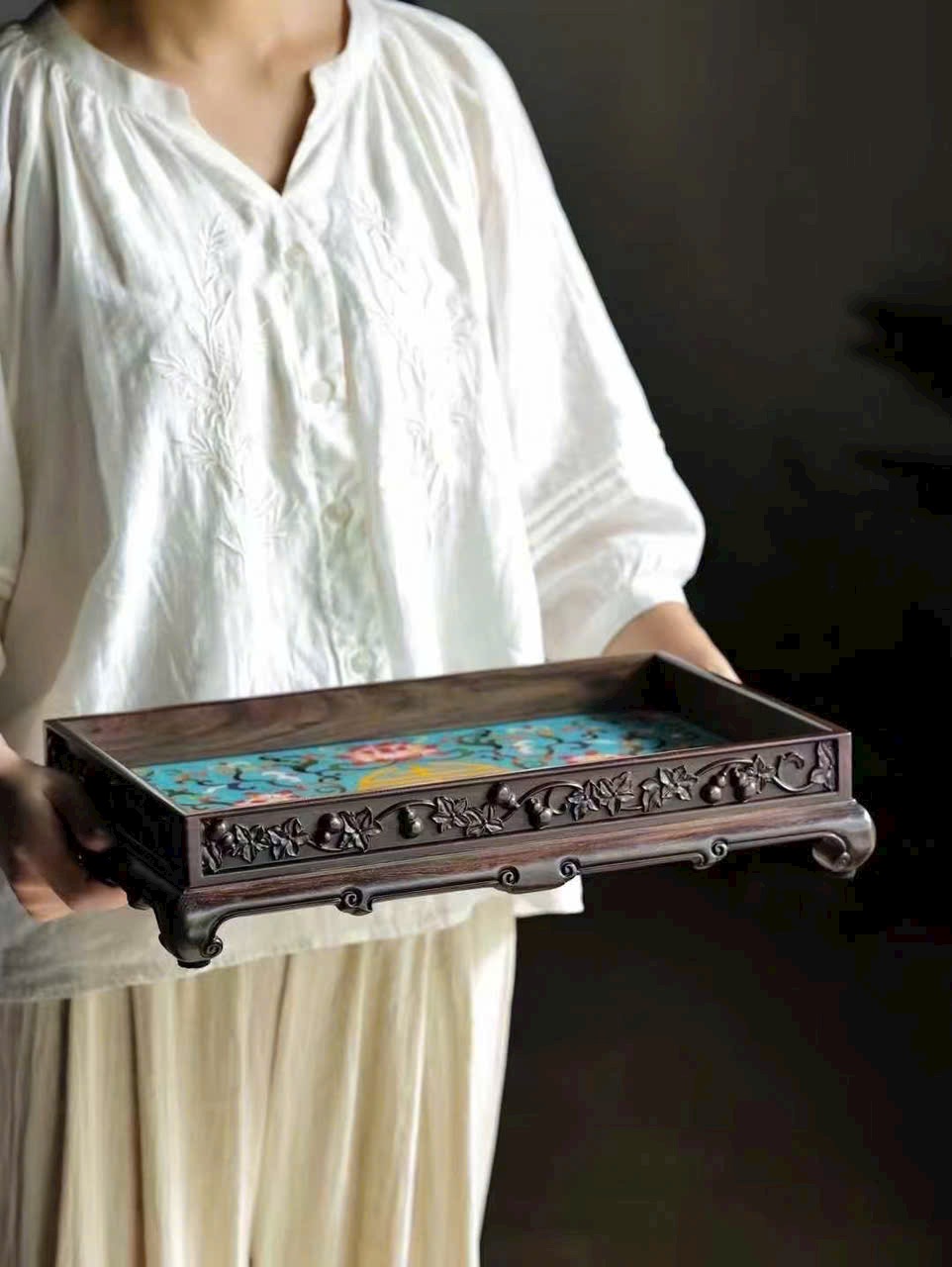 Đặc điểm: Chế tác tinh xảo từ gỗ trắc Lào bằng kỹ thuật mộng truyền thống, dáng chữ nhật, đường nét trơn tru thanh thoát. Có thể dùng làm khay thư phòng, vừa mang vẻ trang nhã, khí chất nho nhã, vừa có giá trị trưng bày và sử dụng