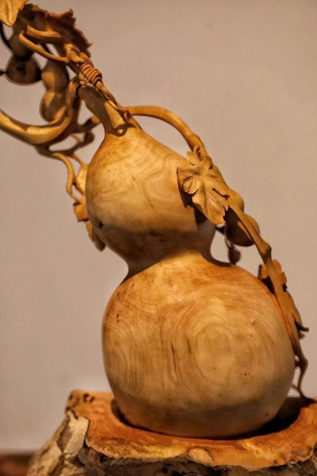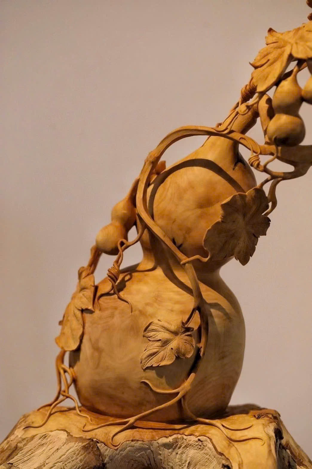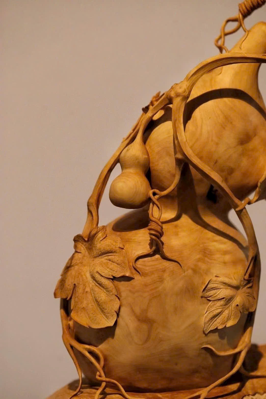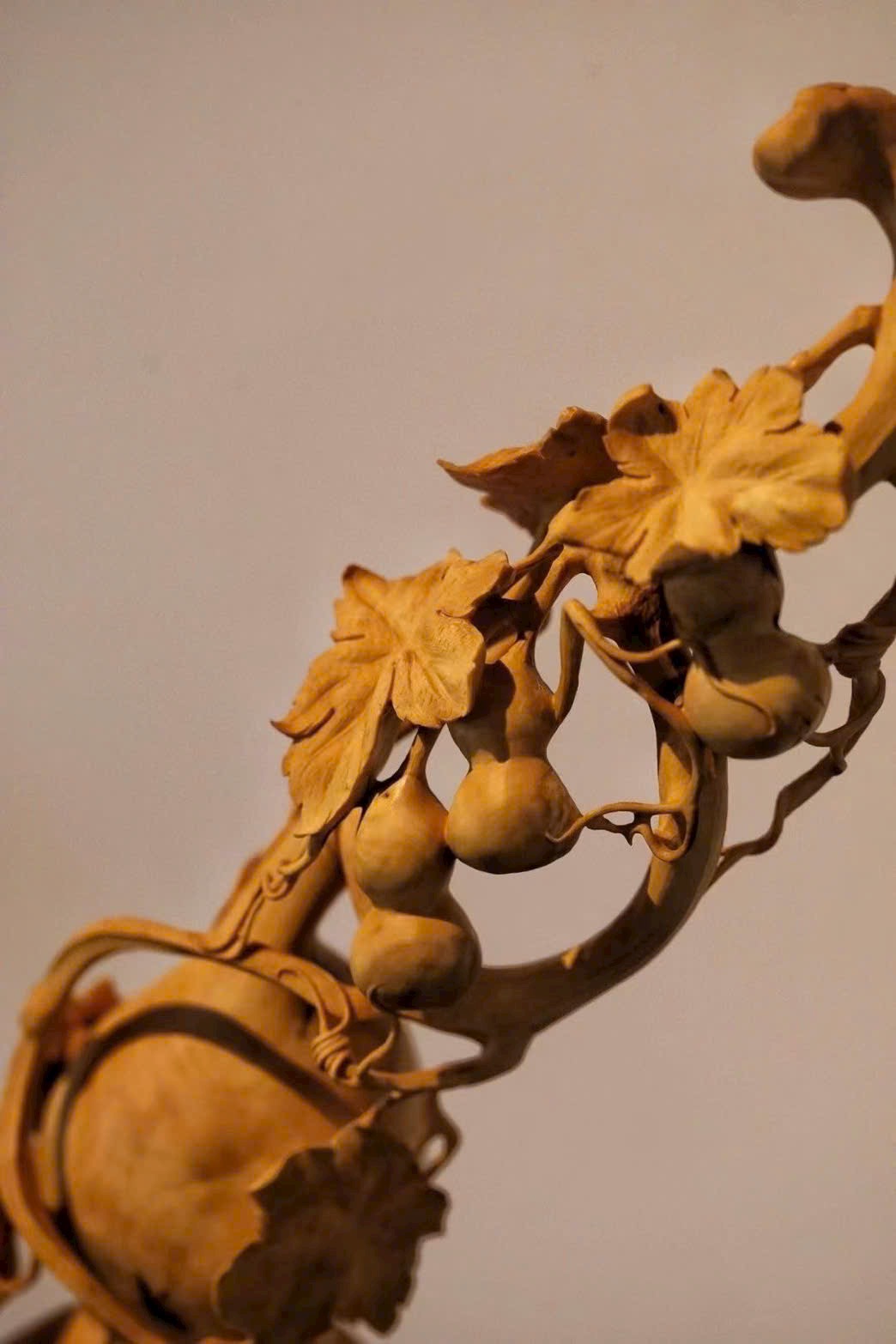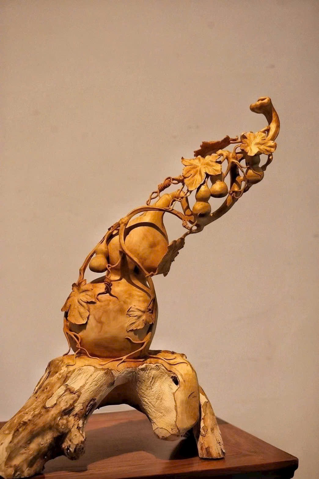 Tác phẩm được chế tác thủ công từ một khối gỗ nguyên khối, điêu khắc xuyên suốt với kỹ pháp thuần thục, tinh xảo. Hình tượng hồ lô nối liền cành lá và quả, dây leo uốn lượn thể hiện rõ tay nghề vững vàng. Toàn bộ tác phẩm toát lên sinh khí linh động, mang ý nghĩa phúc lộc vạn đời, con cháu nối tiếp như dây leo đơm trái không ngừng.