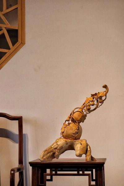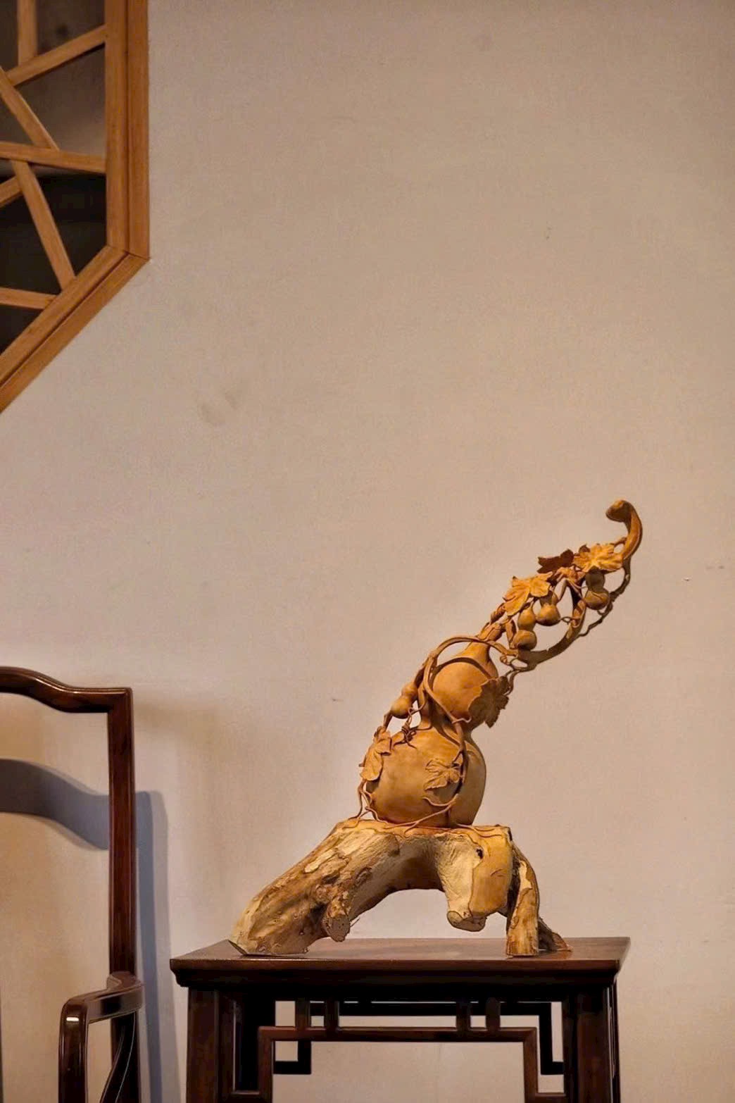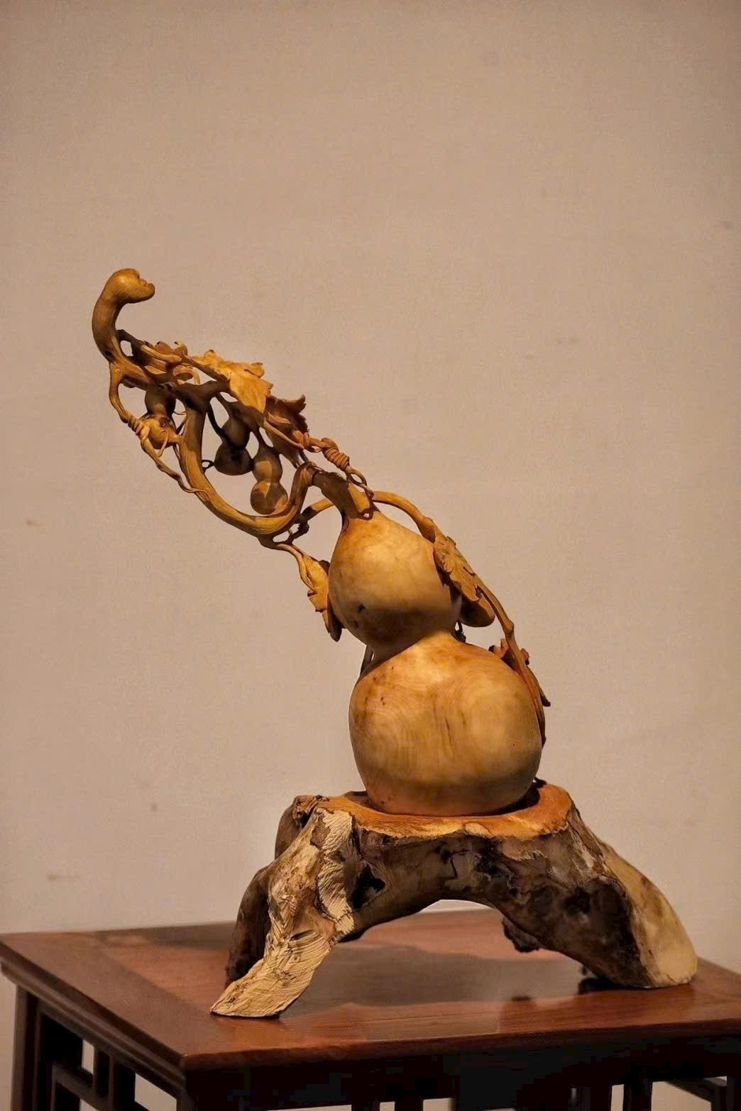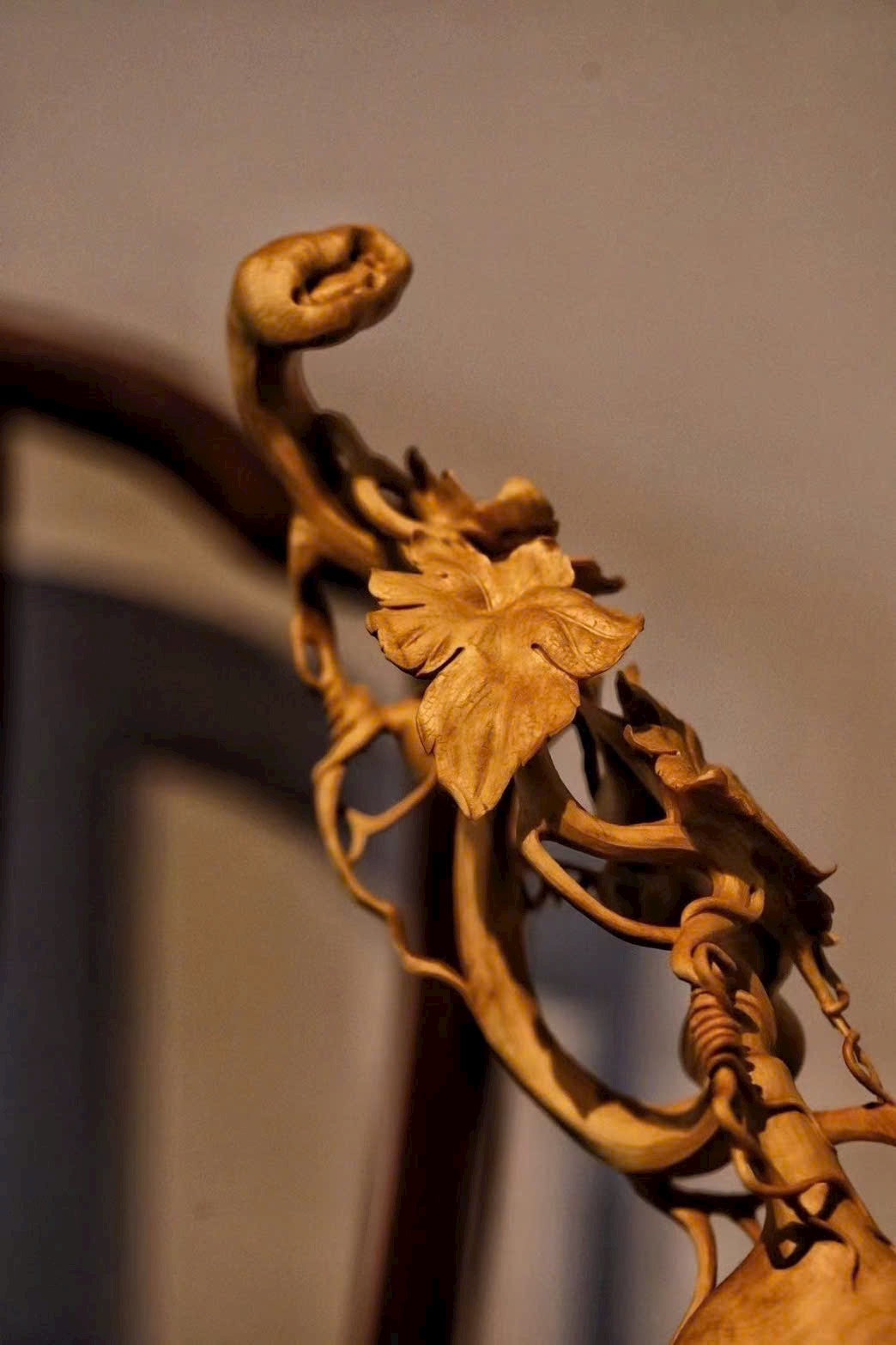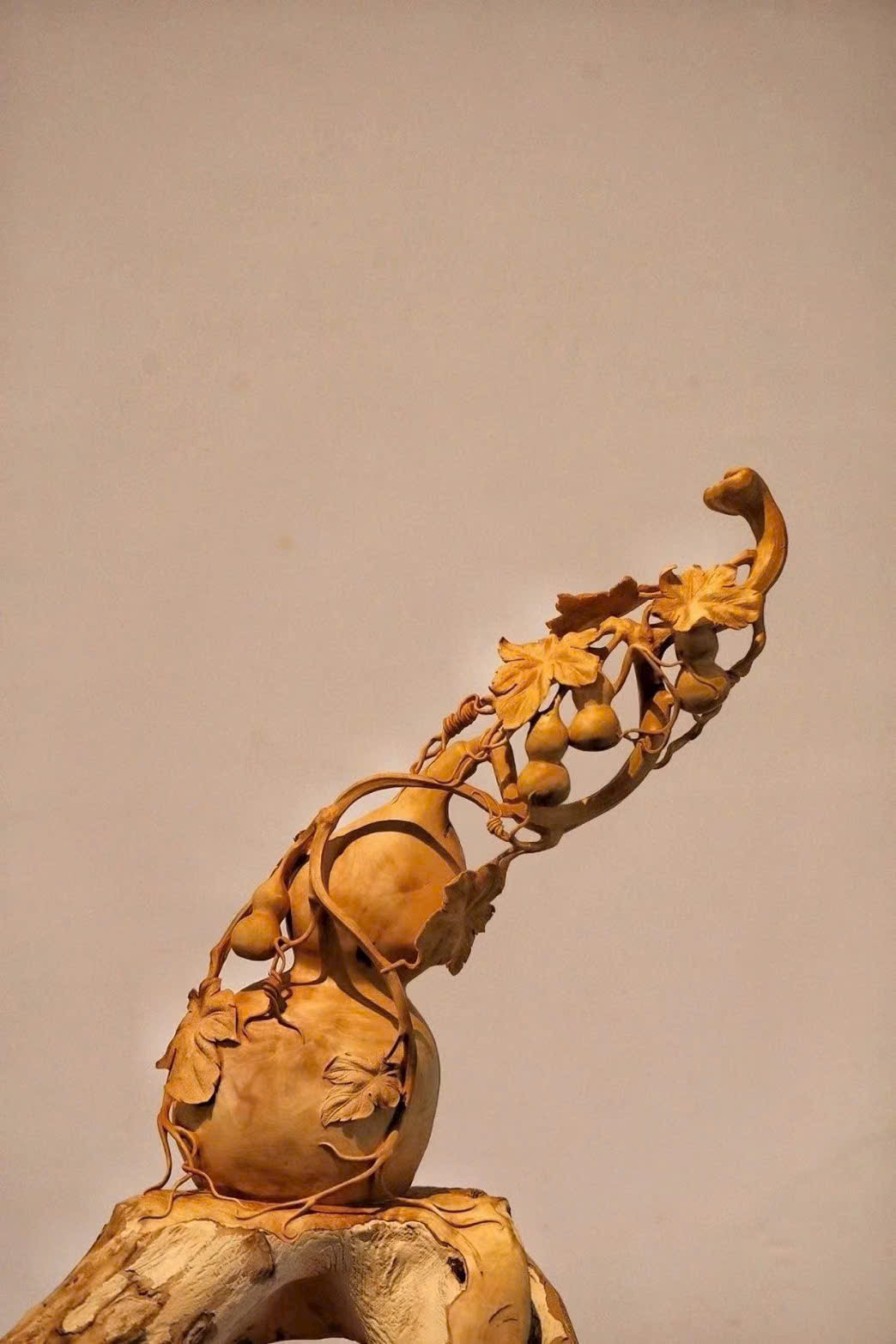 Tác phẩm được chế tác thủ công từ một khối gỗ nguyên khối, điêu khắc xuyên suốt với kỹ pháp thuần thục, tinh xảo. Hình tượng hồ lô nối liền cành lá và quả, dây leo uốn lượn thể hiện rõ tay nghề vững vàng. Toàn bộ tác phẩm toát lên sinh khí linh động, mang ý nghĩa phúc lộc vạn đời, con cháu nối tiếp như dây leo đơm trái không ngừng.