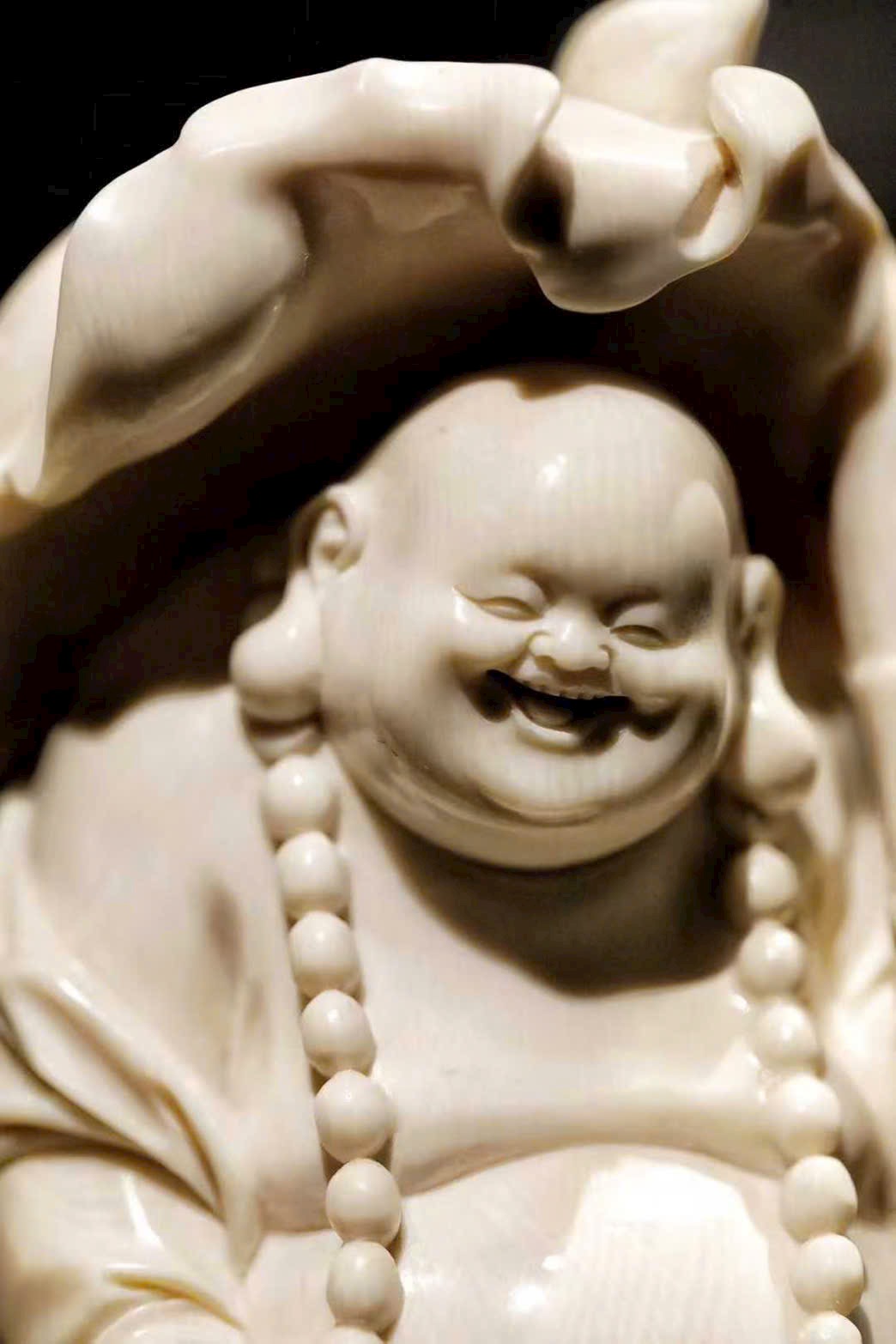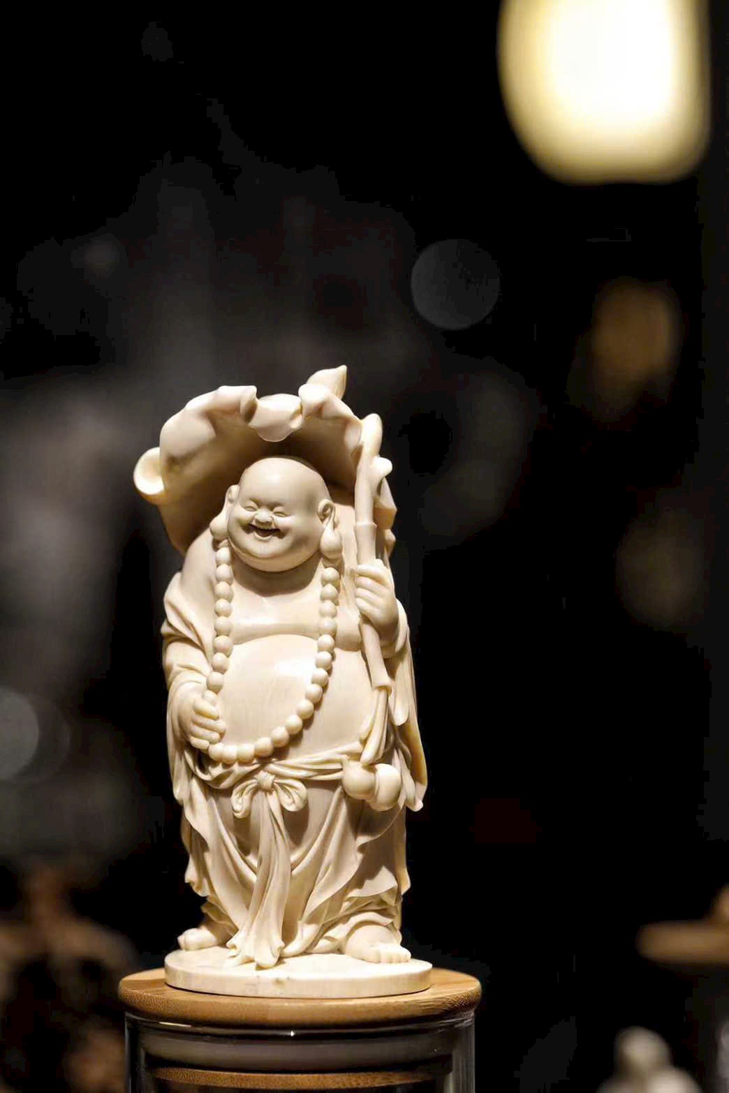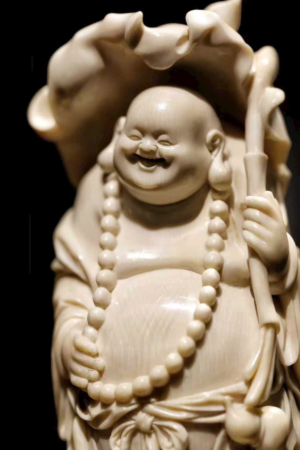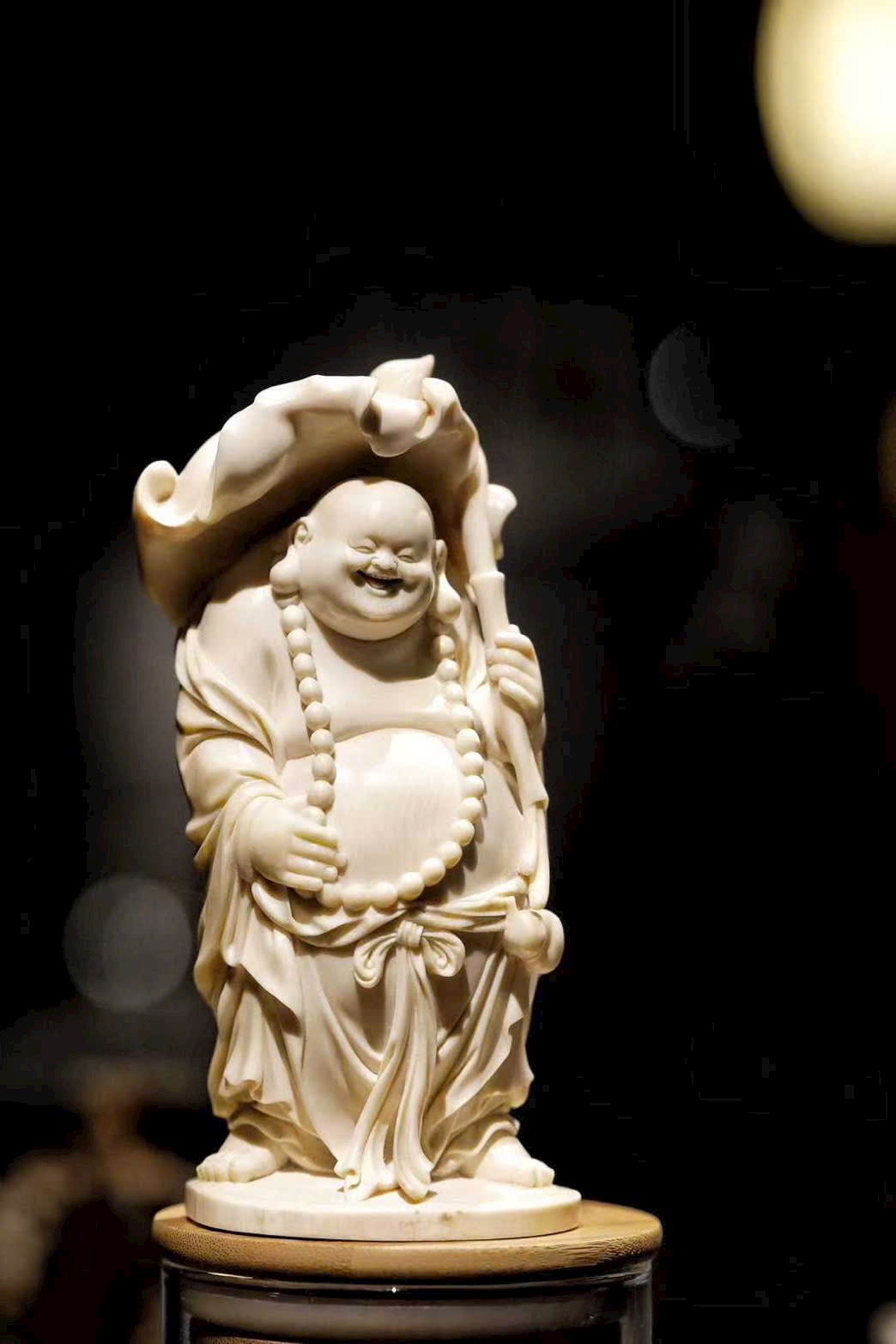 Tác phẩm được chạm khắc từ ng.à voi ma mút, tạo hình Phật Di Lặc với nụ cười hoan hỷ, bụng lớn dung chứa vạn vật.