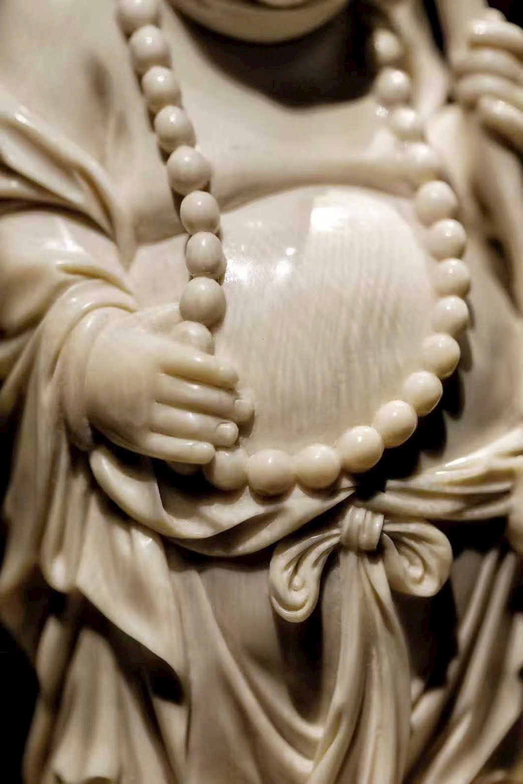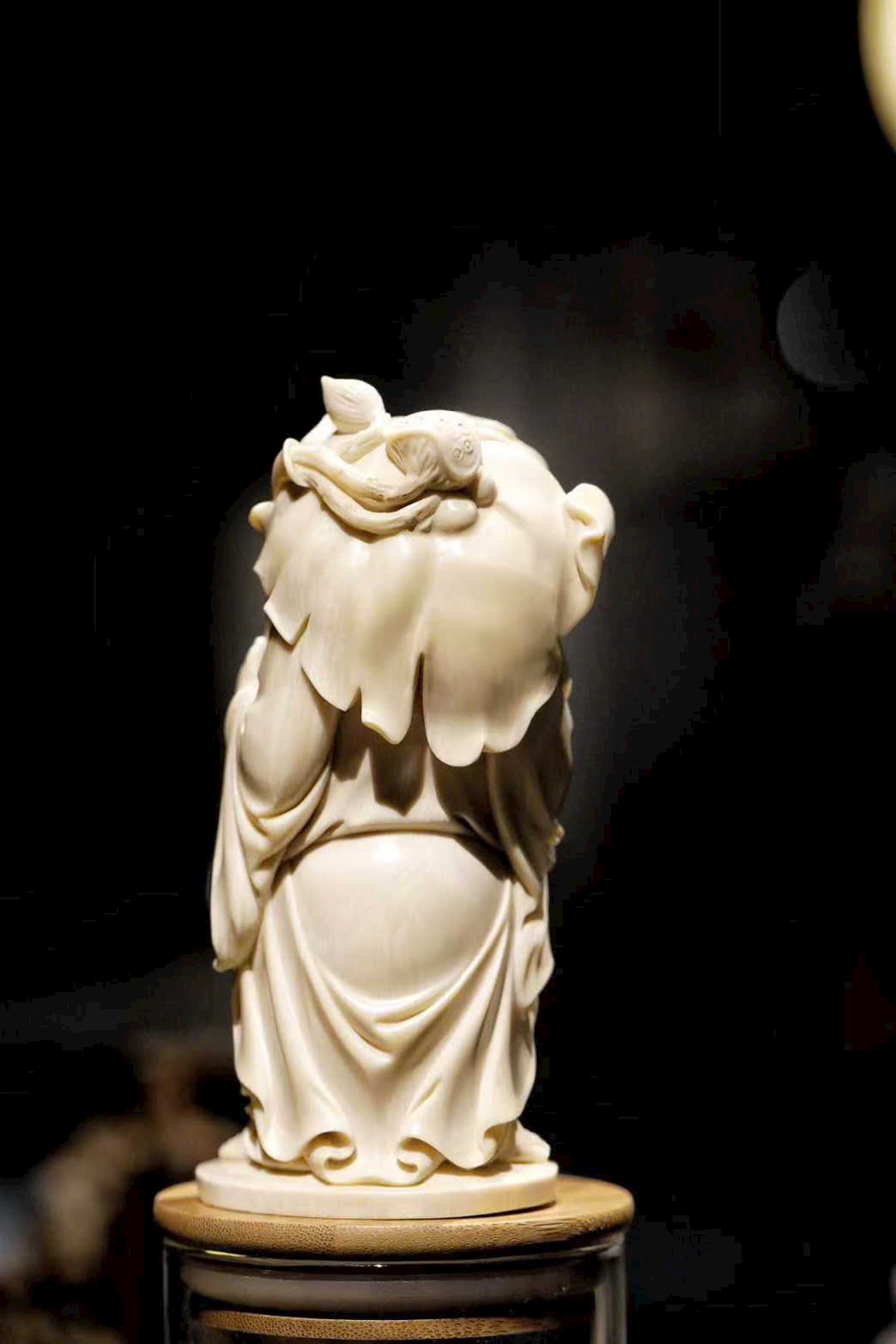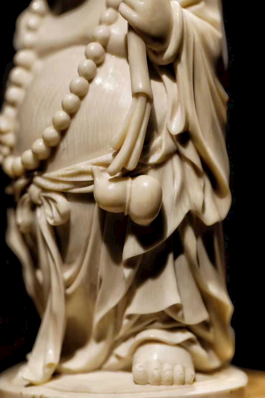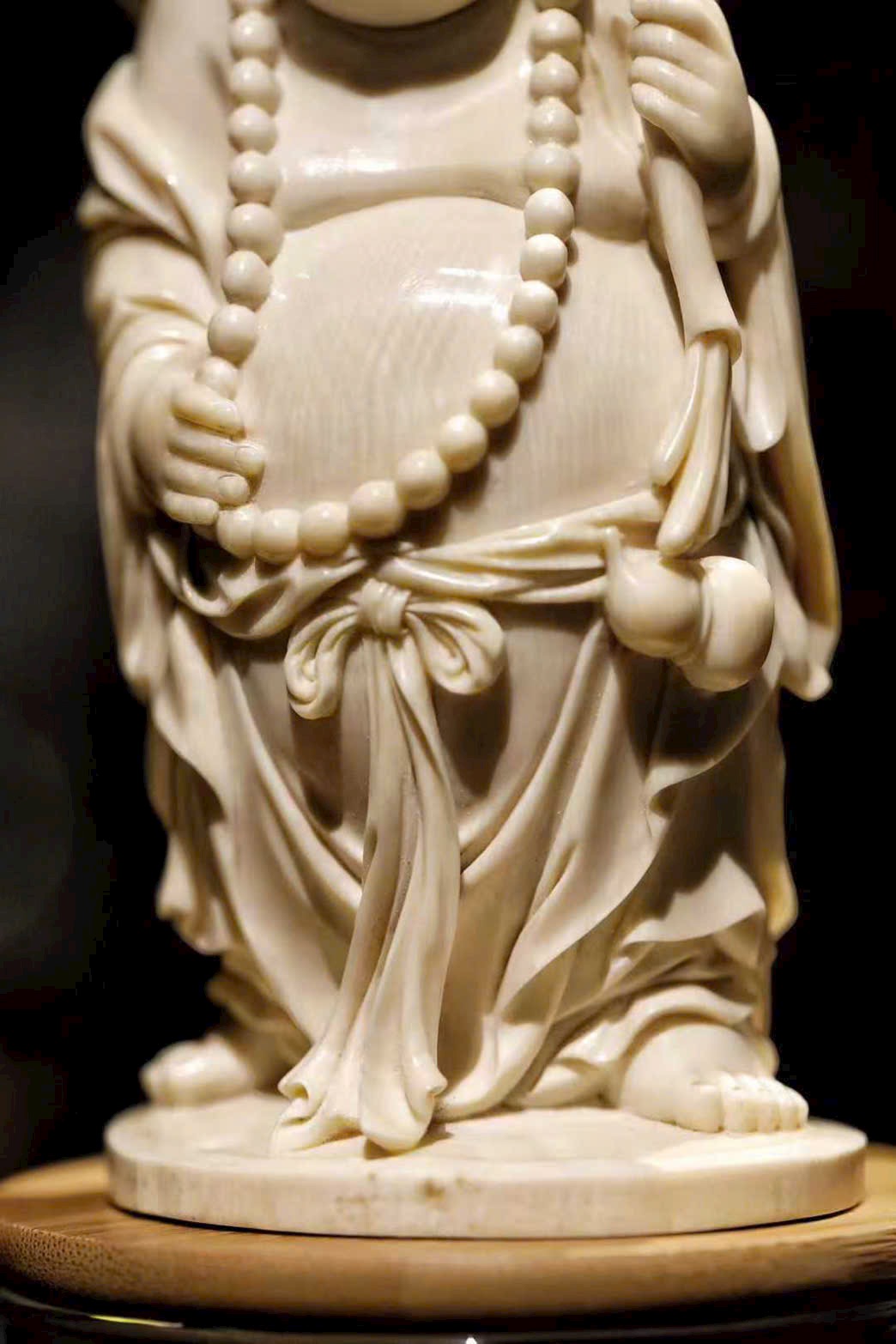 Tác phẩm được chạm khắc từ ng.à voi ma mút, tạo hình Phật Di Lặc với nụ cười hoan hỷ, bụng lớn dung chứa vạn vật.