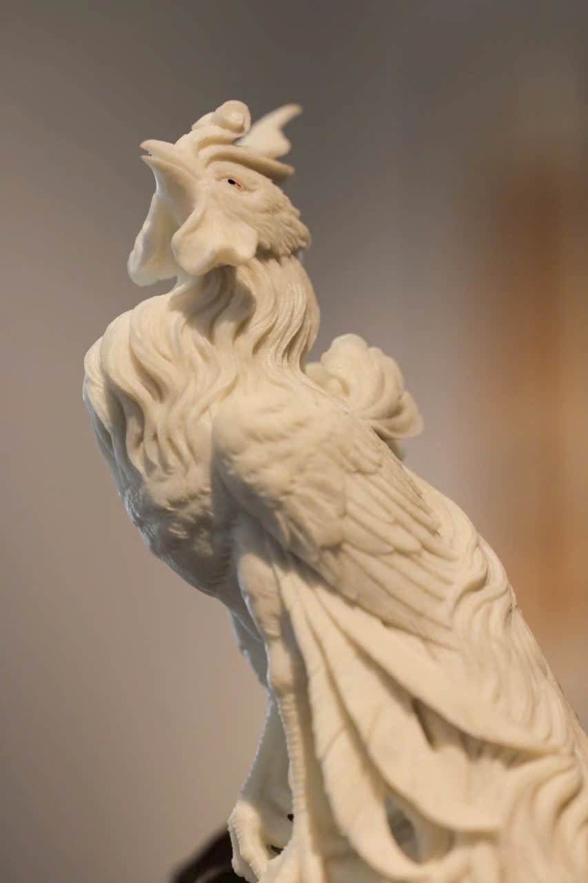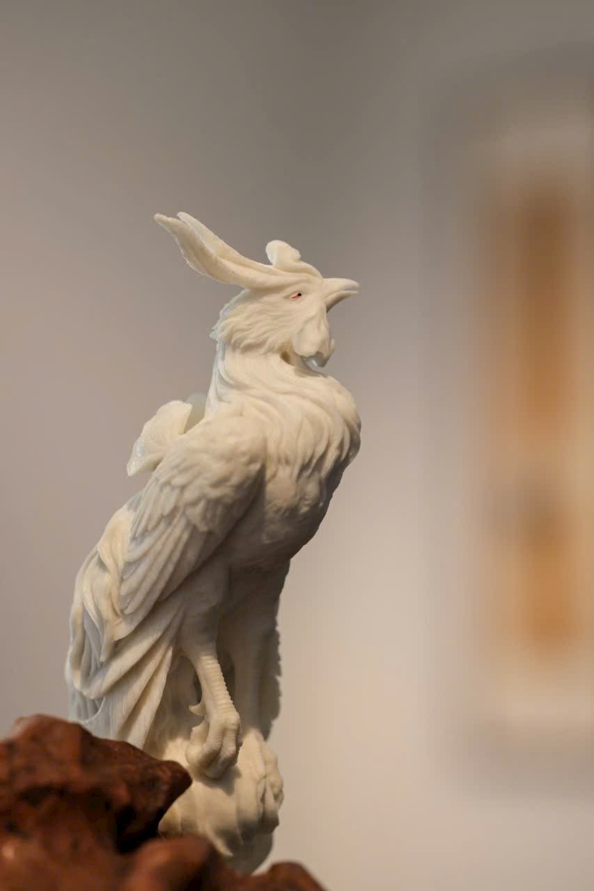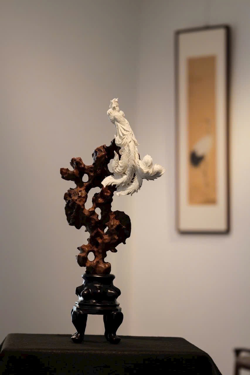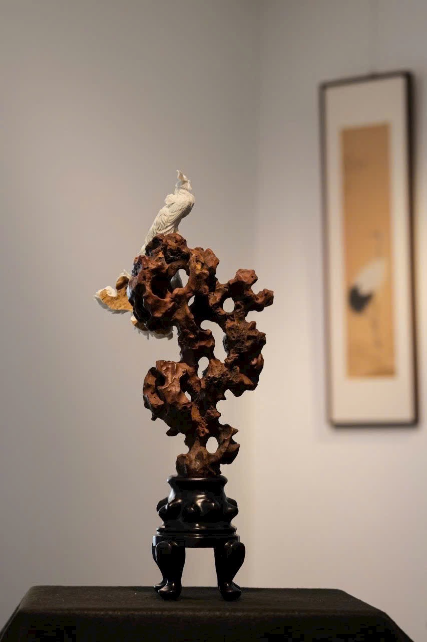 Khối đá Thái Hồ xuyên mắt tự nhiên, tầng tầng lớp lớp, tựa như “gió nhẹ trăng soi”, mang vẻ thoáng đãng và thi vị. Trên nền đá, hình tượng chim phượng được chạm khắc với từng lớp lông vũ tinh xảo, thân hình thanh thoát uyển chuyển. Đuôi phượng mềm mại như dải lụa tung bay, kiêu hãnh đứng trên đá thưởng ngoạn.