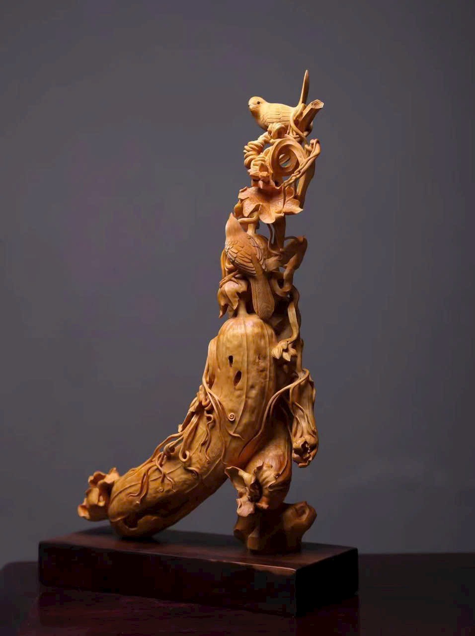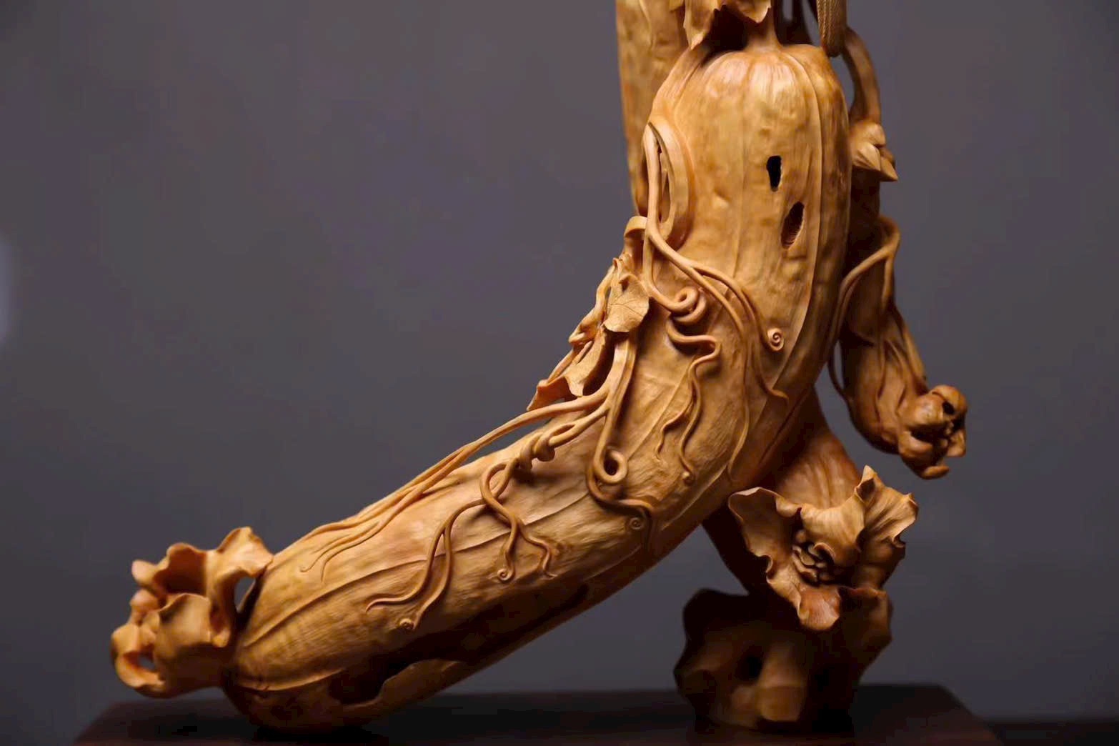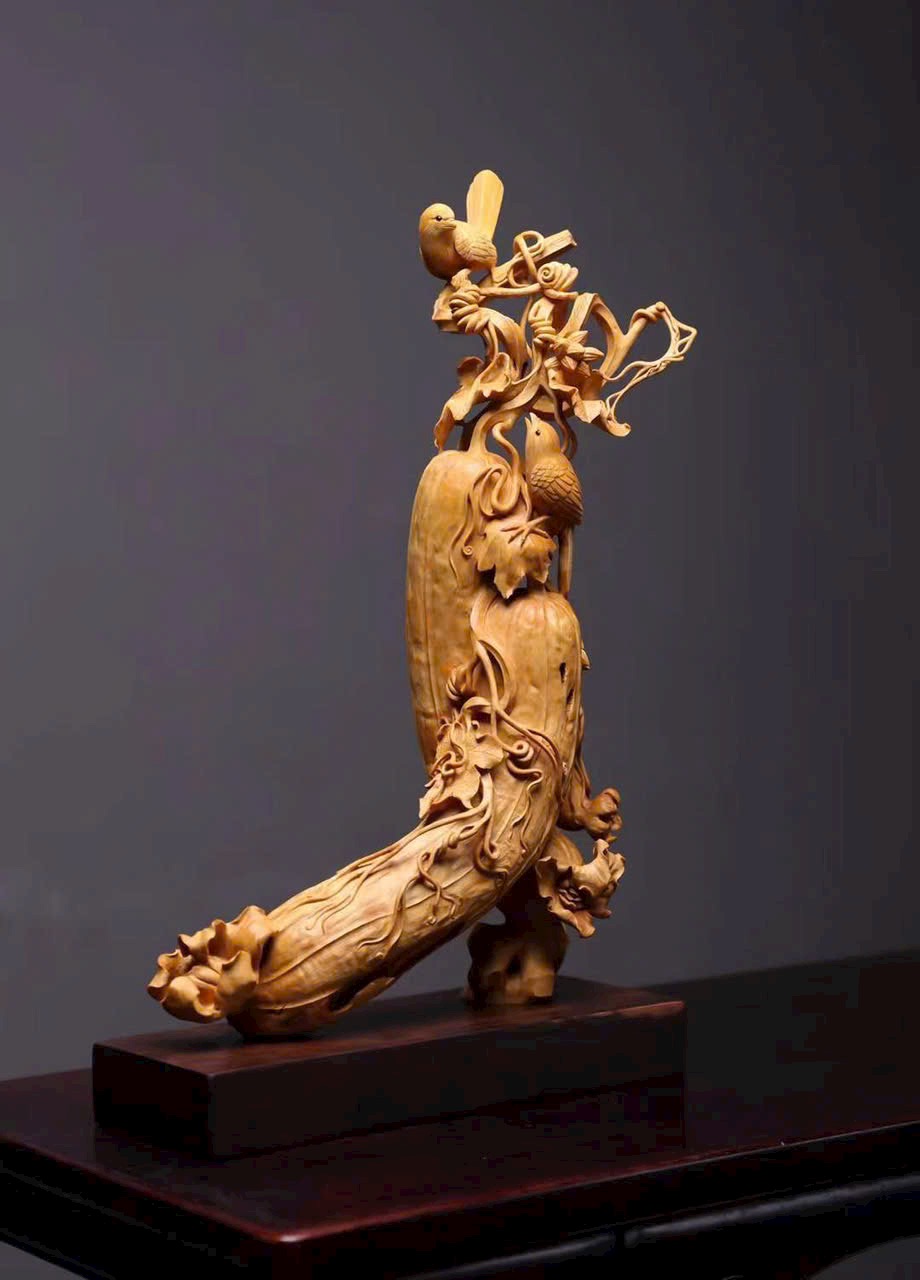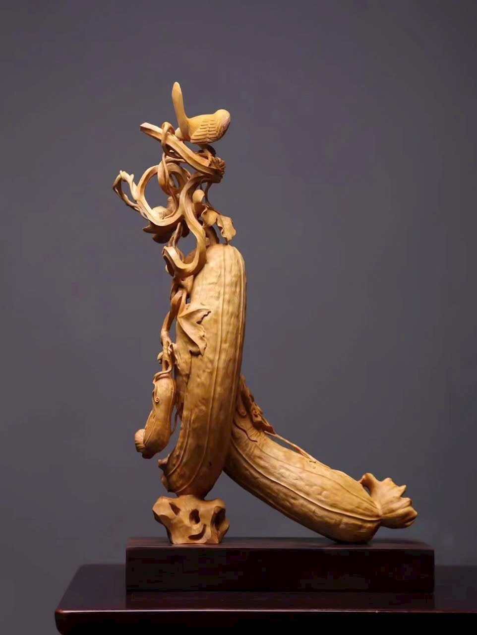 Hình dáng mướp sống động chân thực, dây leo quấn quanh, lá tỏa ra tự nhiên; đường nét uyển chuyển, chi tiết tinh tế với gân lá rõ ràng, khía quả nổi bật, tất cả hiện rõ mồn một, tựa như bức tranh đồng quê lập thể. Tác phẩm toát lên ý thú tự nhiên và vẻ đẹp của nghệ thuật điêu khắc.
