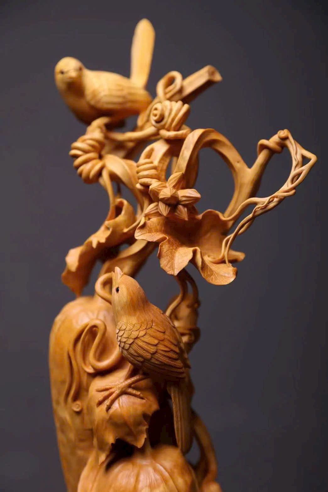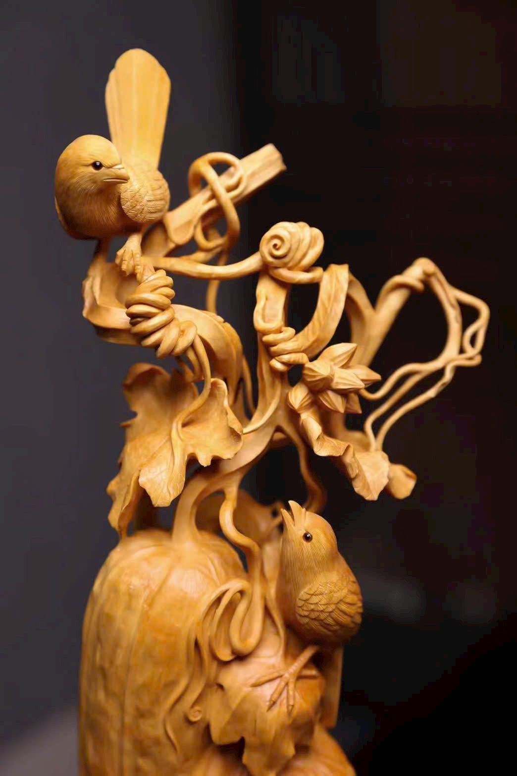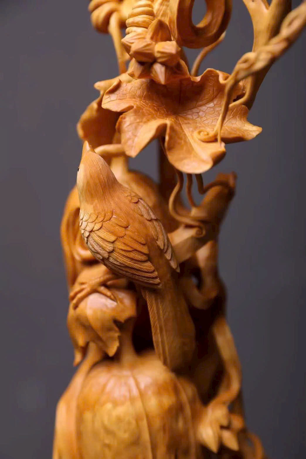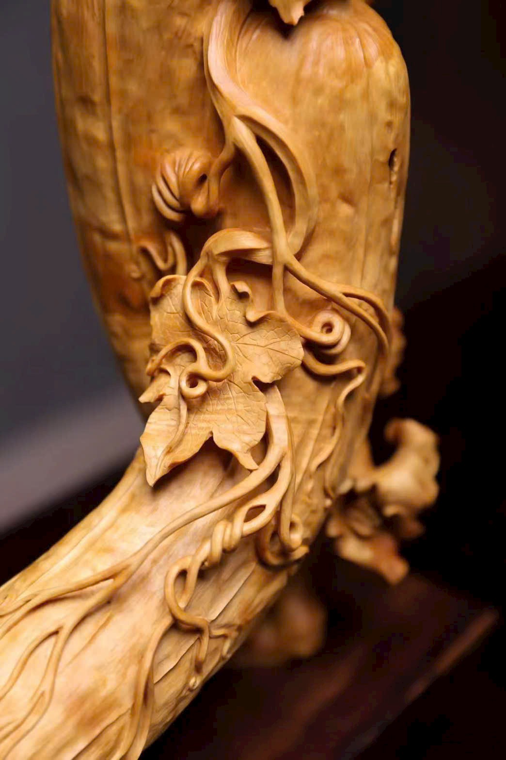 Hình dáng mướp sống động chân thực, dây leo quấn quanh, lá tỏa ra tự nhiên; đường nét uyển chuyển, chi tiết tinh tế với gân lá rõ ràng, khía quả nổi bật, tất cả hiện rõ mồn một, tựa như bức tranh đồng quê lập thể. Tác phẩm toát lên ý thú tự nhiên và vẻ đẹp của nghệ thuật điêu khắc.