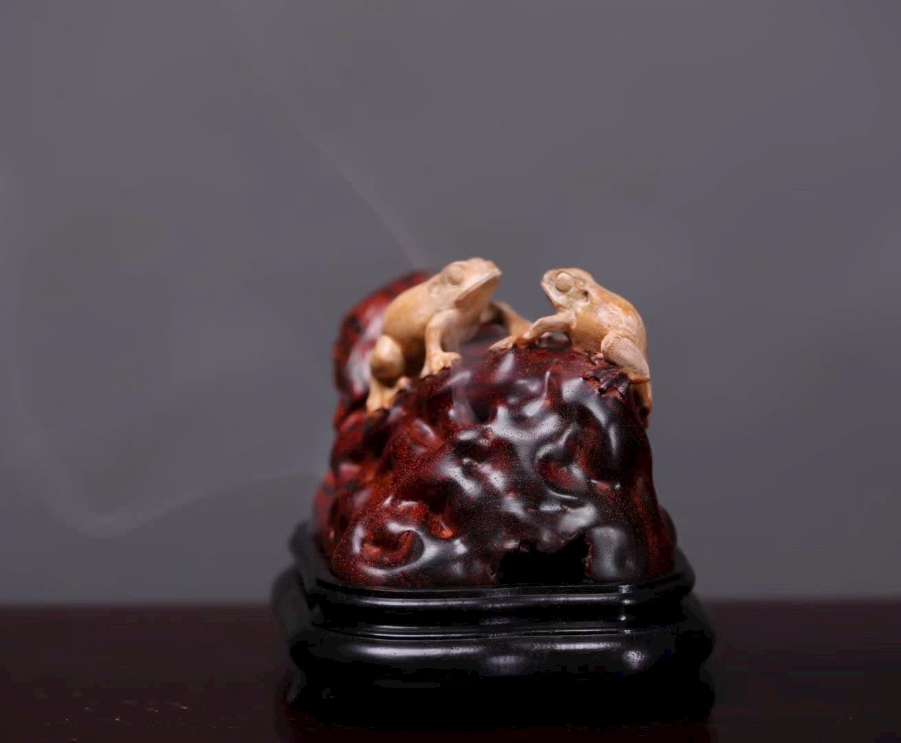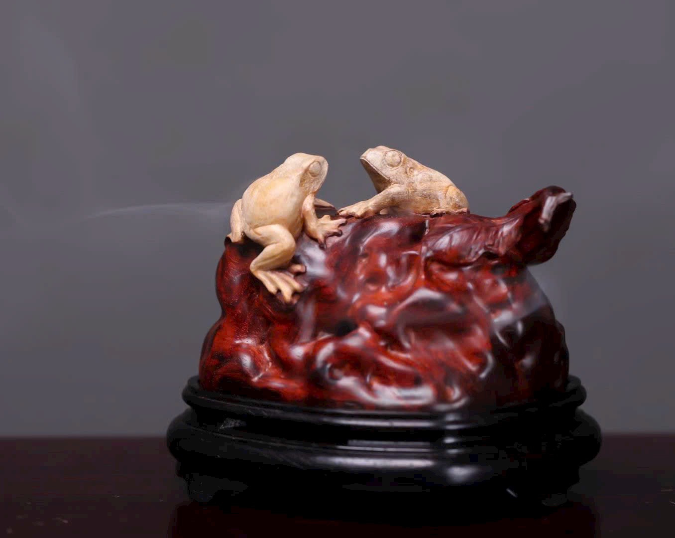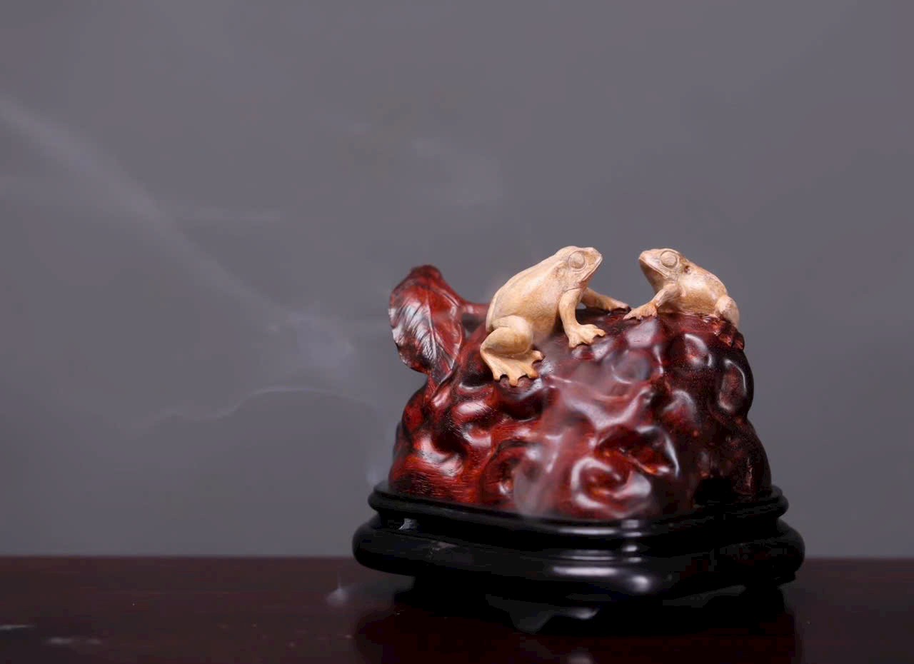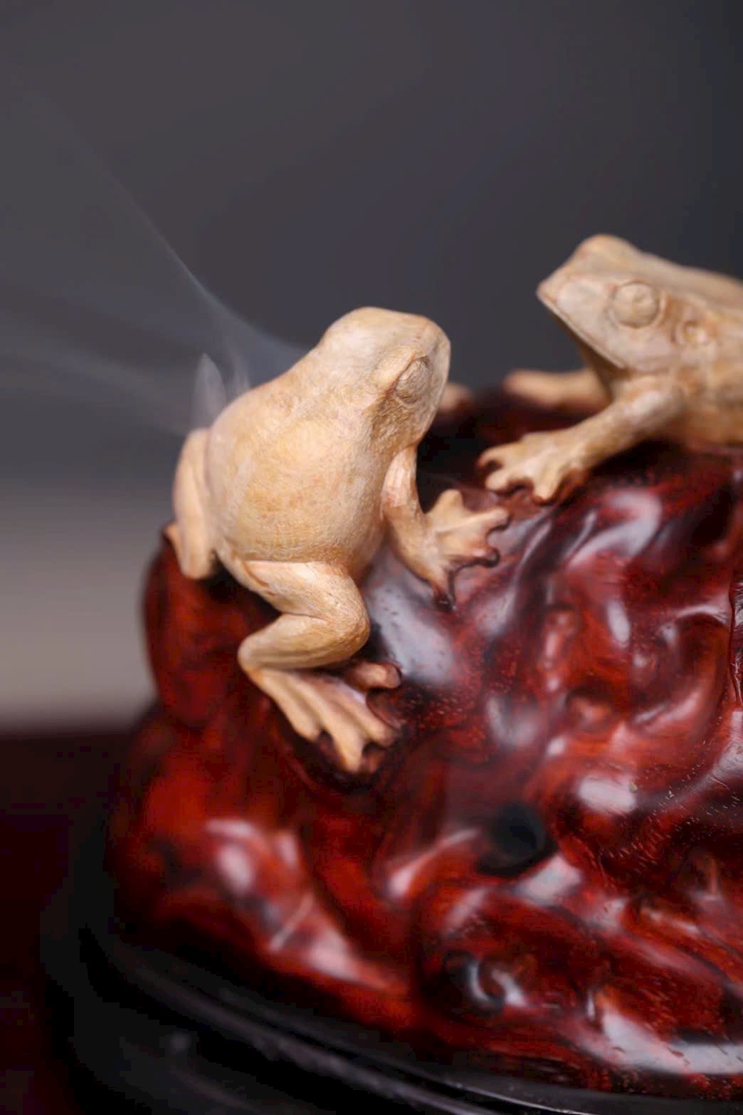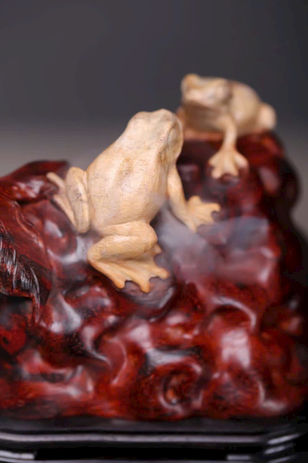 Hai chú ếch với thần thái sinh động, an tĩnh đối diện nhau, giữa làn khói sương bảng lảng tạo nên một tiểu cảnh thiên nhiên tĩnh lặng mà đầy sức sống. Tác phẩm kết hợp tinh xảo giữa nghệ thuật điêu khắc gỗ và ý境 tao nhã, toát lên vẻ phong nhã đậm chất Trung Hoa.