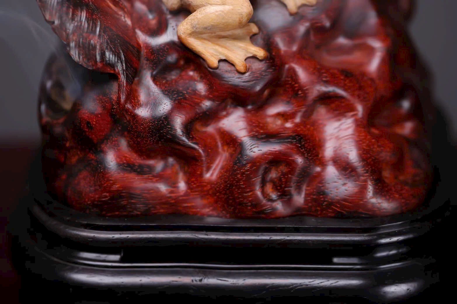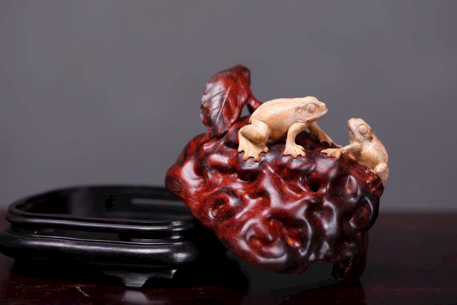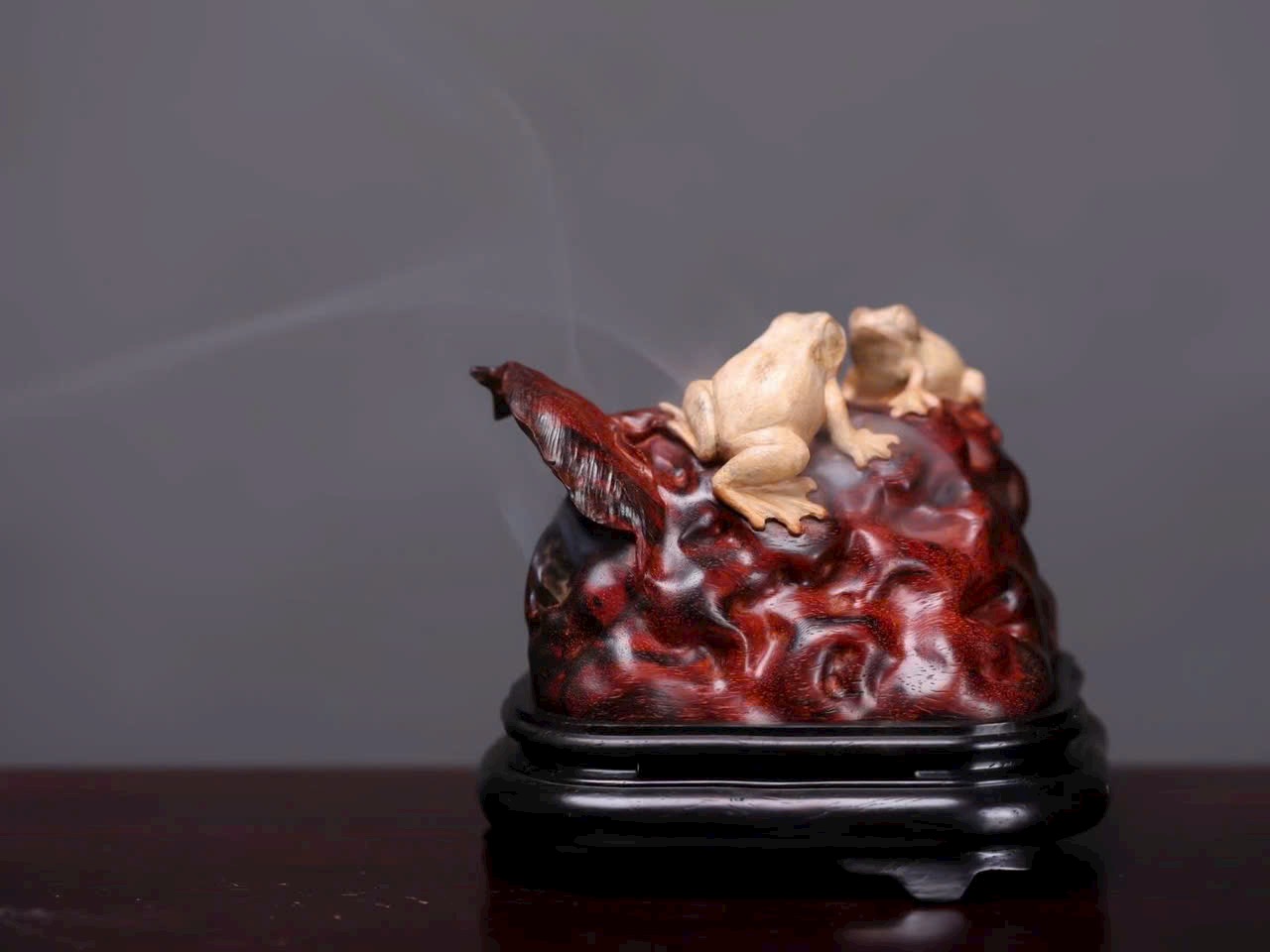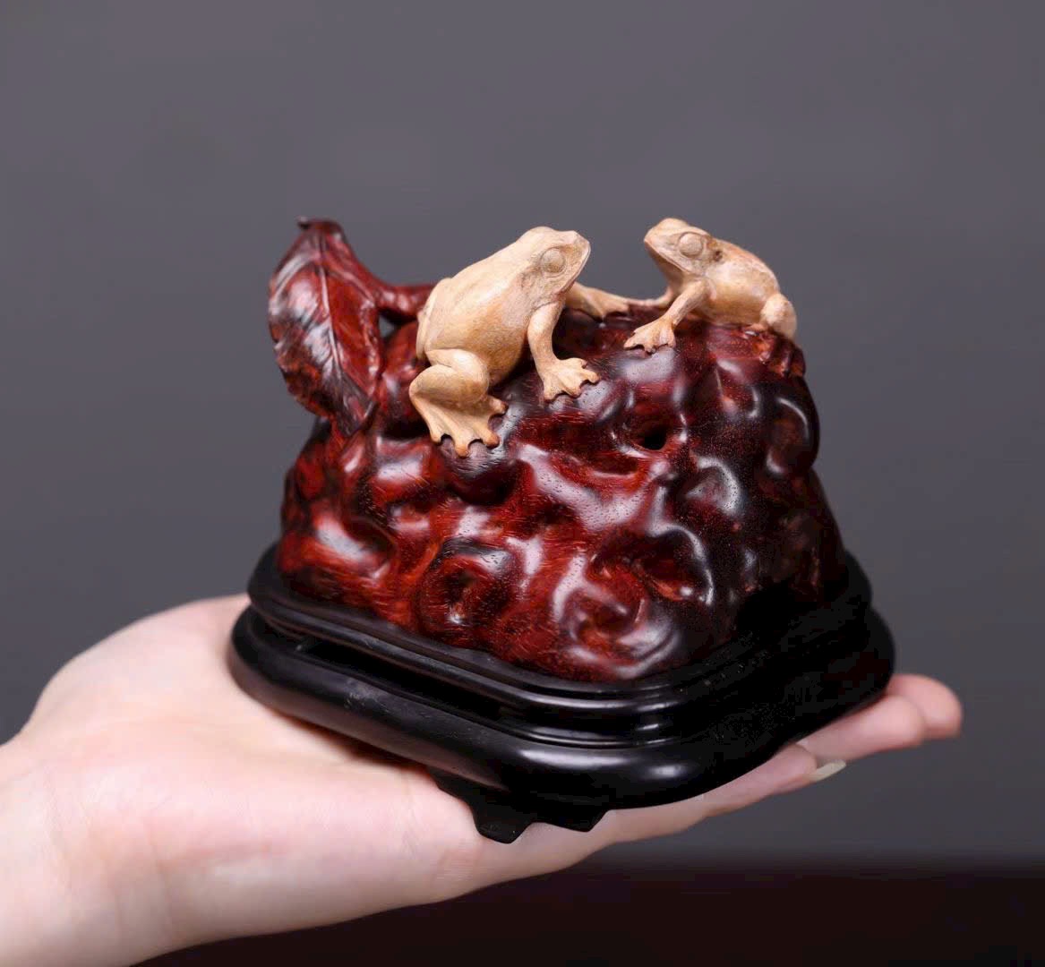 Hai chú ếch với thần thái sinh động, an tĩnh đối diện nhau, giữa làn khói sương bảng lảng tạo nên một tiểu cảnh thiên nhiên tĩnh lặng mà đầy sức sống. Tác phẩm kết hợp tinh xảo giữa nghệ thuật điêu khắc gỗ và ý境 tao nhã, toát lên vẻ phong nhã đậm chất Trung Hoa.