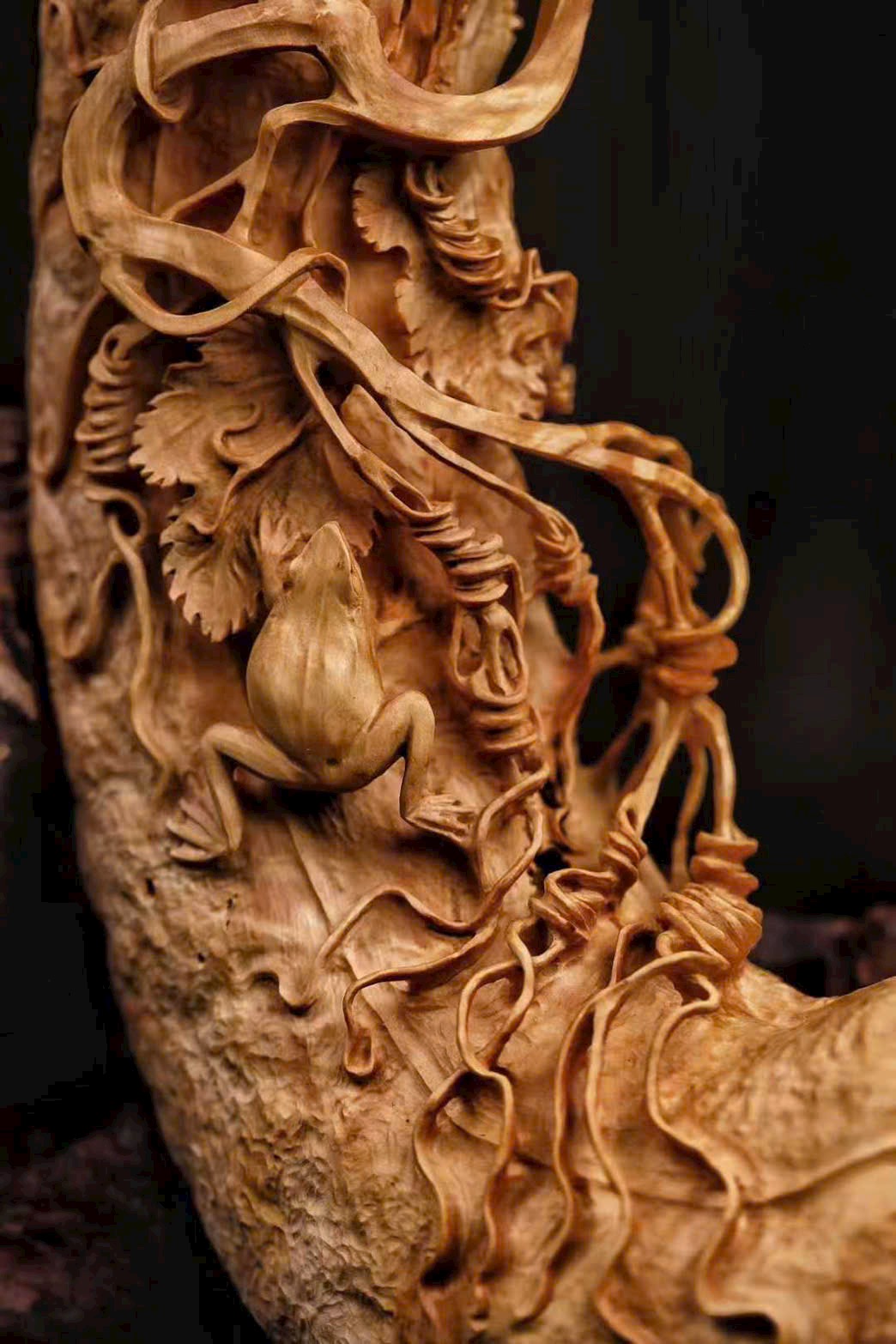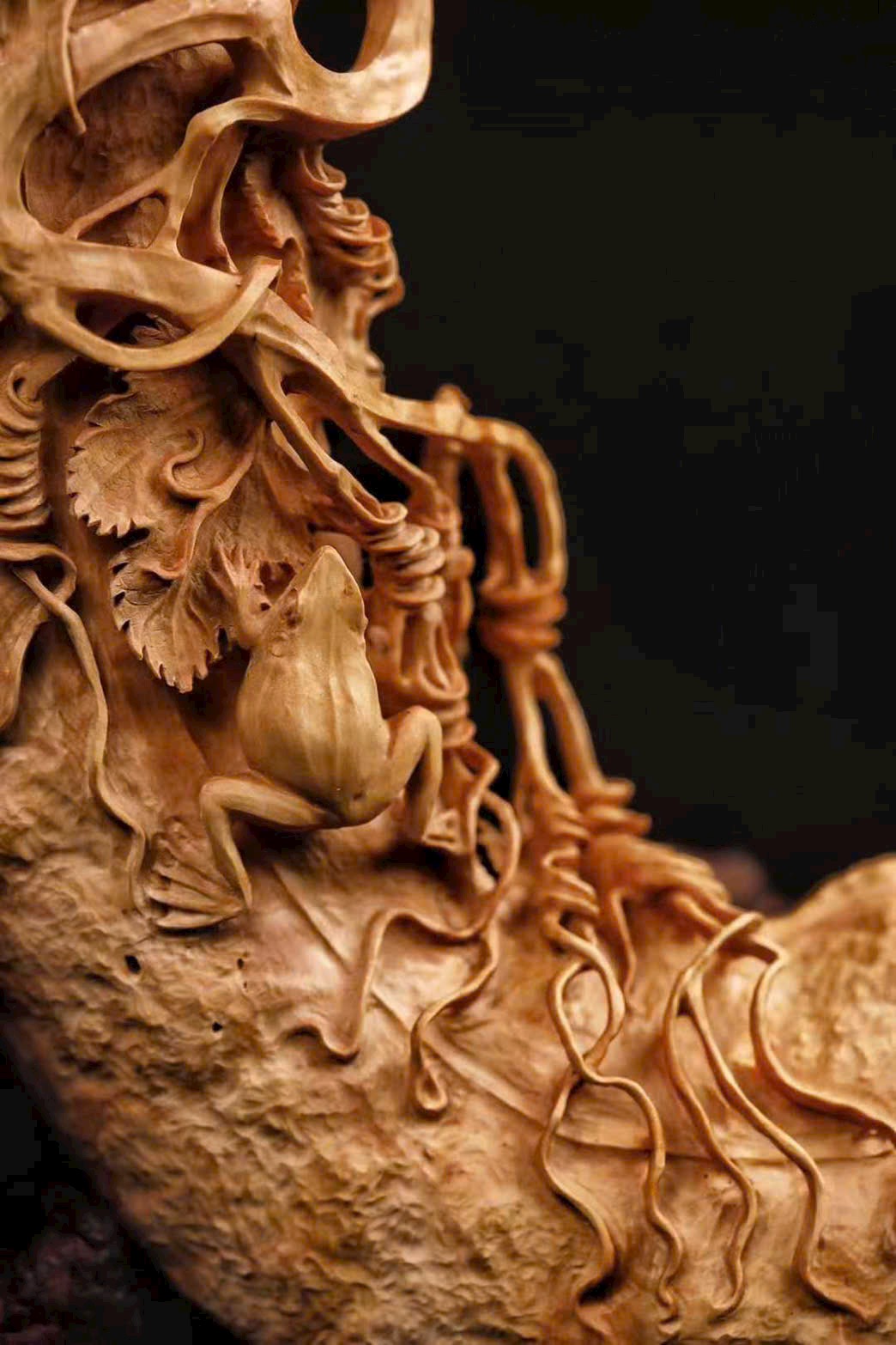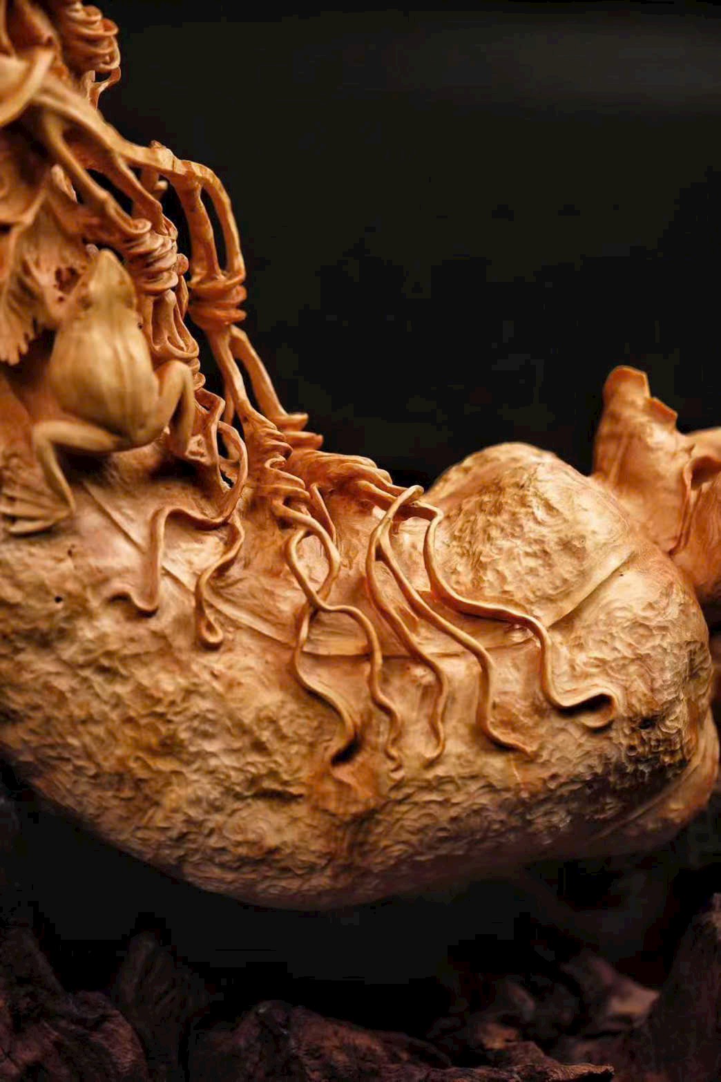 Tác phẩm chạm một khối gỗ, kết hợp điêu khắc rỗng tinh xảo. Đường nét tỉ mỉ nhưng tự nhiên, không hề lộ “mùi” kỹ xảo. Quả mướp trĩu nặng bày ngang đầy đặn, chú ếch leo nhảy càng làm tăng thêm sức sống, toát lên vẻ thanh thú vị của thiên nhiên.