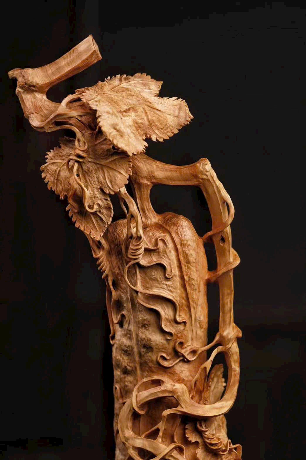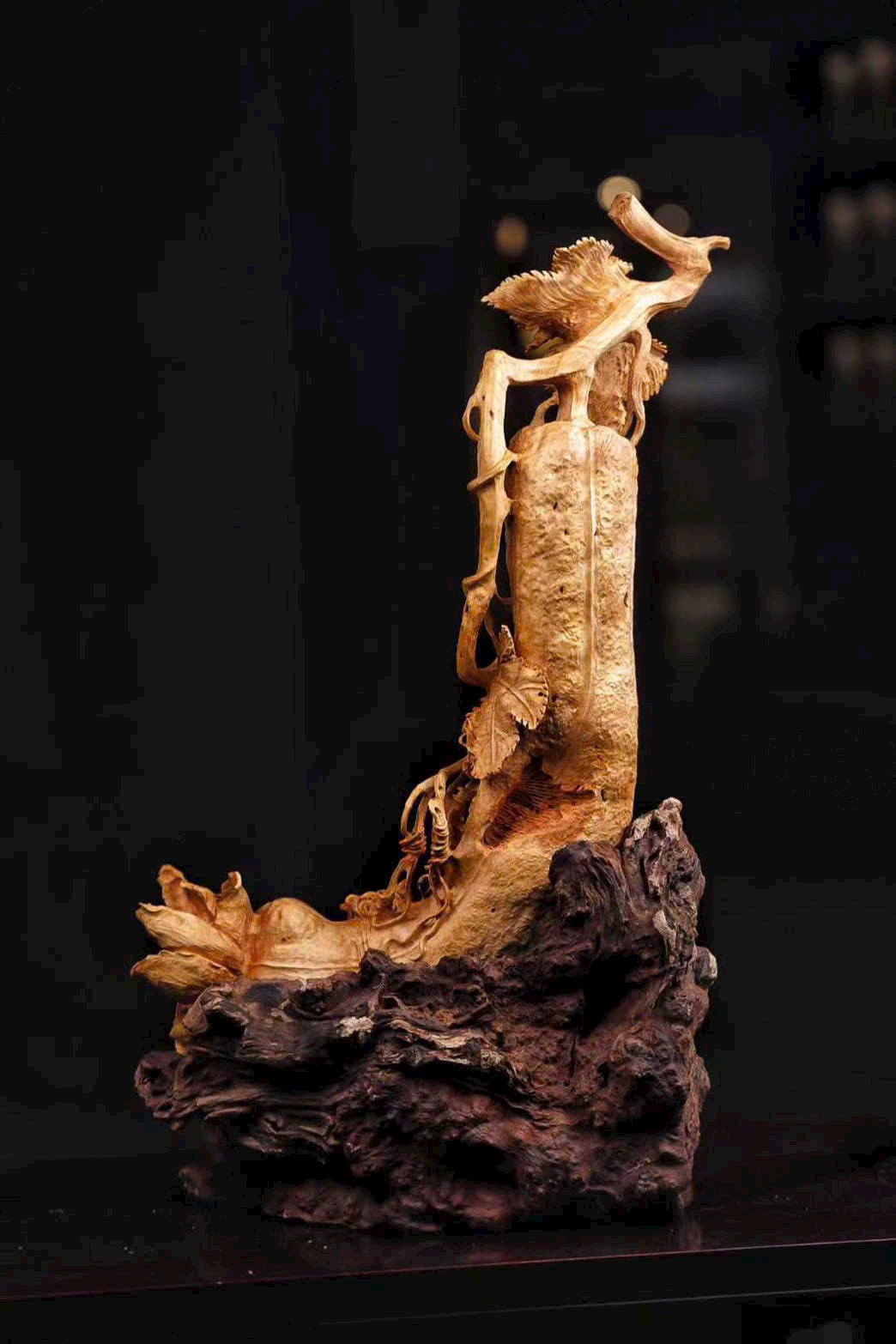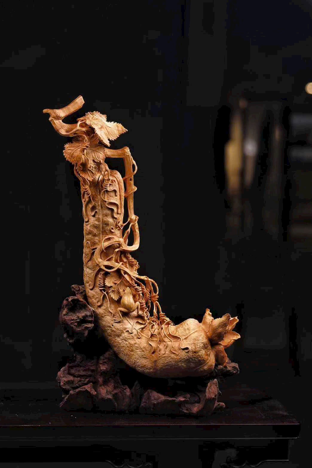 Tác phẩm chạm một khối gỗ, kết hợp điêu khắc rỗng tinh xảo. Đường nét tỉ mỉ nhưng tự nhiên, không hề lộ “mùi” kỹ xảo. Quả mướp trĩu nặng bày ngang đầy đặn, chú ếch leo nhảy càng làm tăng thêm sức sống, toát lên vẻ thanh thú vị của thiên nhiên.