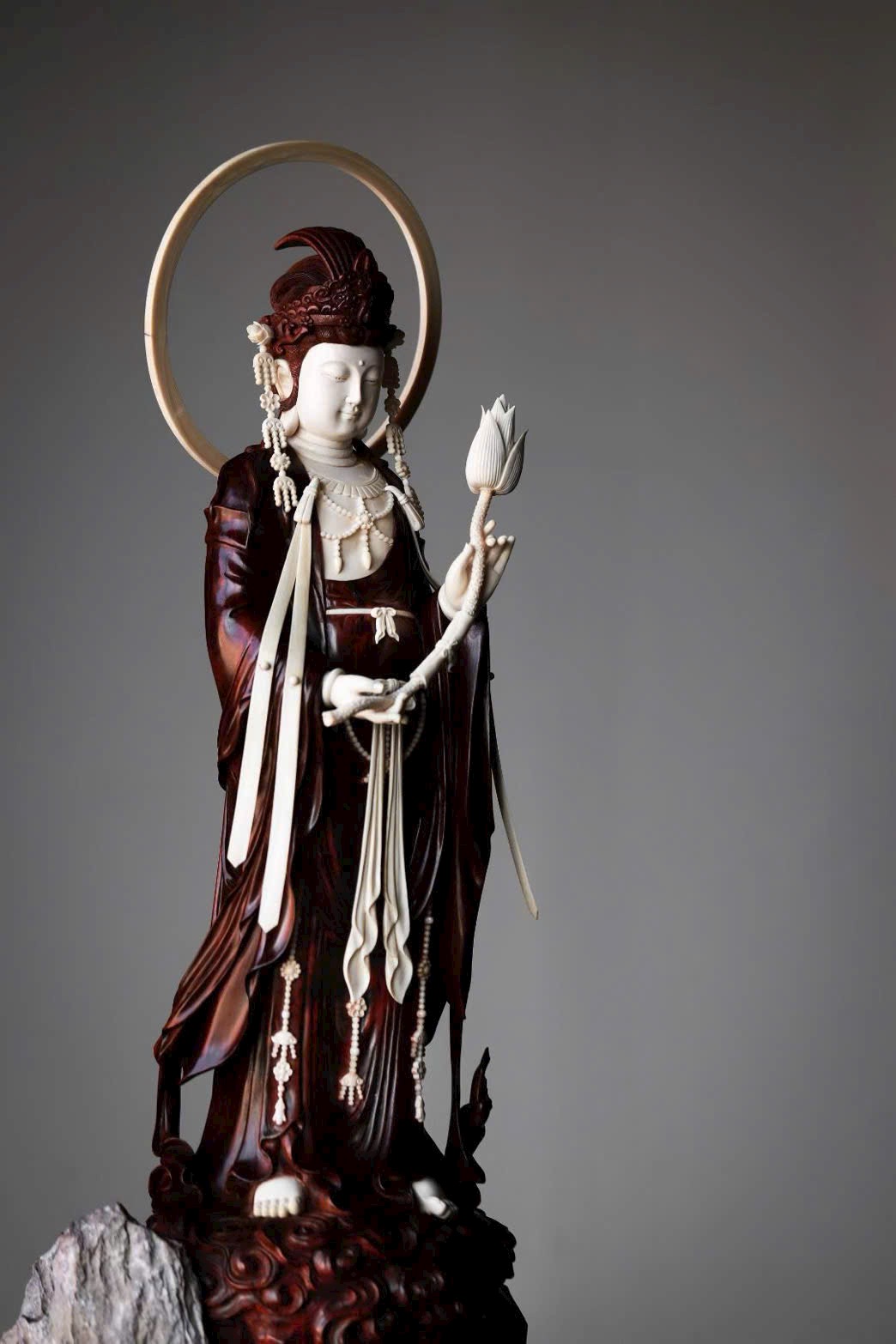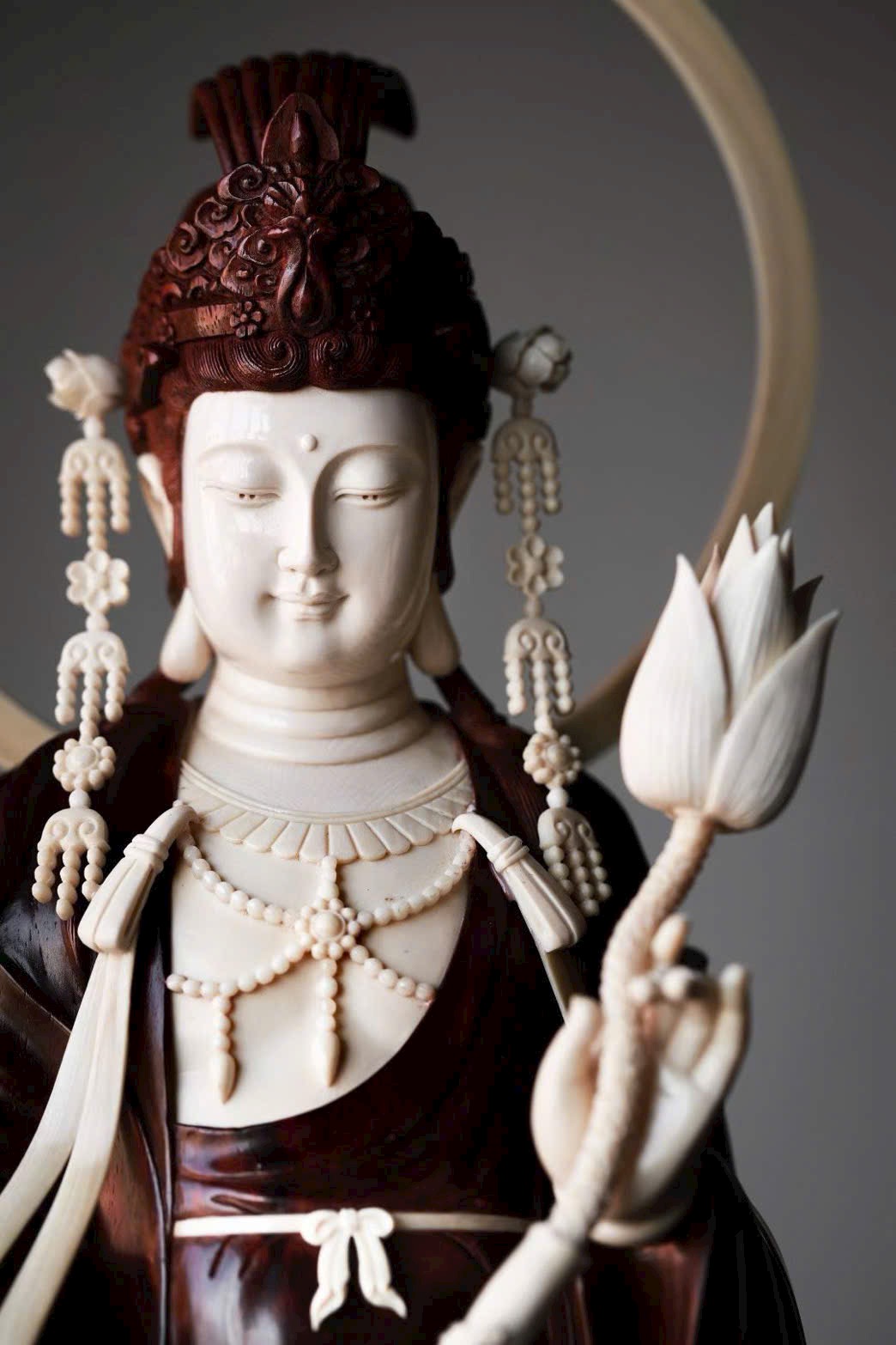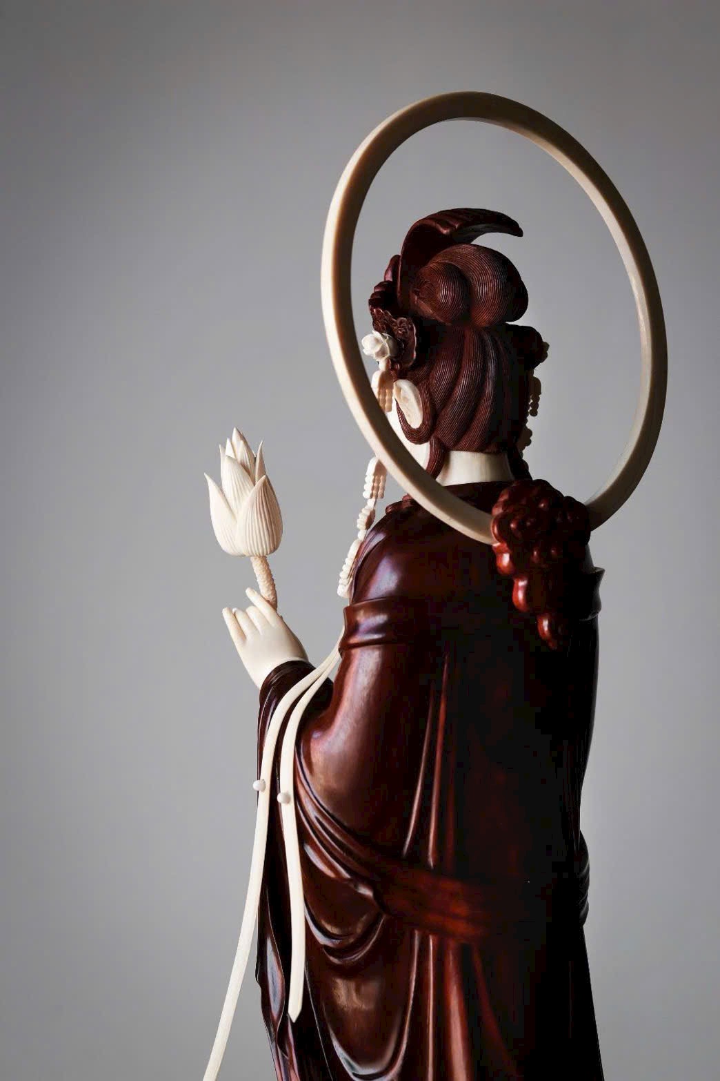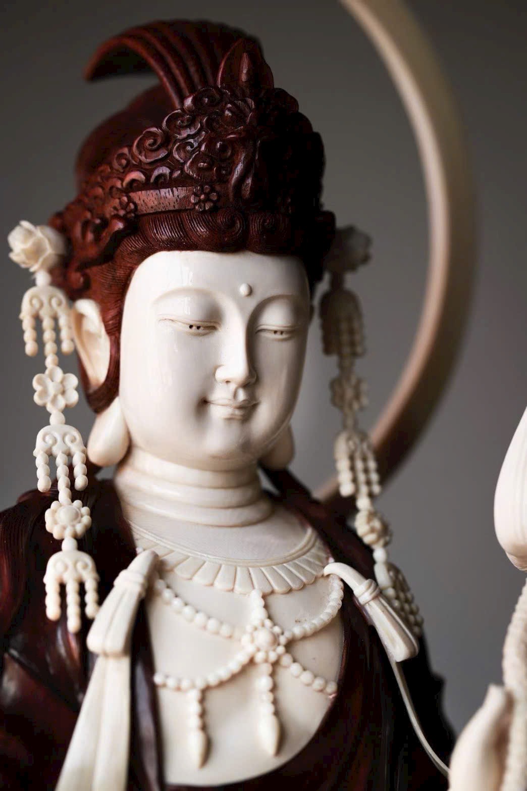 Tử đàn già năm tháng lên sắc trầm như mực, tôn lên tôn tượng Quan Âm được khảm từ ngà ma mút trắng trong như ngọc. Dải y phục theo gió buông nhẹ bên cành sen, đôi mi cụp xuống, đầu ngón tay khẽ nâng đóa hoa, dung mạo từ hòa tĩnh lặng. Đặt trên án thờ như đón ánh nguyệt quang rưới xuống, gột rửa bụi lòng, an tĩnh tâm ý.