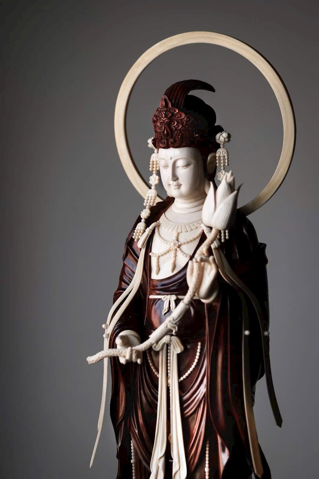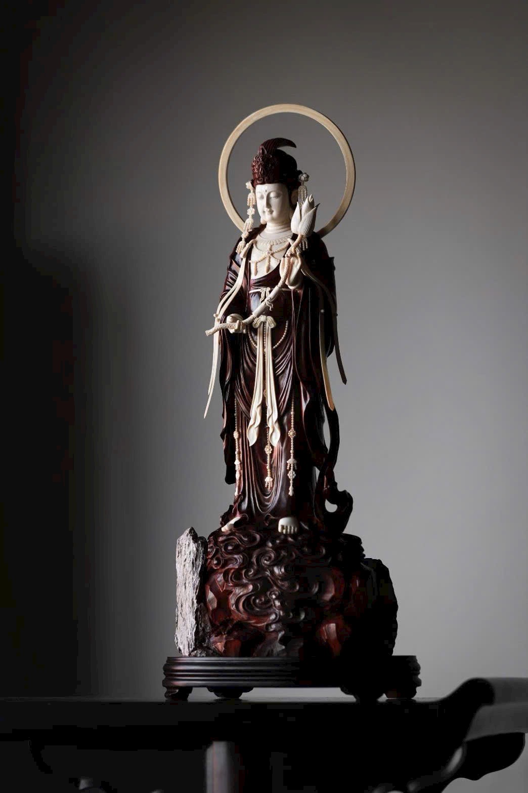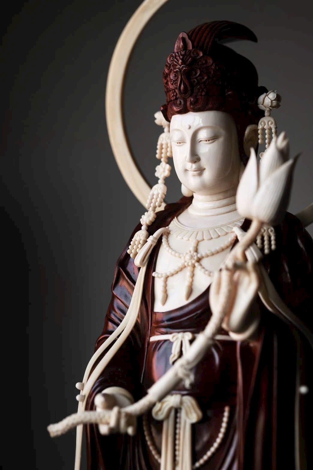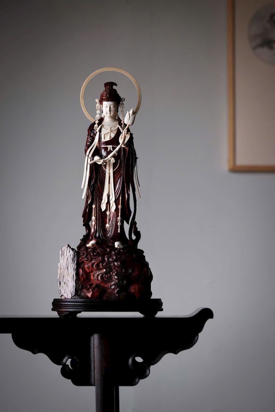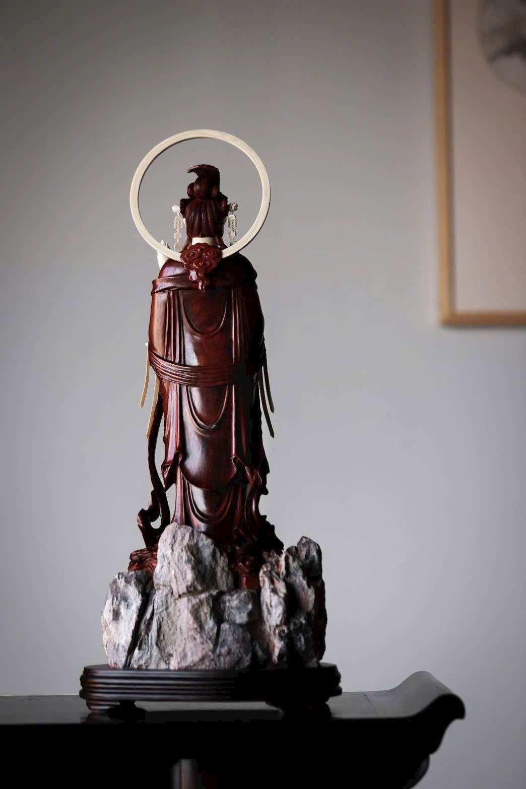 Tử đàn già năm tháng lên sắc trầm như mực, tôn lên tôn tượng Quan Âm được khảm từ ngà ma mút trắng trong như ngọc. Dải y phục theo gió buông nhẹ bên cành sen, đôi mi cụp xuống, đầu ngón tay khẽ nâng đóa hoa, dung mạo từ hòa tĩnh lặng. Đặt trên án thờ như đón ánh nguyệt quang rưới xuống, gột rửa bụi lòng, an tĩnh tâm ý.