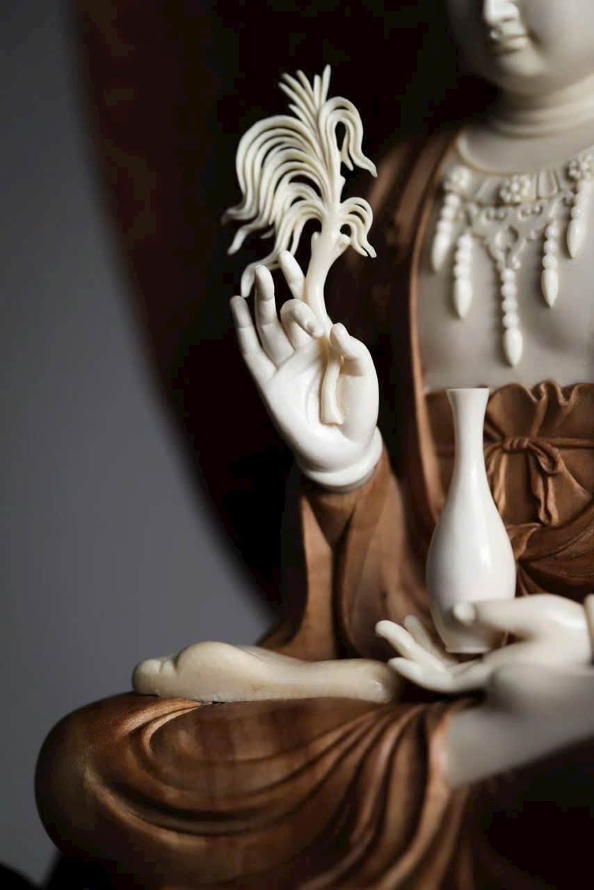 Tượng Quan Âm cúi mắt cầm hoa sen, tà áo buông nhẹ tỏa ánh dịu dàng.