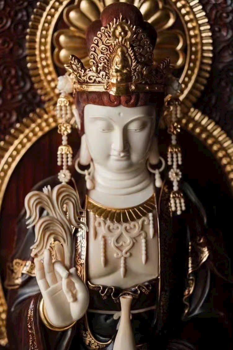 Dải y mềm rủ theo gió, tay nhẹ nâng cành sen, đôi mắt khẽ cúi, ánh nhìn tĩnh tại, đầu ngón tay khẽ vê một đóa hoa. Đặt trên án thờ như được tắm trong ánh trăng, giúp gột sạch bụi trần, an tịnh tâm ý.