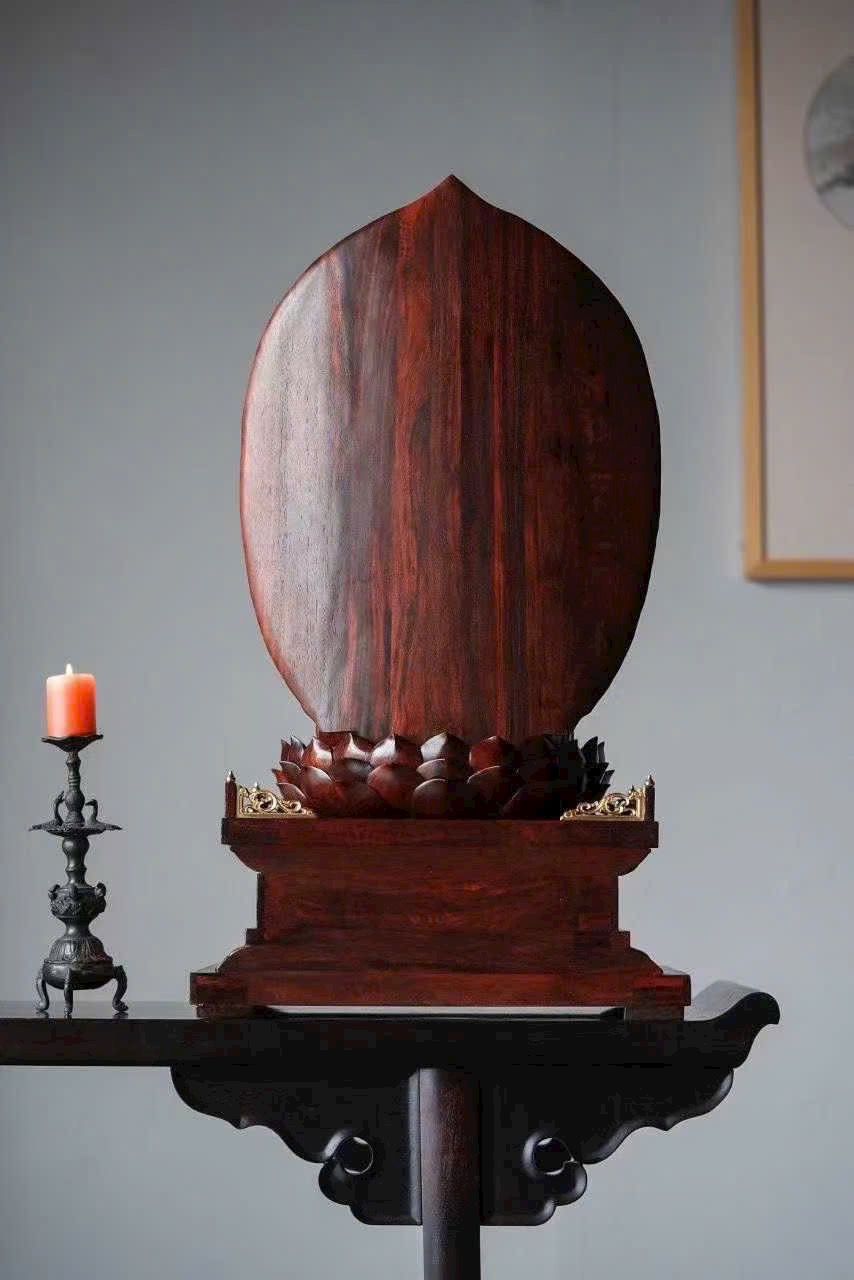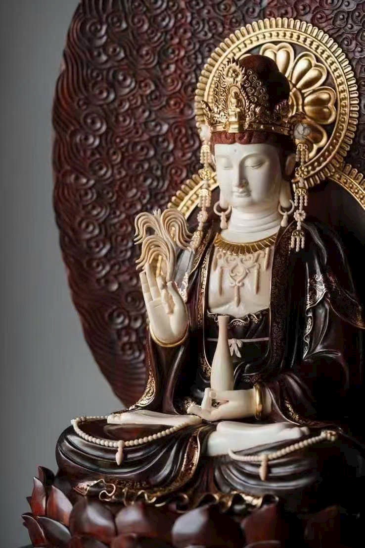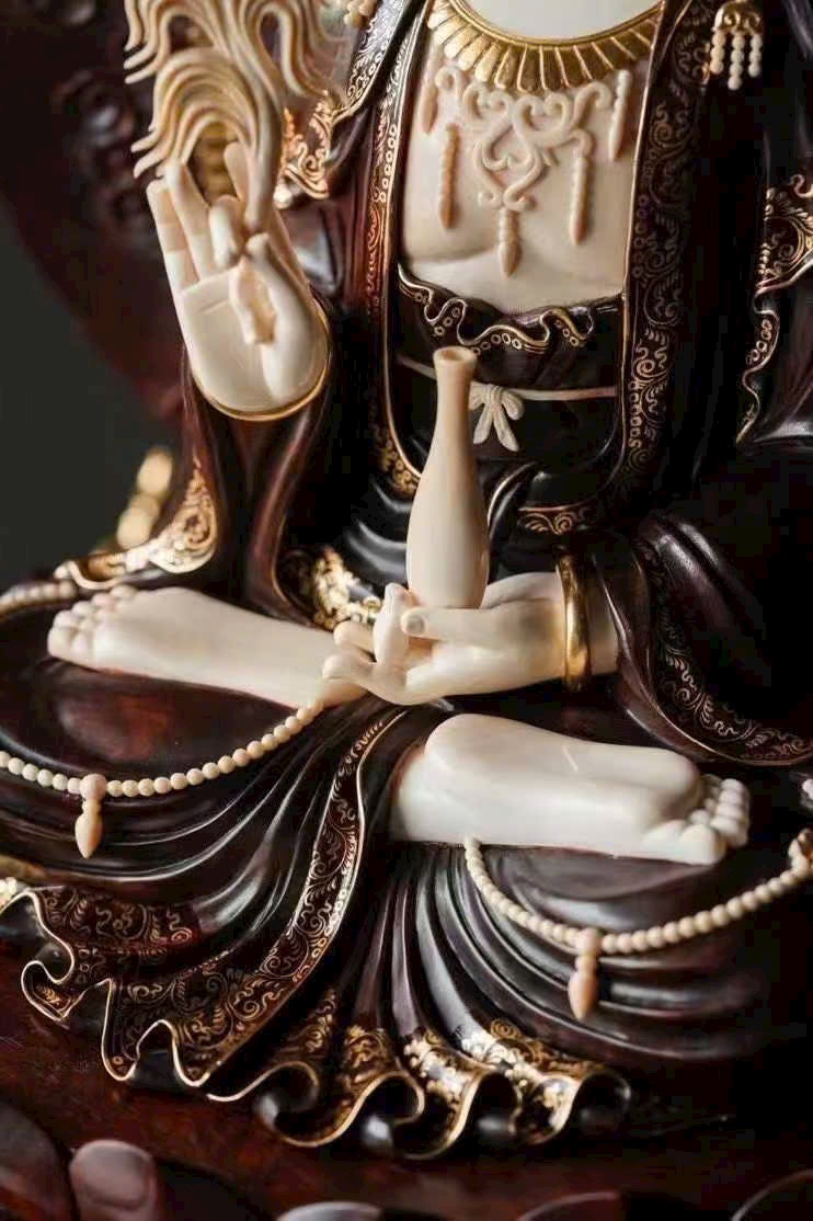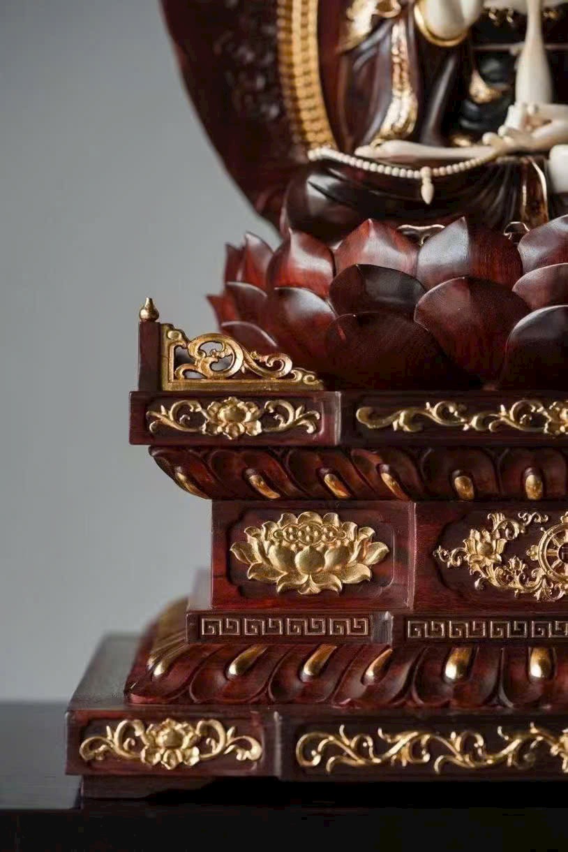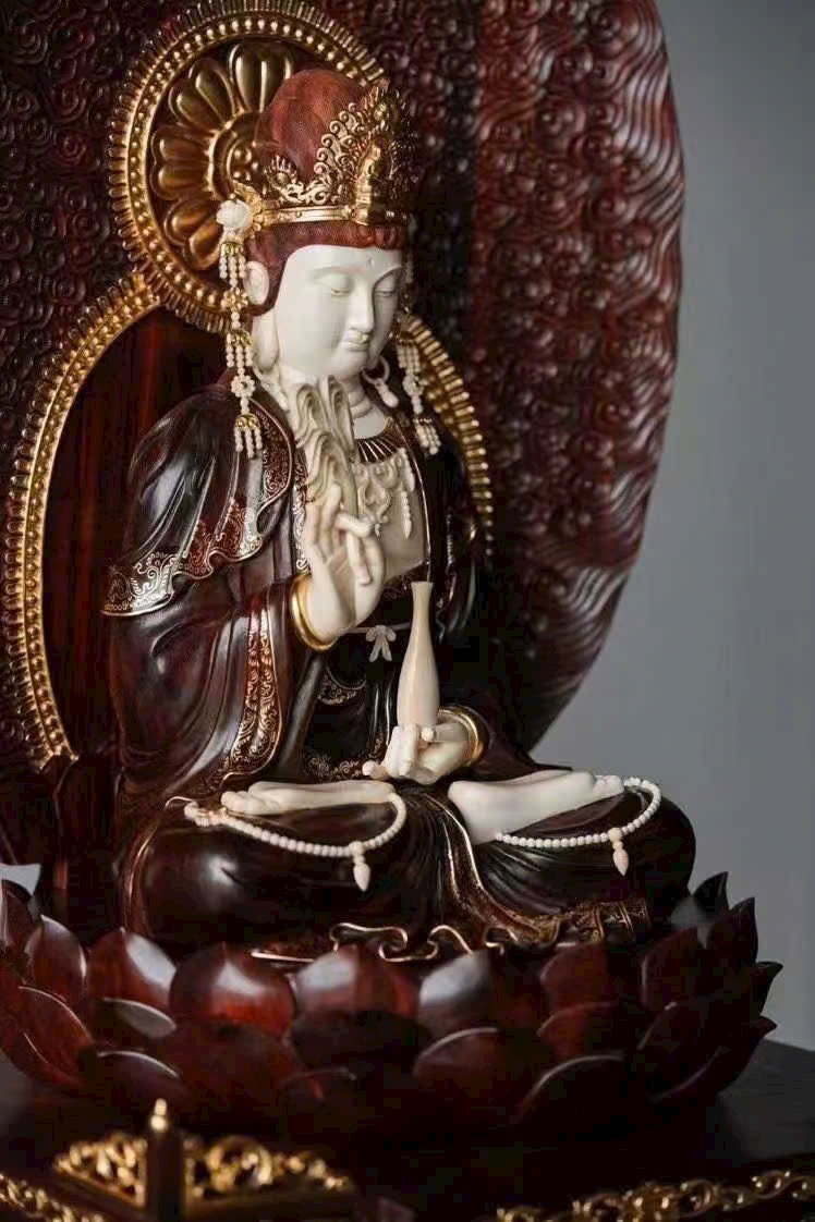 Tử đàn lão liệu trầm ấm, sắc sẫm như mực. Pháp tướng Quan Âm được khảm từ chất liệu mãnh mút trắng sạch như ngọc.