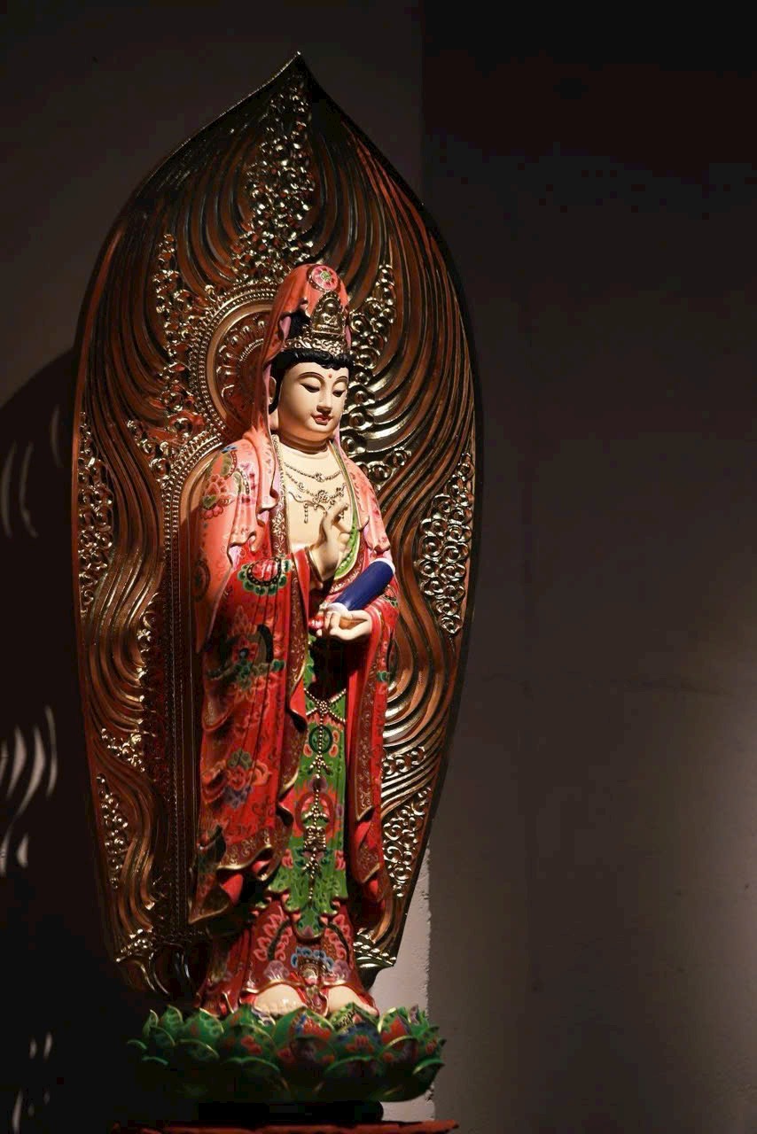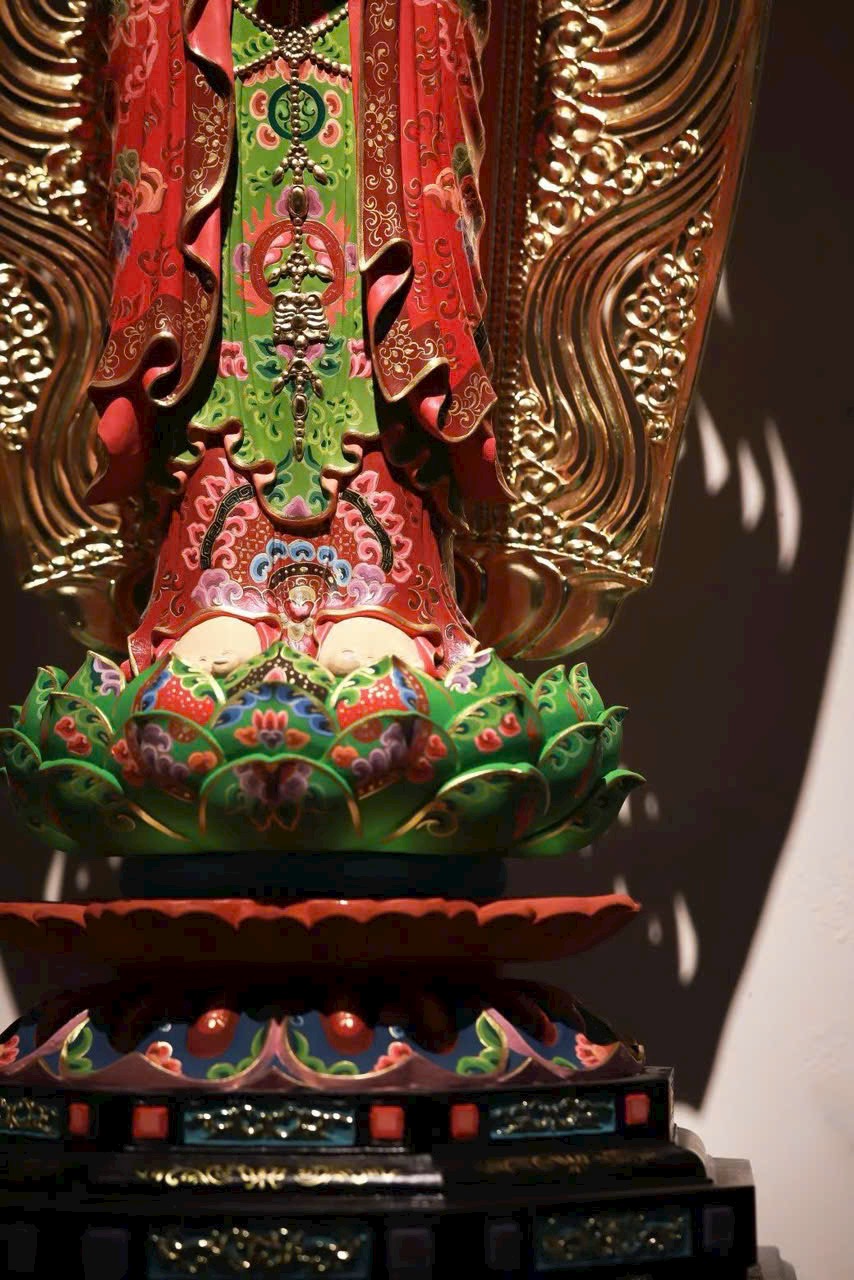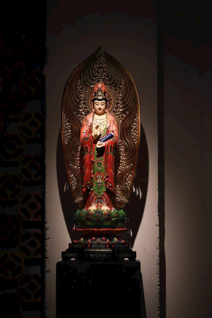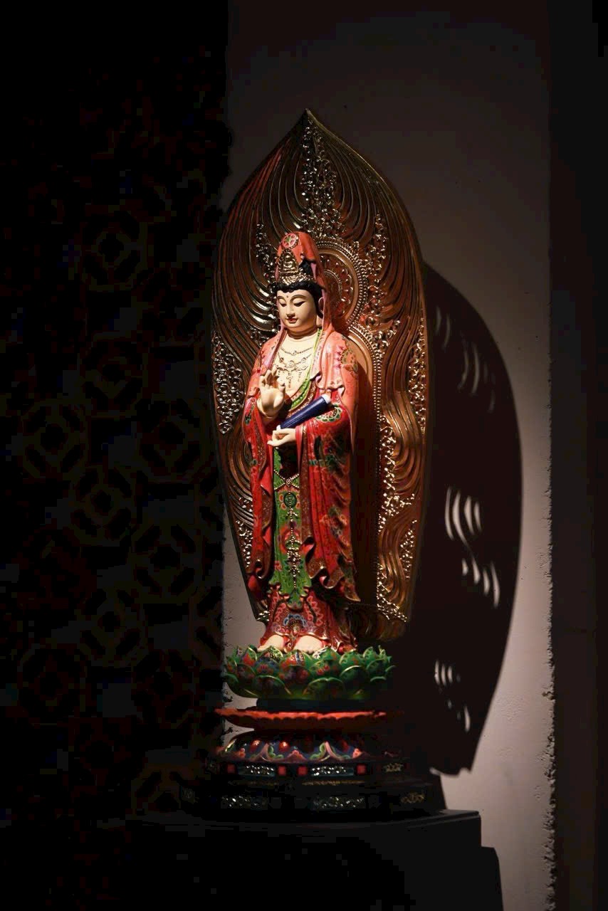 Thớ gỗ ẩn hiện ánh báu, pháp tướng từ bi mà trang nghiêm. Thiên y vẽ màu như mây trôi, đài sen nâng bước tỏa hương. Phụng thờ trong tịnh thất, như được tắm gội mưa pháp cam lồ, lặng ngắm mà sinh tự tại – Bồ-đề.