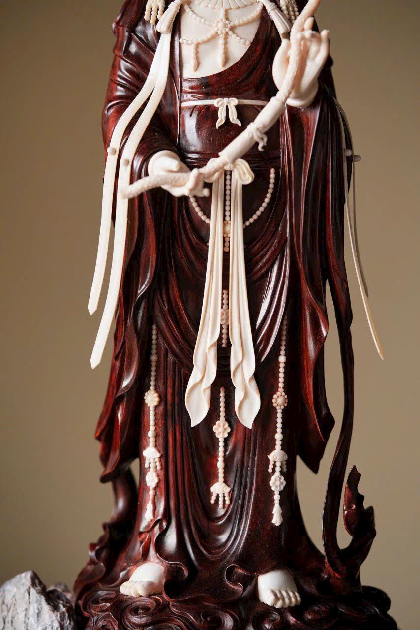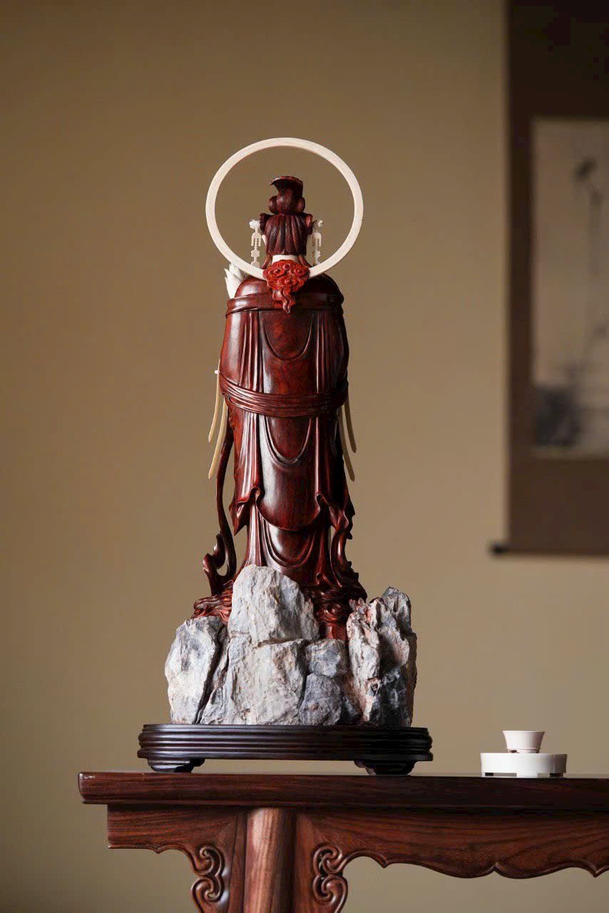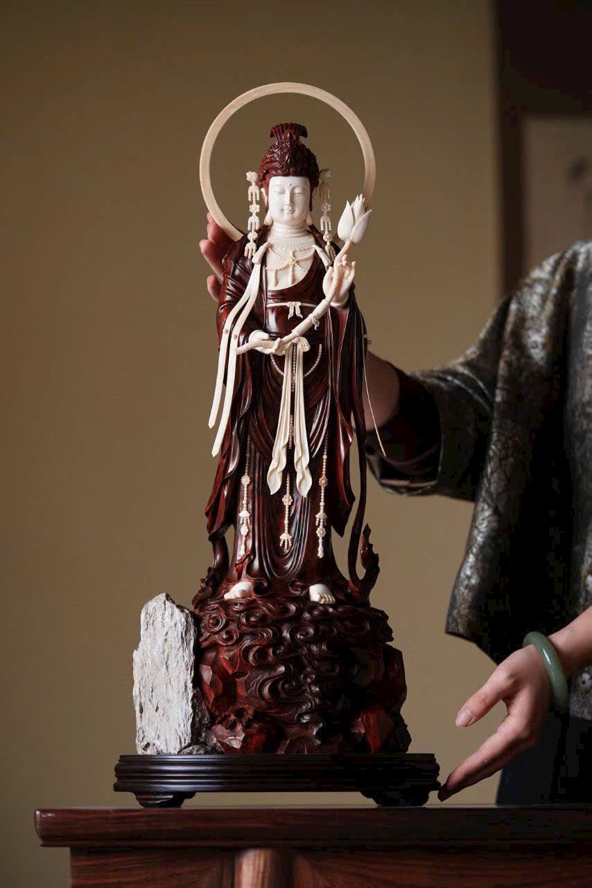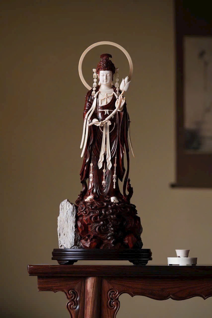 Tử đàn lão liệu thâm trầm, sắc gỗ mượt như mực tàu. Tượng Quan Âm được khảm ngà ma mút trắng ngọc, pháp tướng trang nghiêm mà thanh hòa. Y phục bay nhẹ như đón gió, rủ xuống cành sen; đôi mi khẽ hạ, ánh nhìn tĩnh lặng, đầu ngón tay khum nhẹ nâng đóa hoa. Đặt lên án thờ, ánh sắc dịu như nguyệt quang, khiến lòng người thanh tịnh, bụi trần lắng lại.
