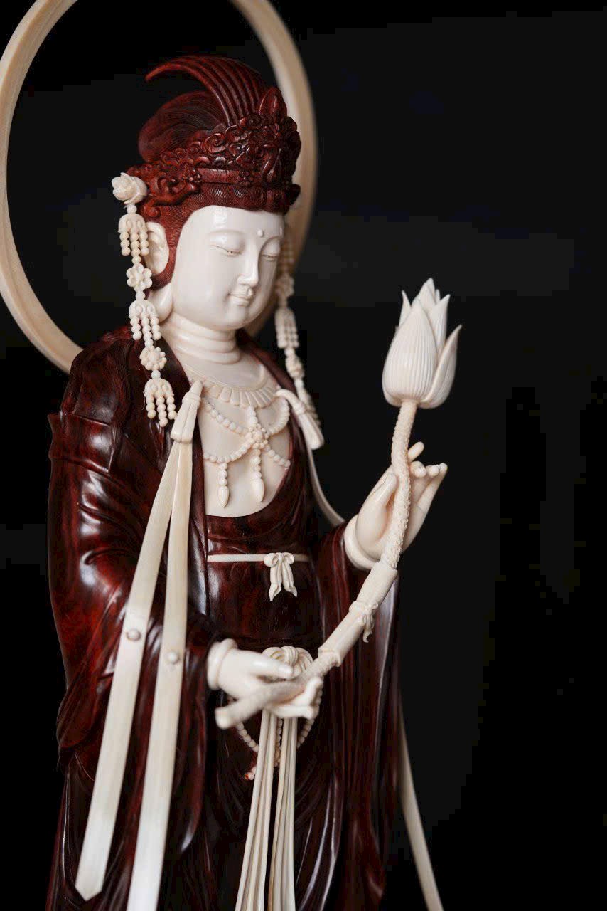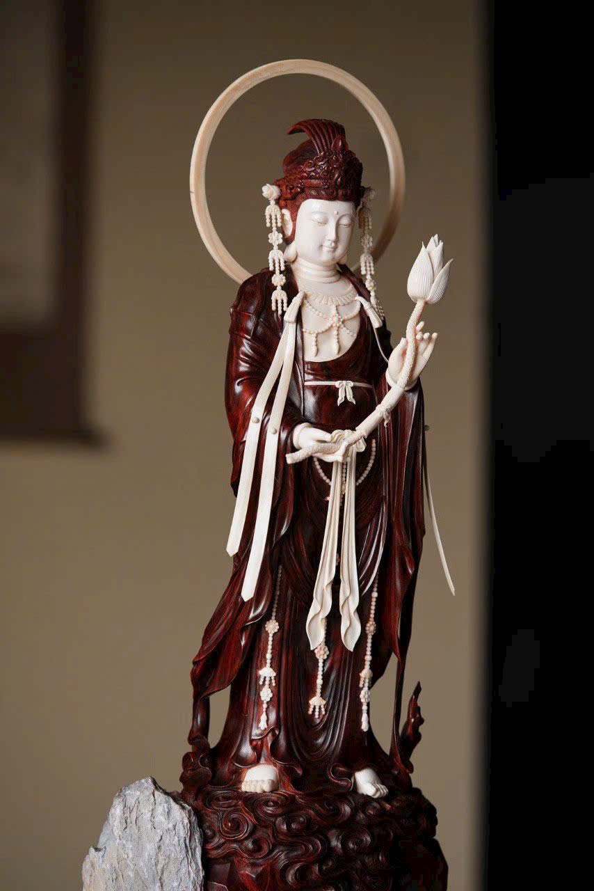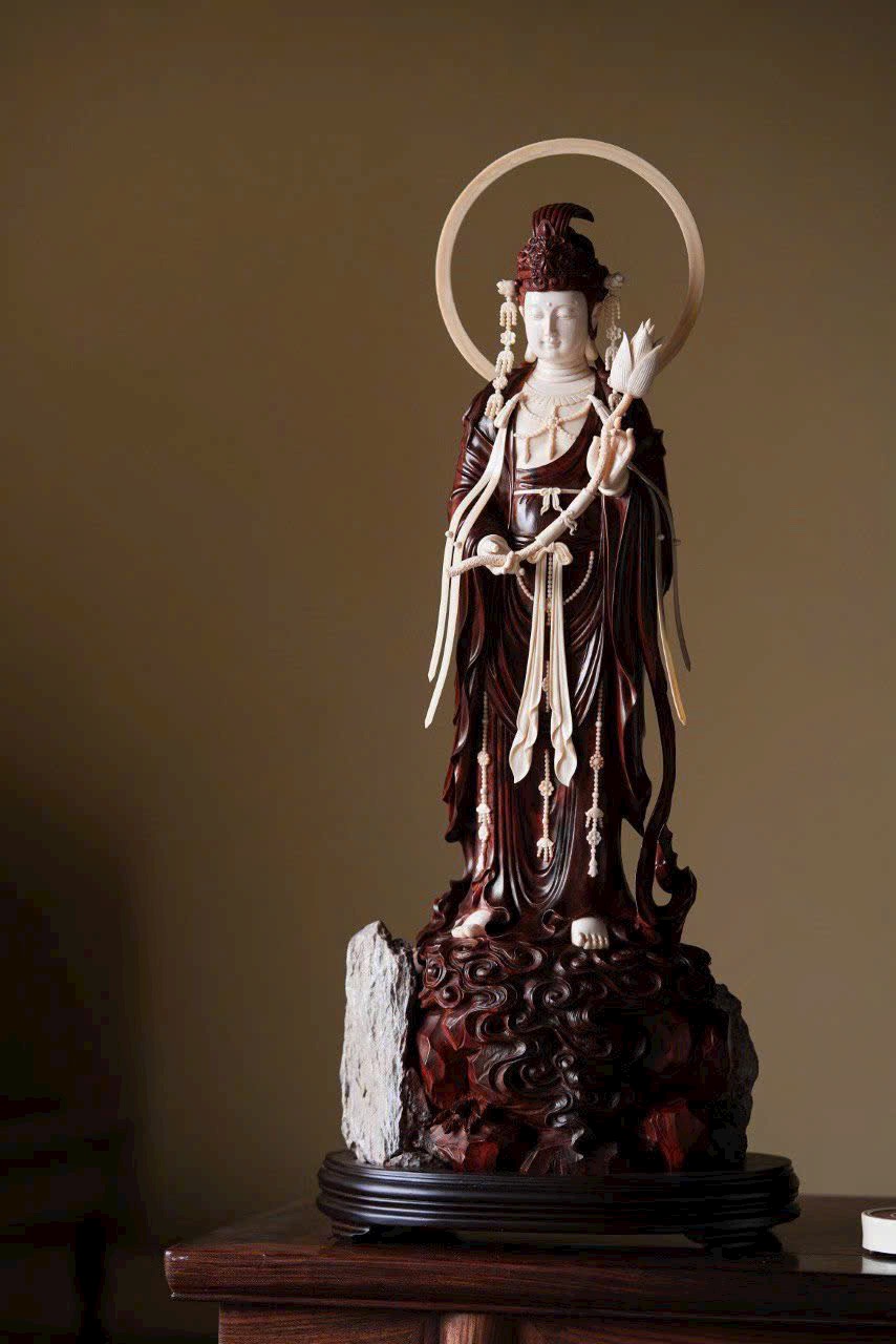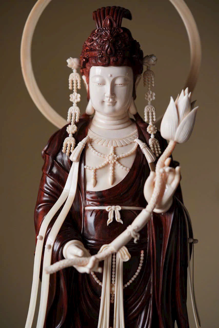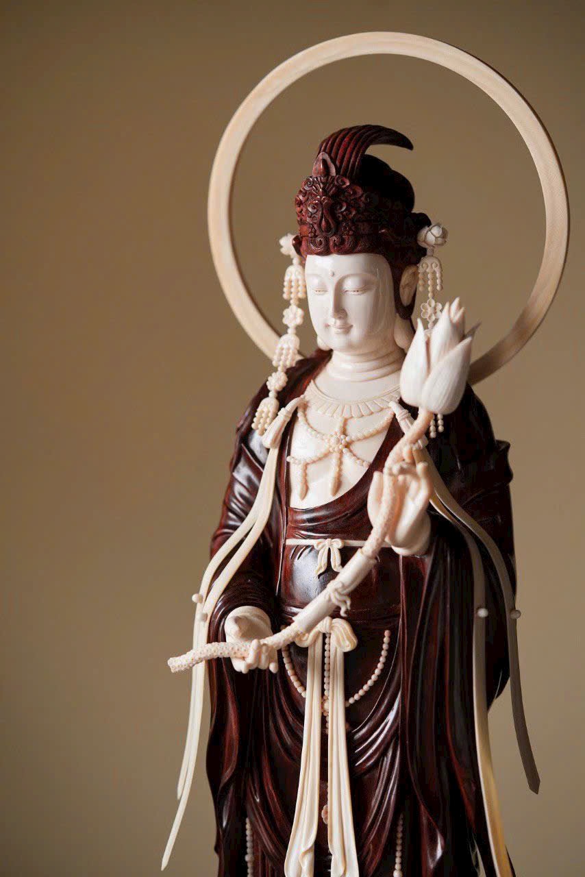 Tử đàn lão liệu thâm trầm, sắc gỗ mượt như mực tàu. Tượng Quan Âm được khảm ngà ma mút trắng ngọc, pháp tướng trang nghiêm mà thanh hòa. Y phục bay nhẹ như đón gió, rủ xuống cành sen; đôi mi khẽ hạ, ánh nhìn tĩnh lặng, đầu ngón tay khum nhẹ nâng đóa hoa. Đặt lên án thờ, ánh sắc dịu như nguyệt quang, khiến lòng người thanh tịnh, bụi trần lắng lại.