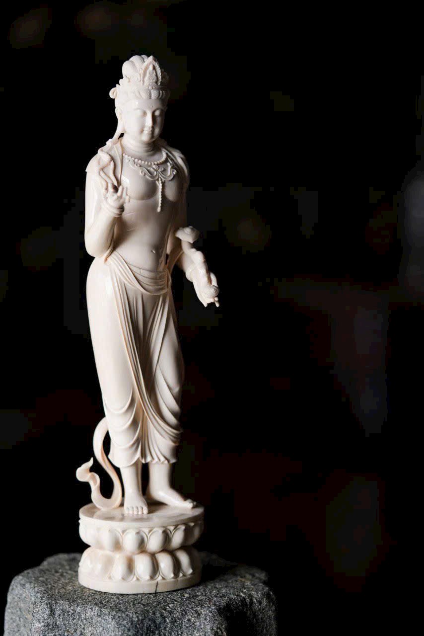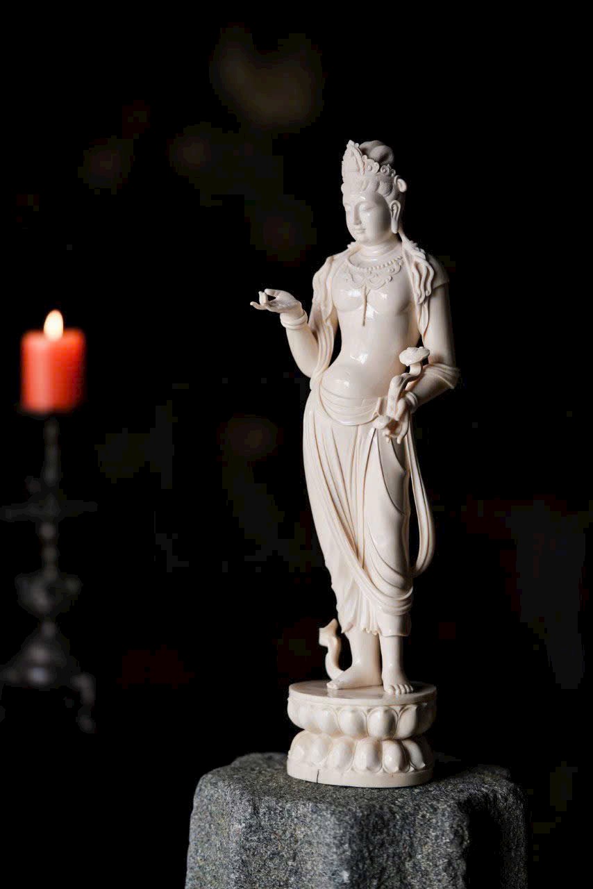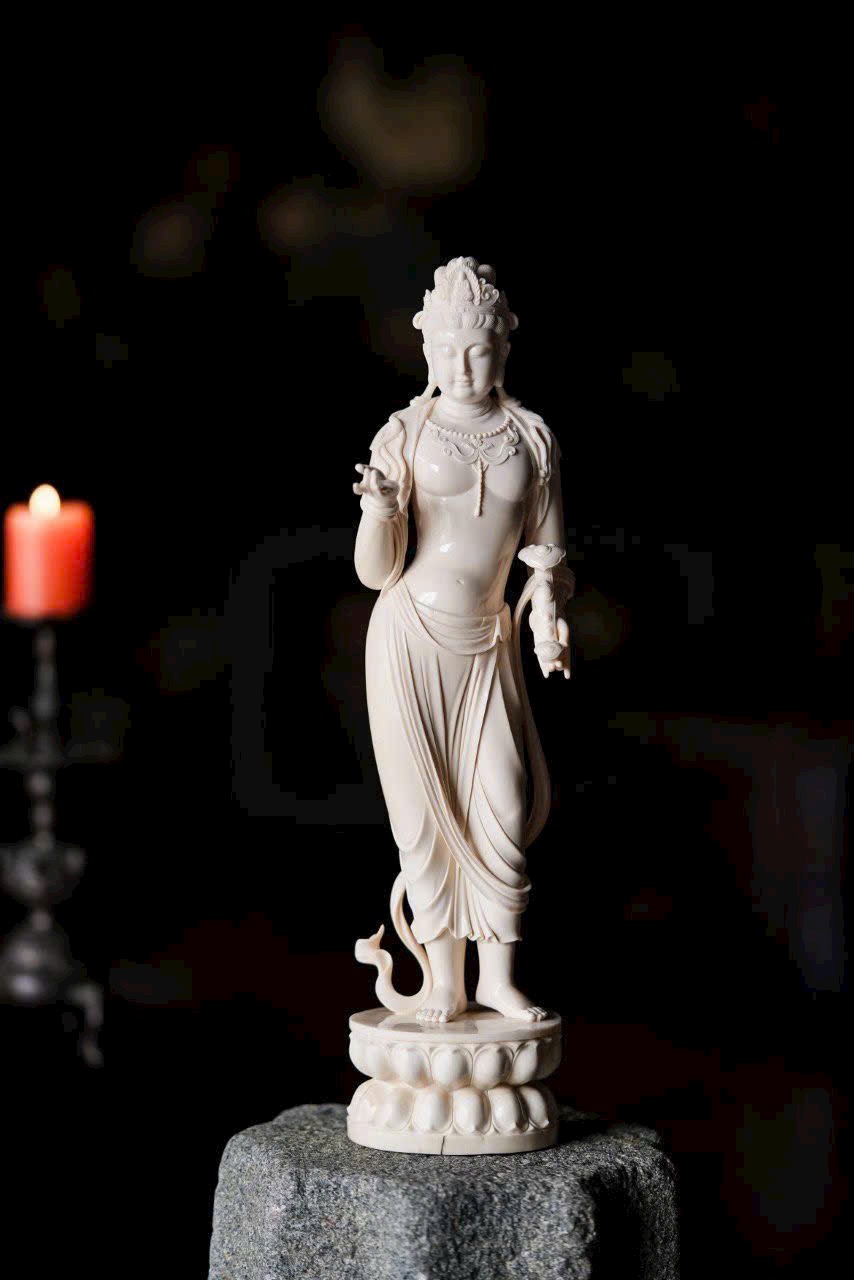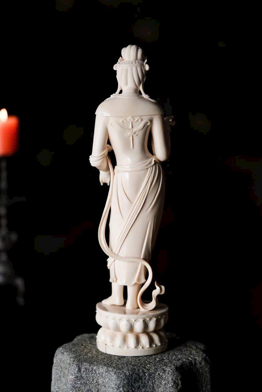 Chất n.gà sáng trong như mỡ đông, Quan Âm đứng lặng cúi mắt từ bi. Tà y lay động như nước chảy, anh lạc trong suốt tỏa ánh nhu hòa. Đặt nơi án thư, tĩnh lặng mà an nhiên.