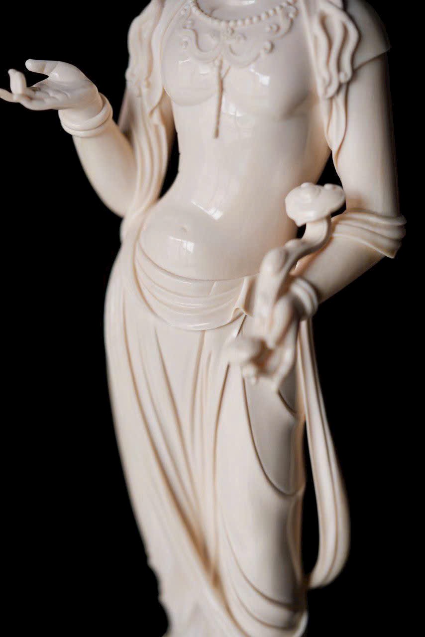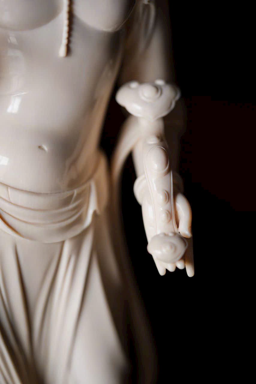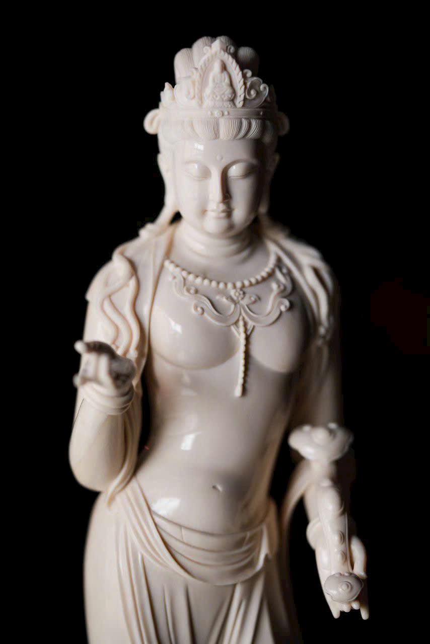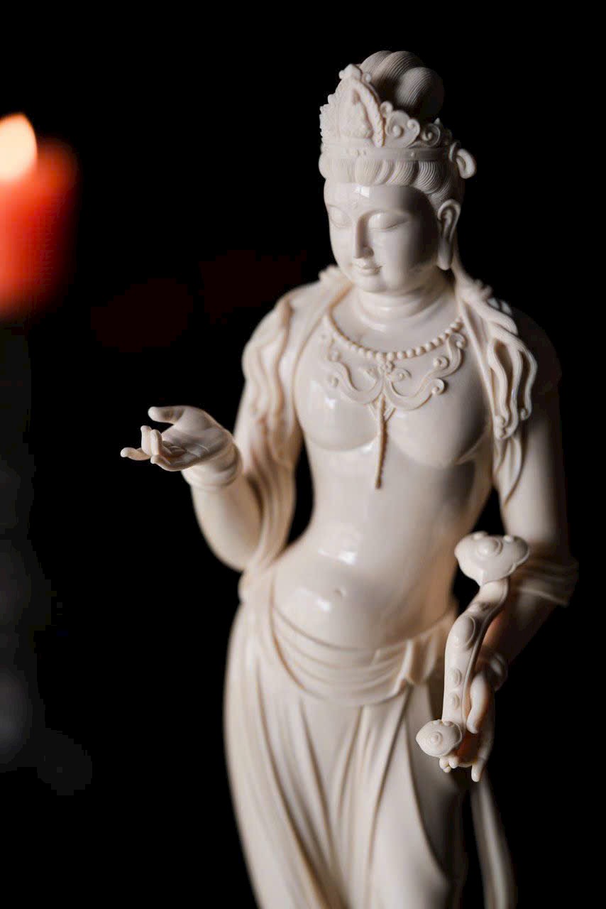 Chất n.gà sáng trong như mỡ đông, Quan Âm đứng lặng cúi mắt từ bi. Tà y lay động như nước chảy, anh lạc trong suốt tỏa ánh nhu hòa. Đặt nơi án thư, tĩnh lặng mà an nhiên.