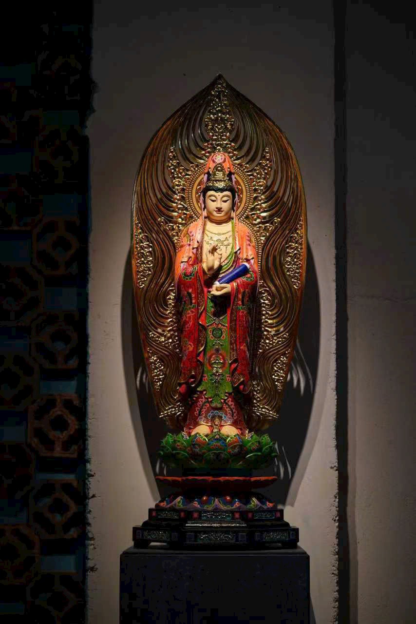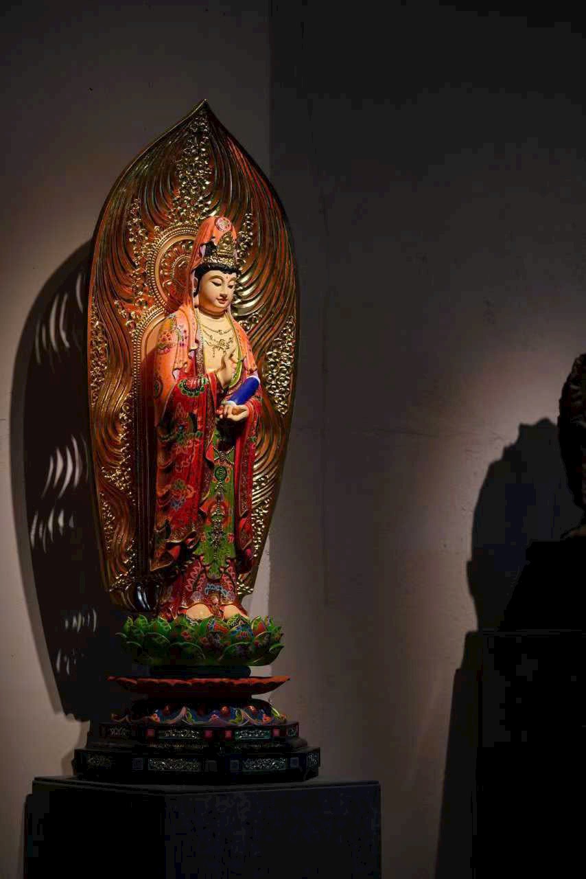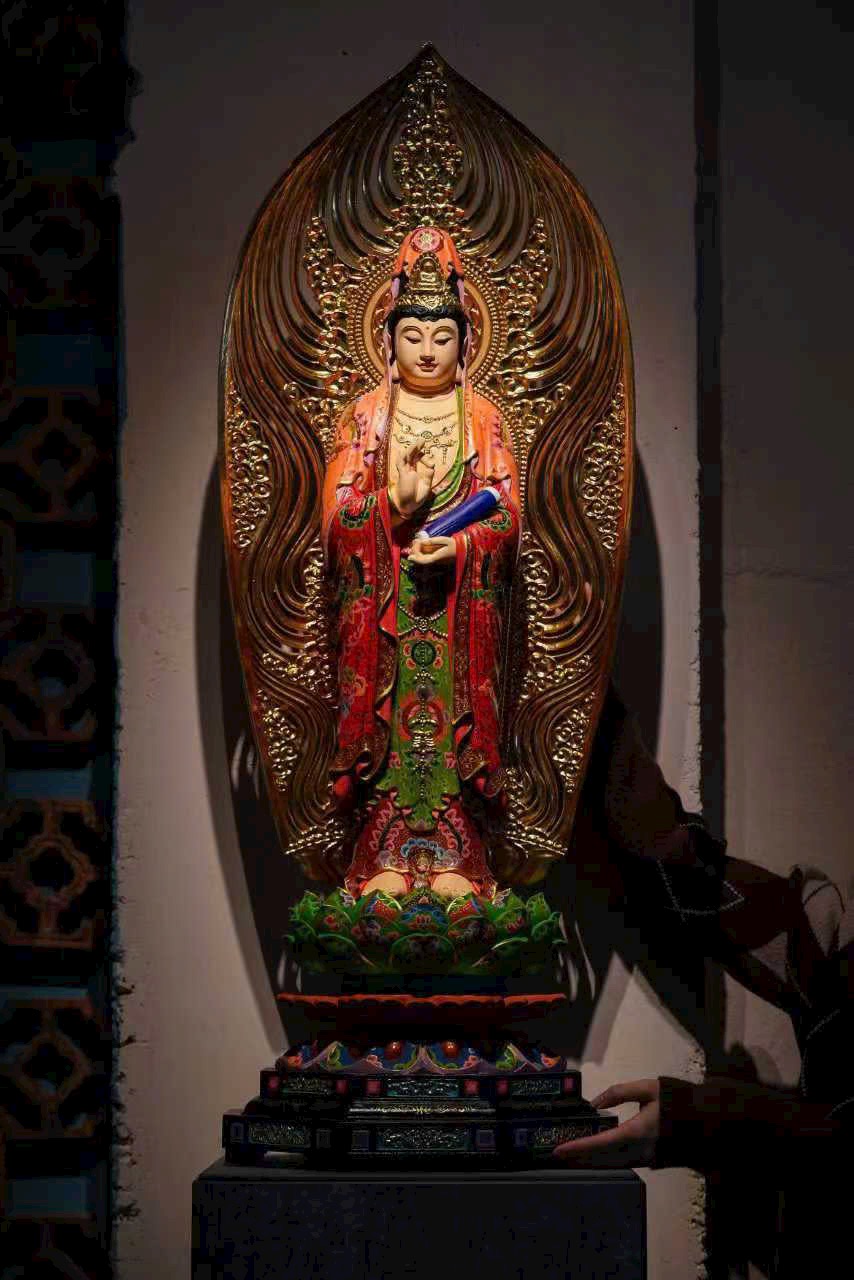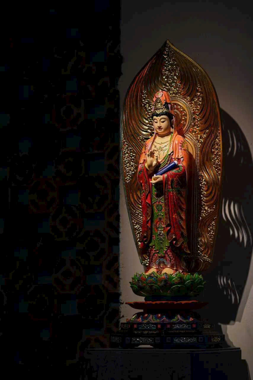 Vân gỗ ẩn hiện như hào quang bảo tướng, pháp tướng từ bi và trang nghiêm. Thiên y được tô vẽ sắc màu uyển chuyển như mây trôi, chân đứng trên đài sen tỏa hương thanh tịnh. Thờ nơi tịnh thất, tựa như được tắm trong cam lộ pháp vũ, lặng ngắm bồ đề tự tại.