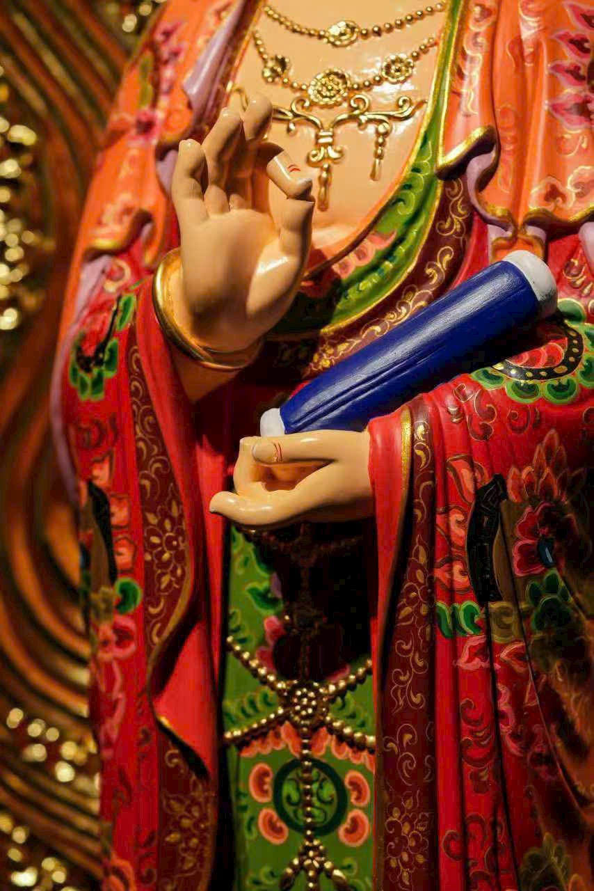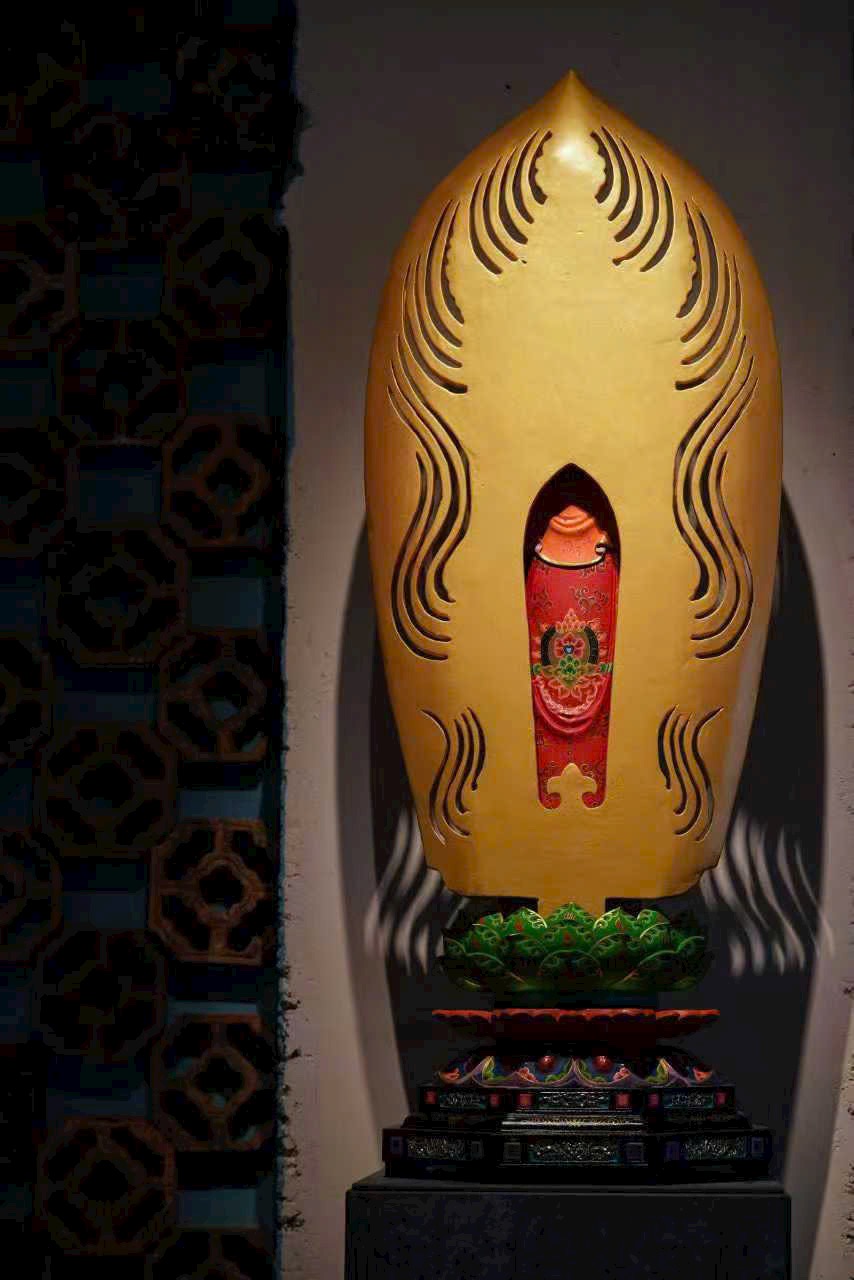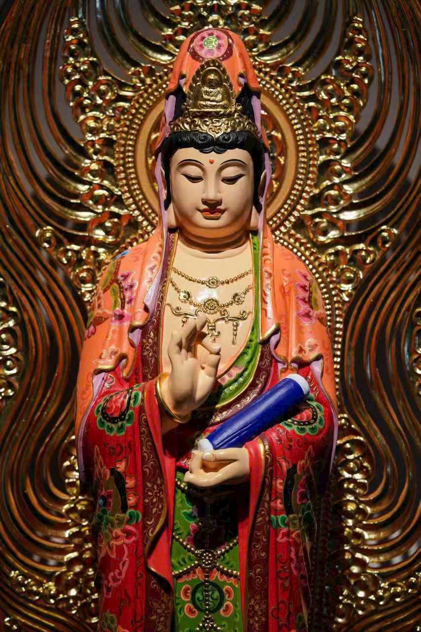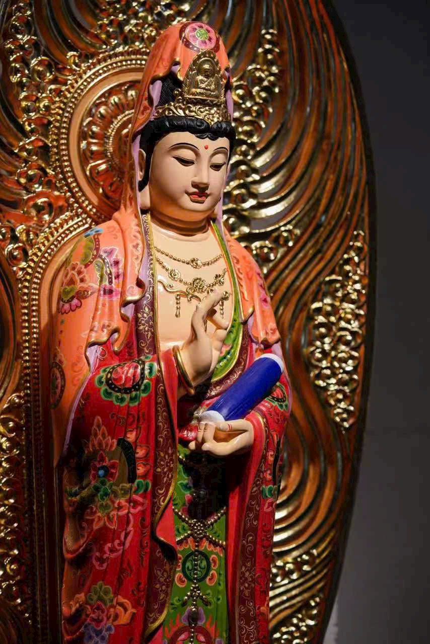 Vân gỗ ẩn hiện như hào quang bảo tướng, pháp tướng từ bi và trang nghiêm. Thiên y được tô vẽ sắc màu uyển chuyển như mây trôi, chân đứng trên đài sen tỏa hương thanh tịnh. Thờ nơi tịnh thất, tựa như được tắm trong cam lộ pháp vũ, lặng ngắm bồ đề tự tại.