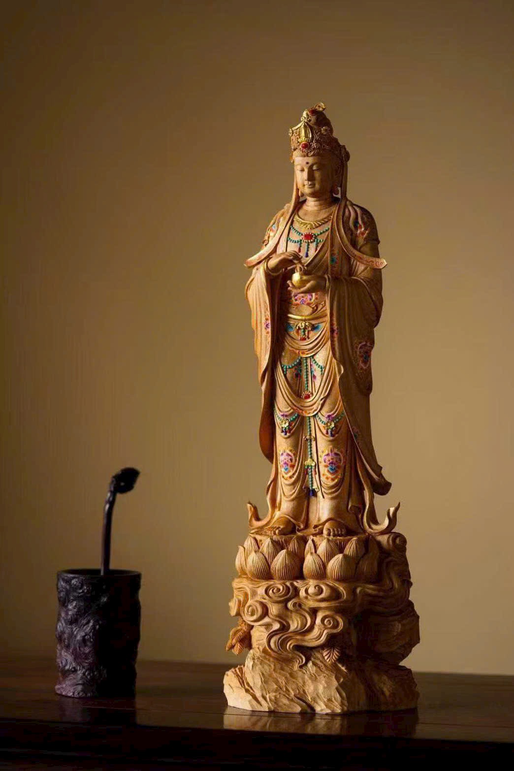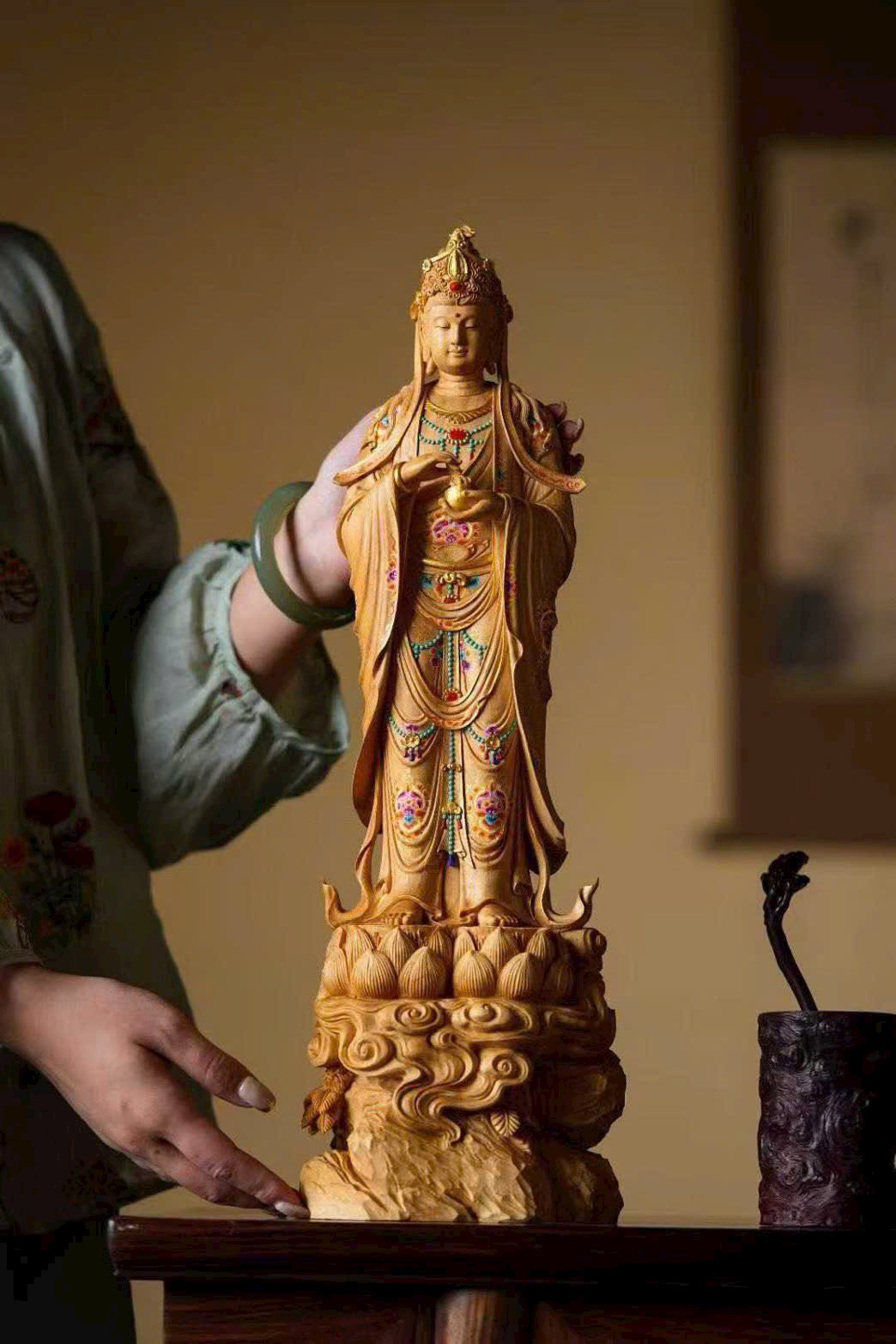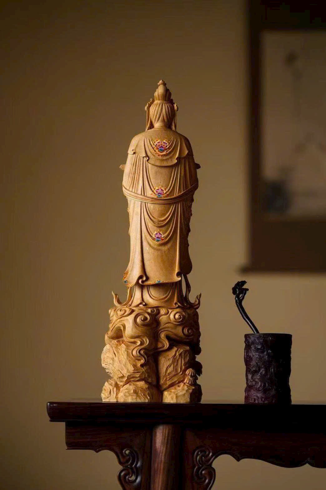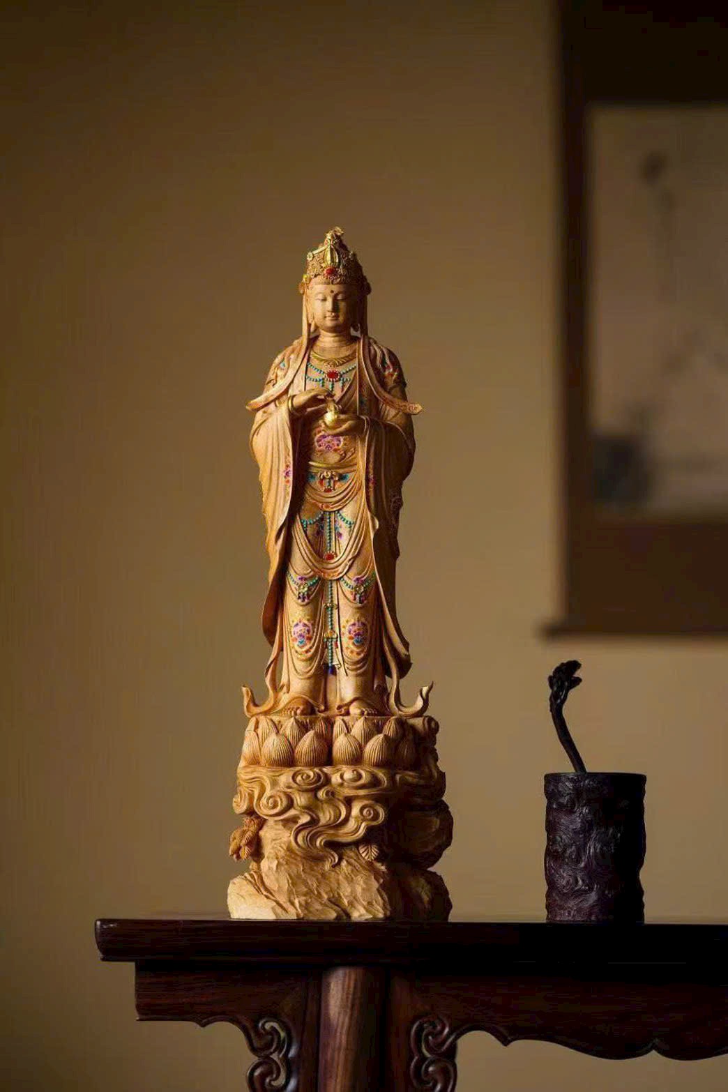 Màu gỗ ấm nhuận như mật, pháp tướng Quan Âm đầy đặn, phúc hậu. Đôi mắt khép hờ, khóe môi thoáng nụ cười hiền hòa. Y áo xếp lớp mềm mại như có làn gió nhẹ lướt qua. Đặt nơi bàn sách hay phòng trà, mang lại cảm giác thanh tịnh và an nhiên.