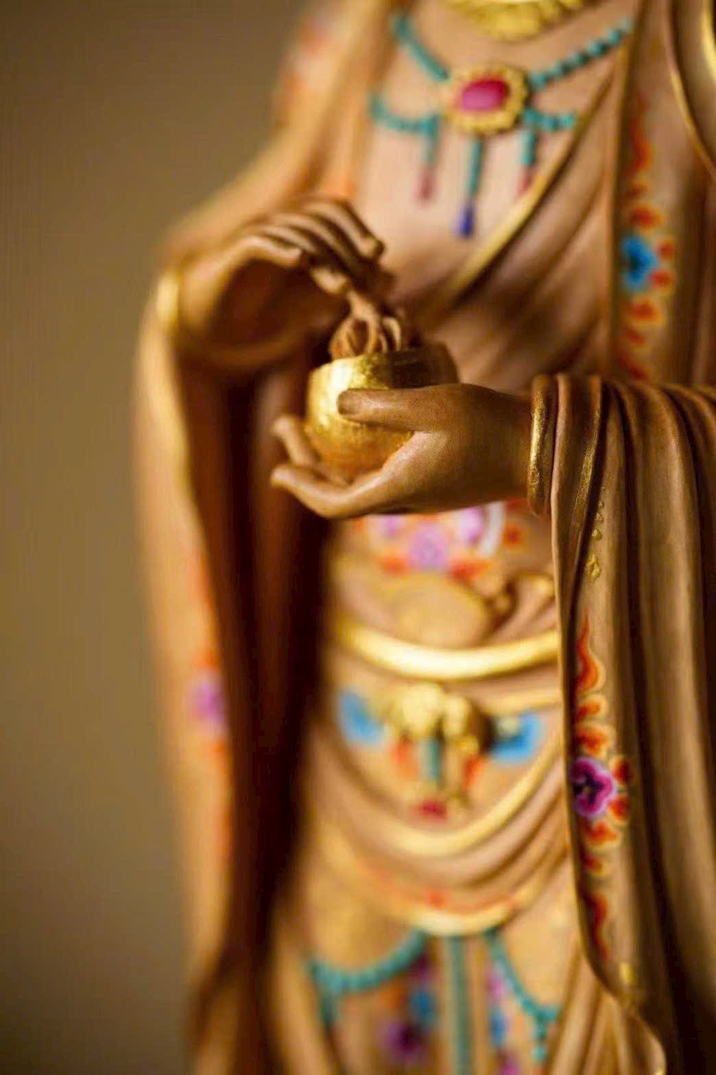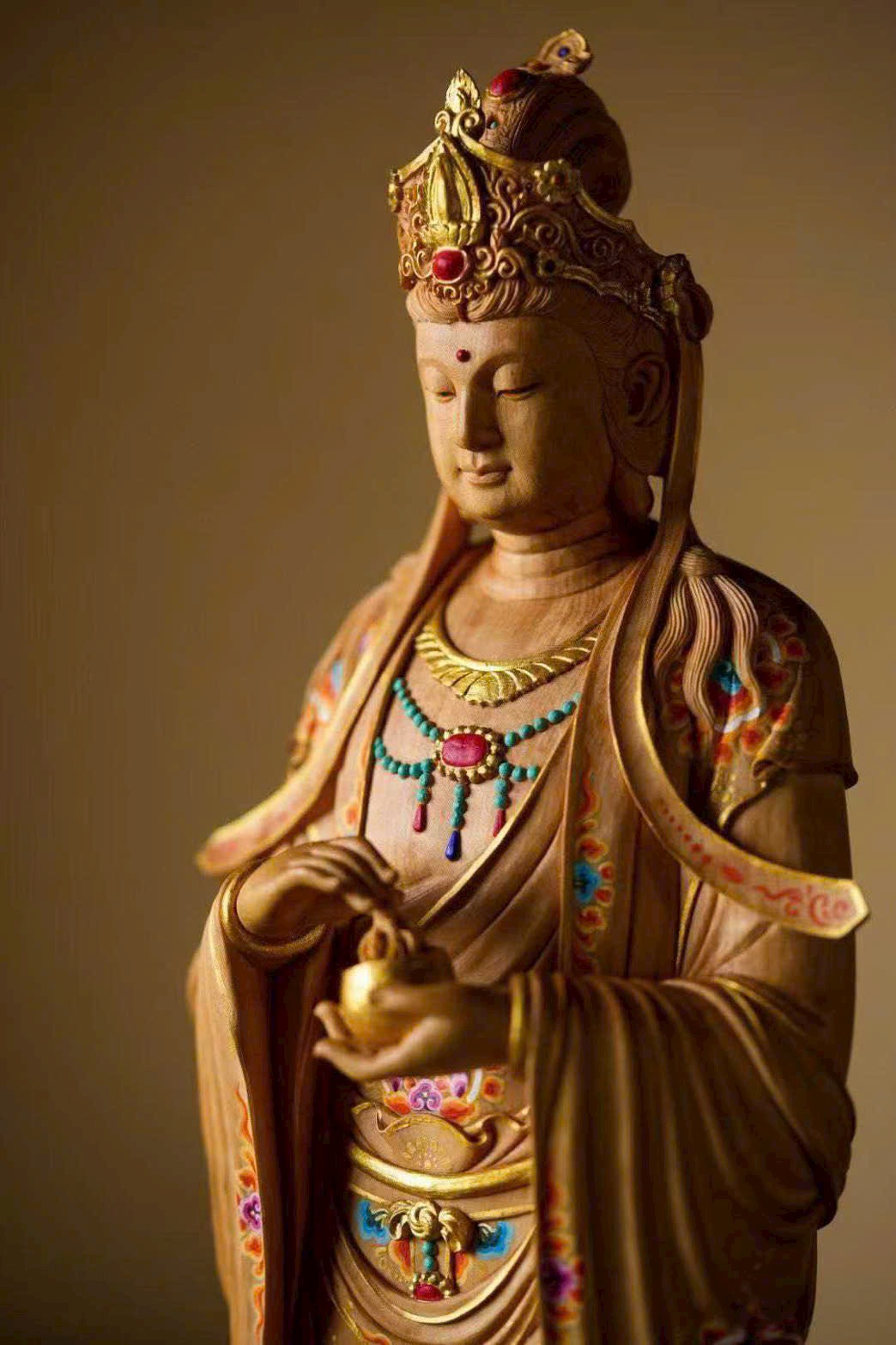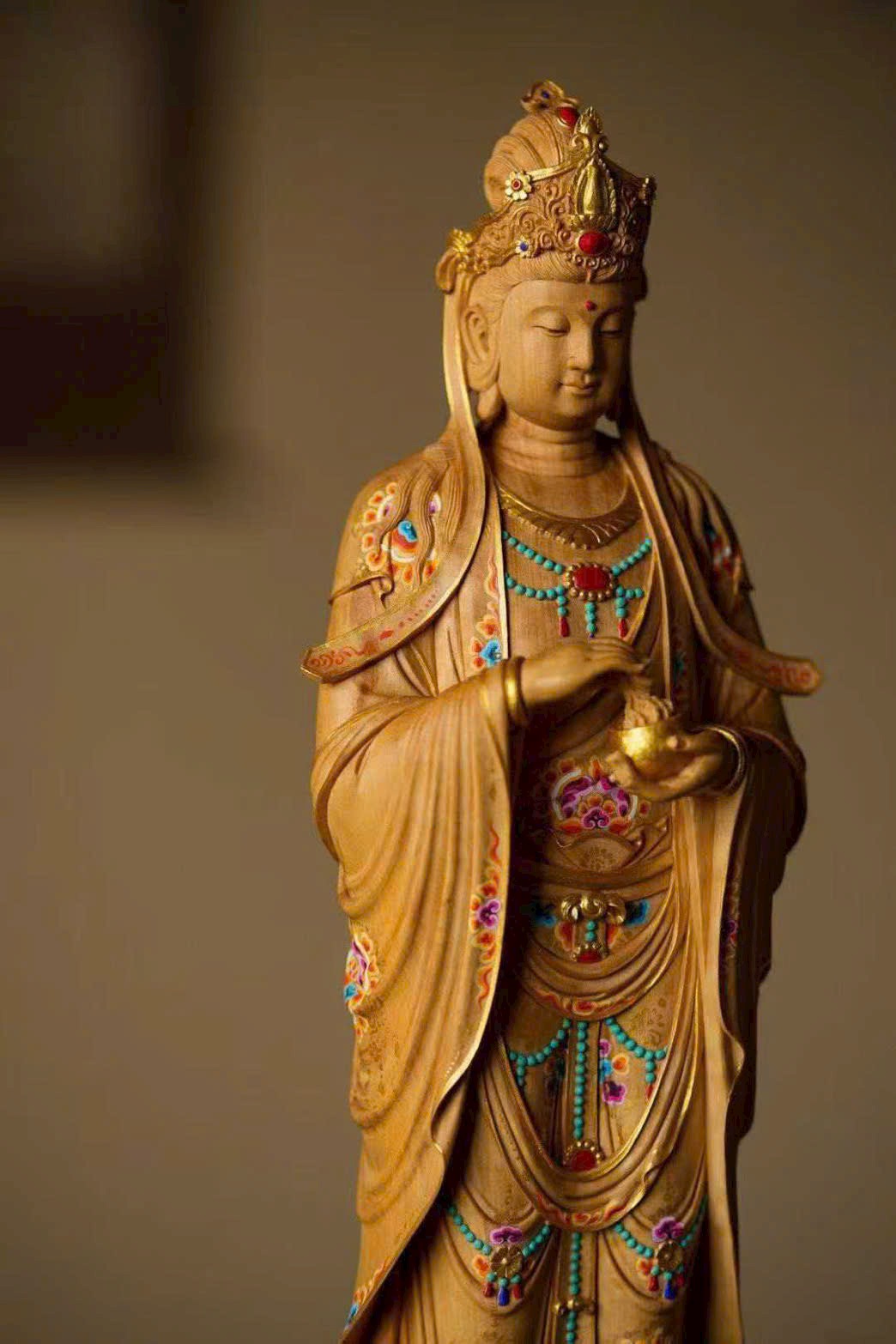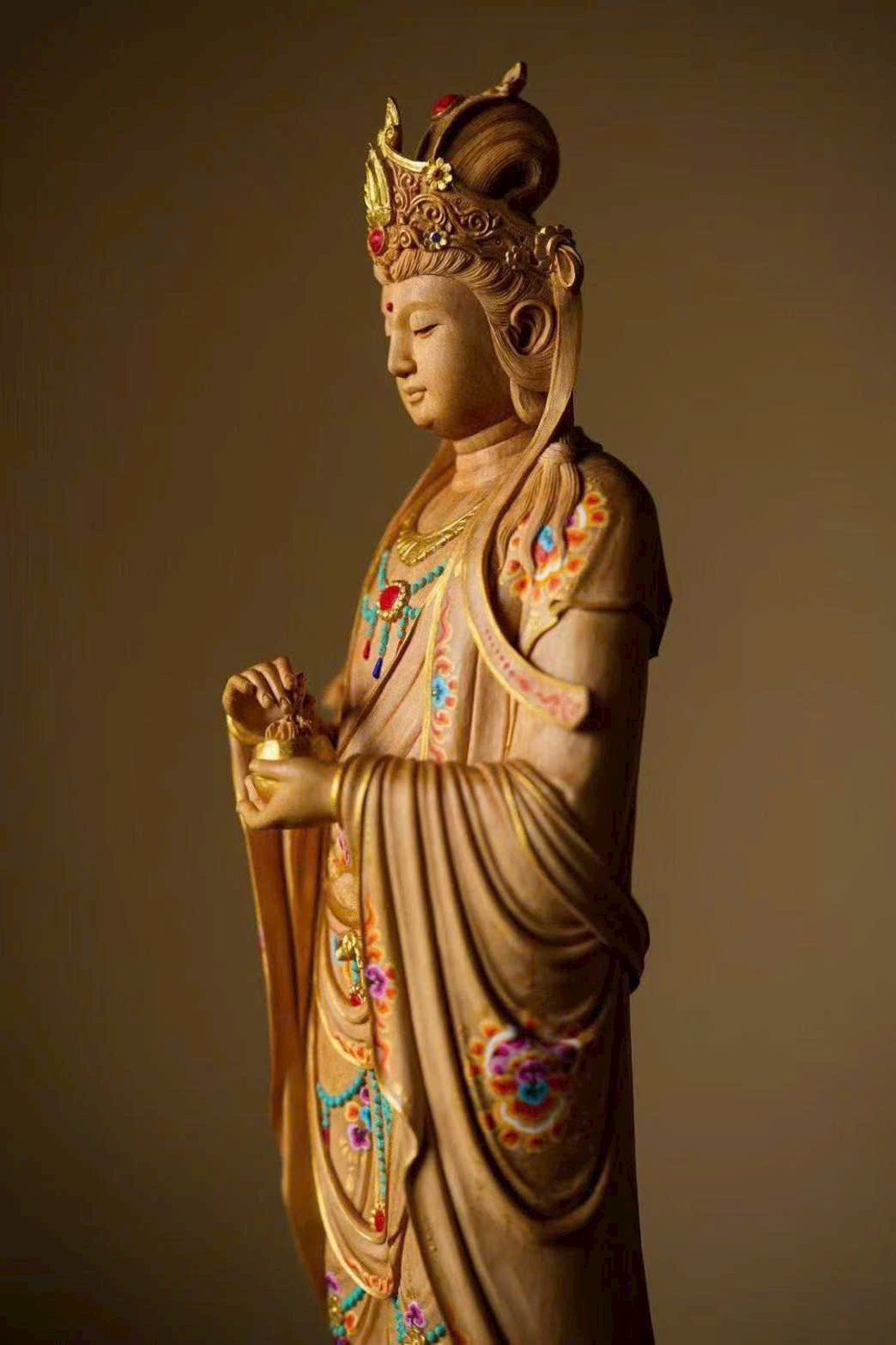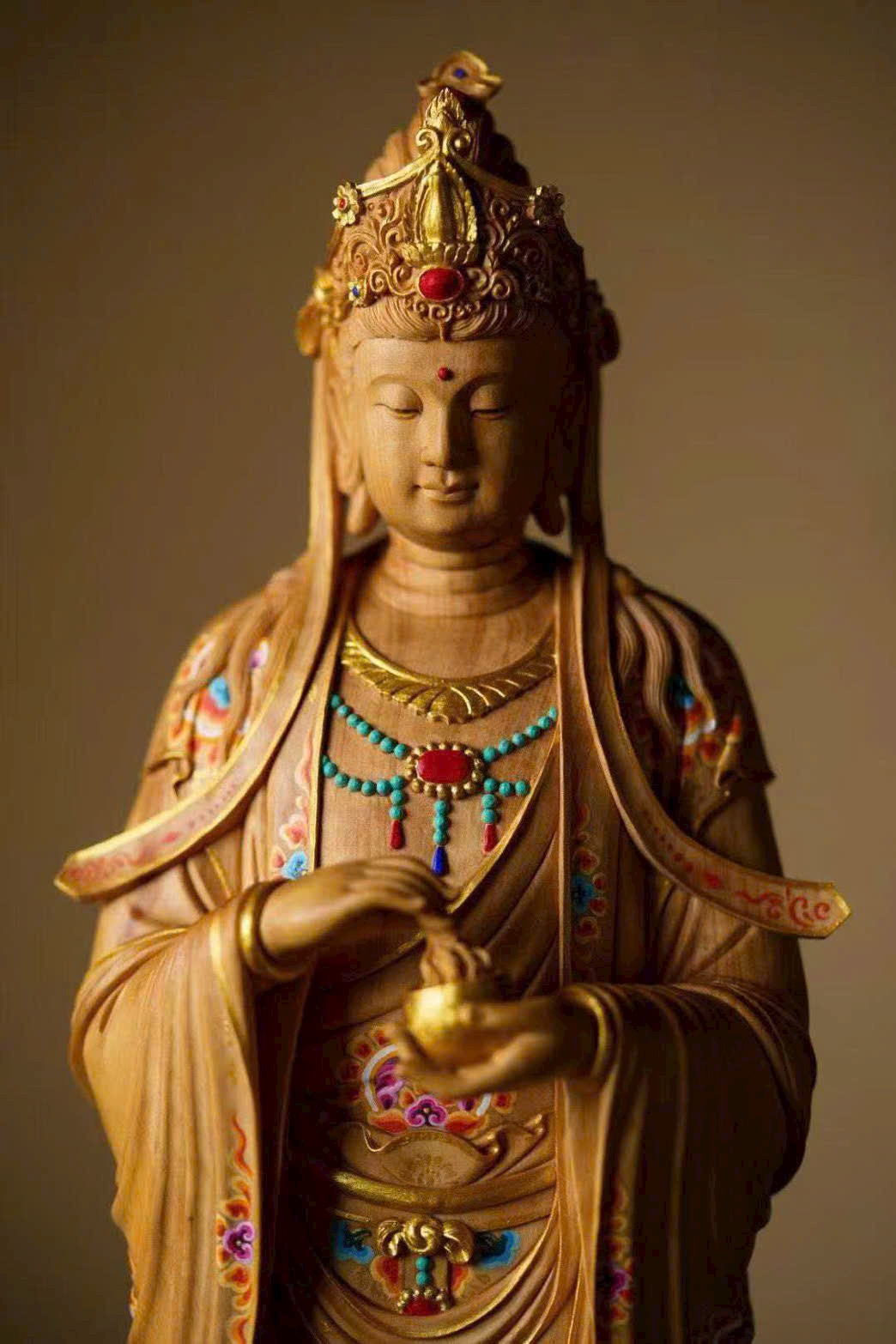 Màu gỗ ấm nhuận như mật, pháp tướng Quan Âm đầy đặn, phúc hậu. Đôi mắt khép hờ, khóe môi thoáng nụ cười hiền hòa. Y áo xếp lớp mềm mại như có làn gió nhẹ lướt qua. Đặt nơi bàn sách hay phòng trà, mang lại cảm giác thanh tịnh và an nhiên.
