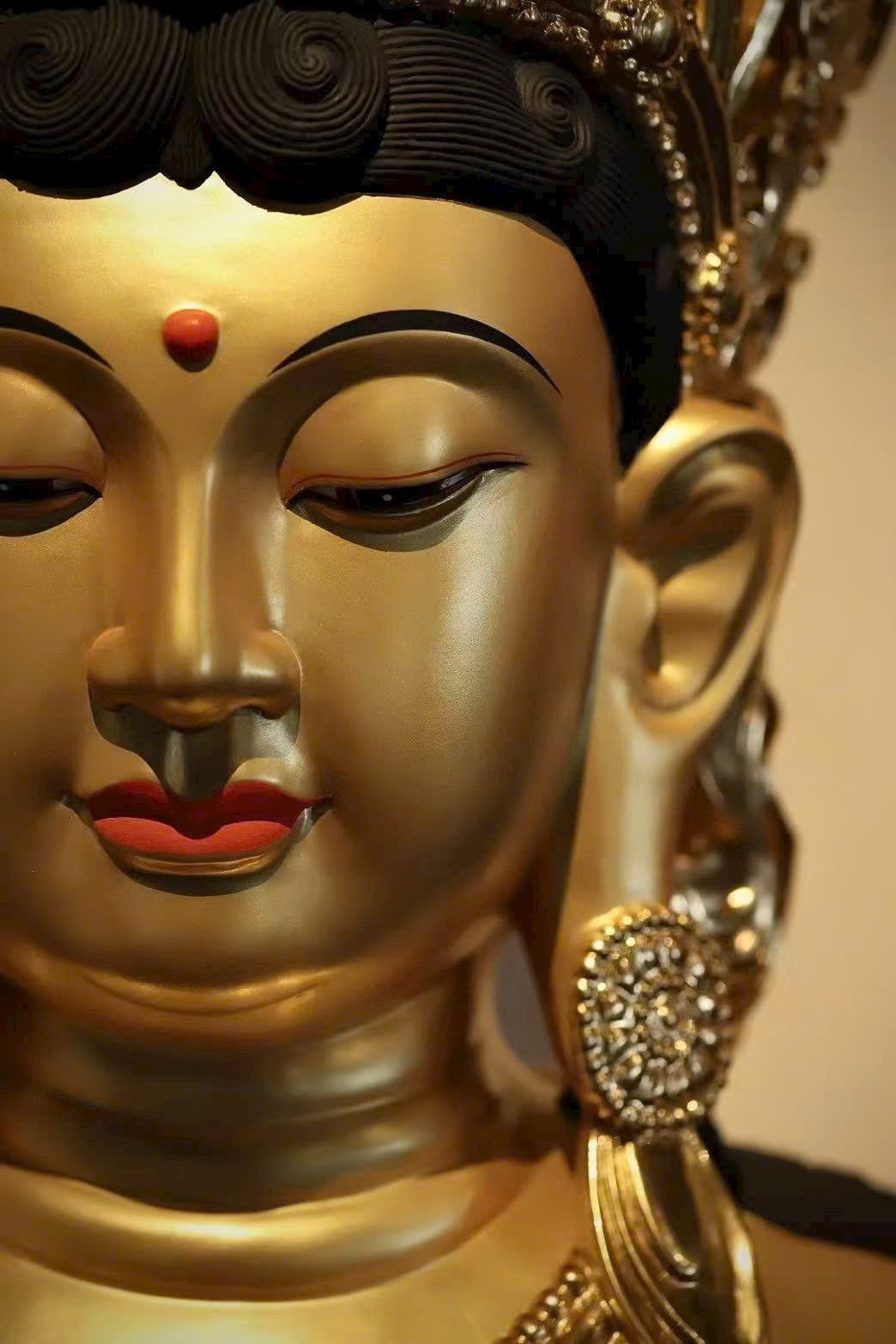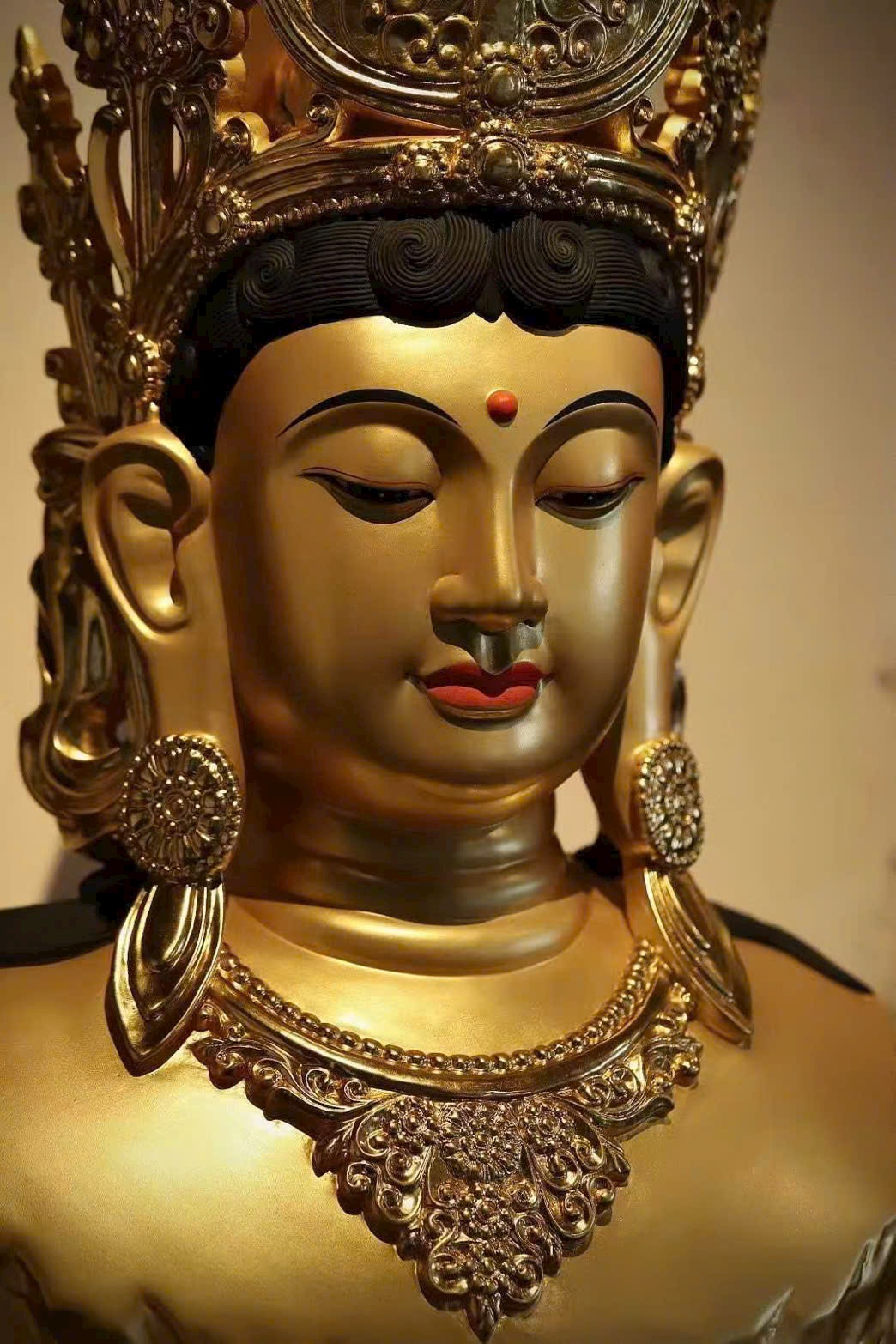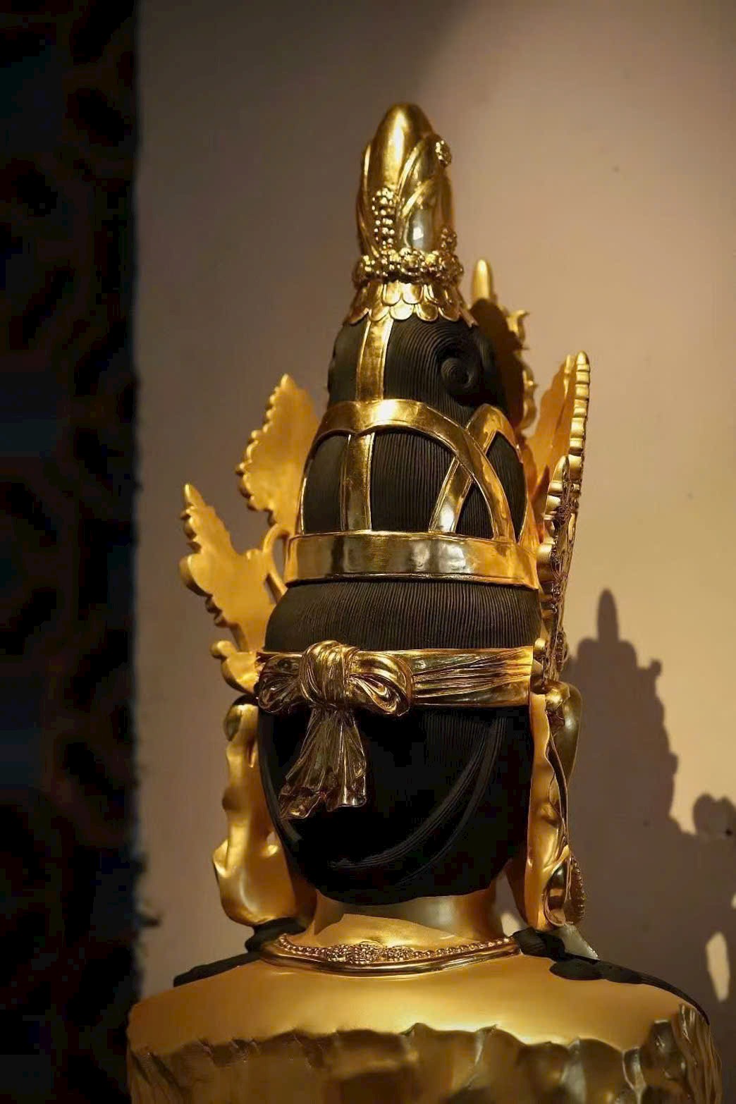 Khuôn mặt hiền hòa, miệng nở nụ cười nhẹ, thần thái điềm tĩnh nội tại. Từng sợi tóc điêu khắc tinh xảo, toàn bộ toát lên vẻ uy nghi trang trọng, gương mặt từ bi sinh động, mang lại cảm giác thiện lành và bình an.