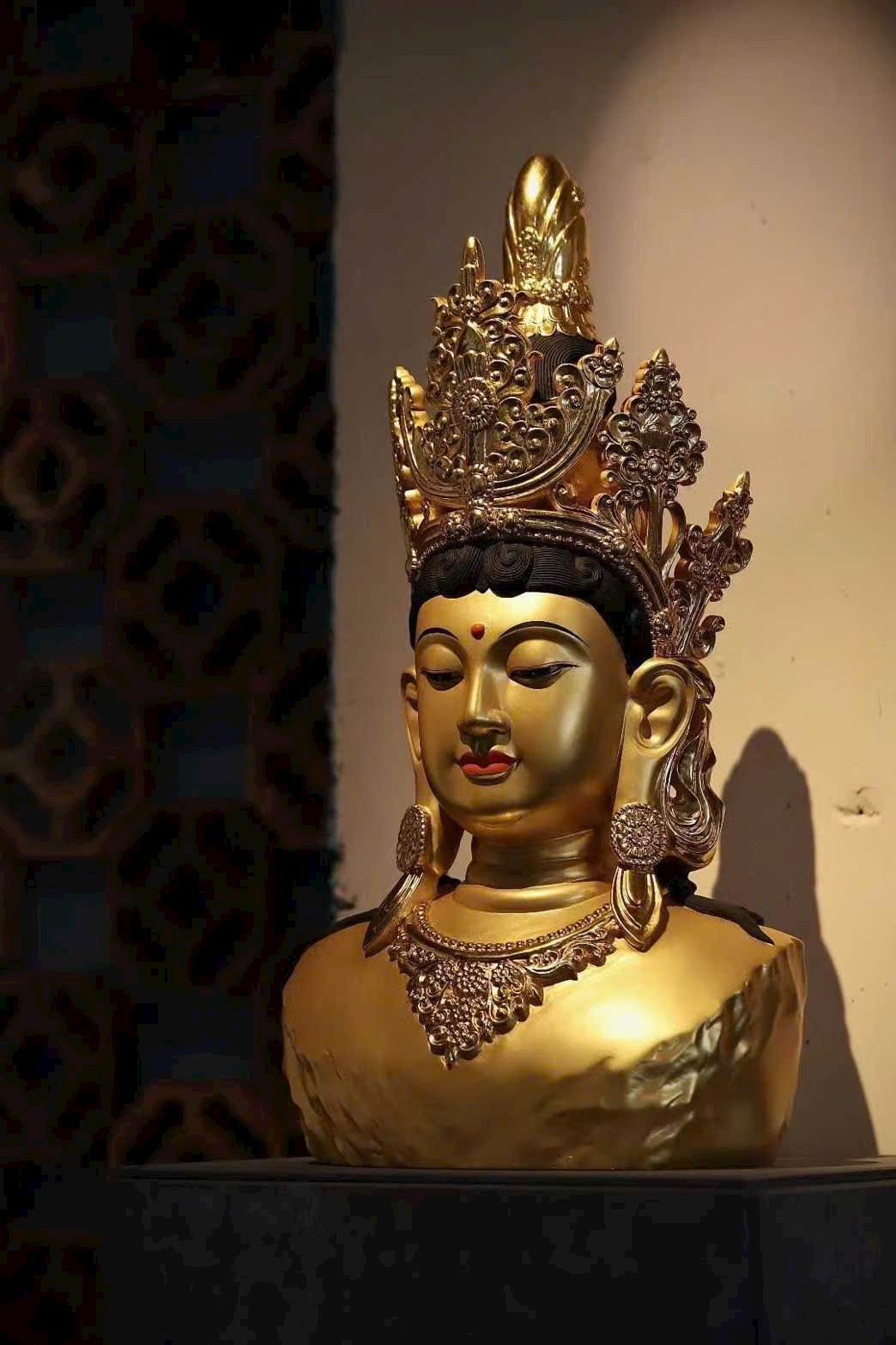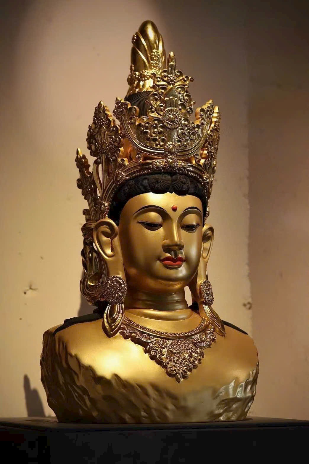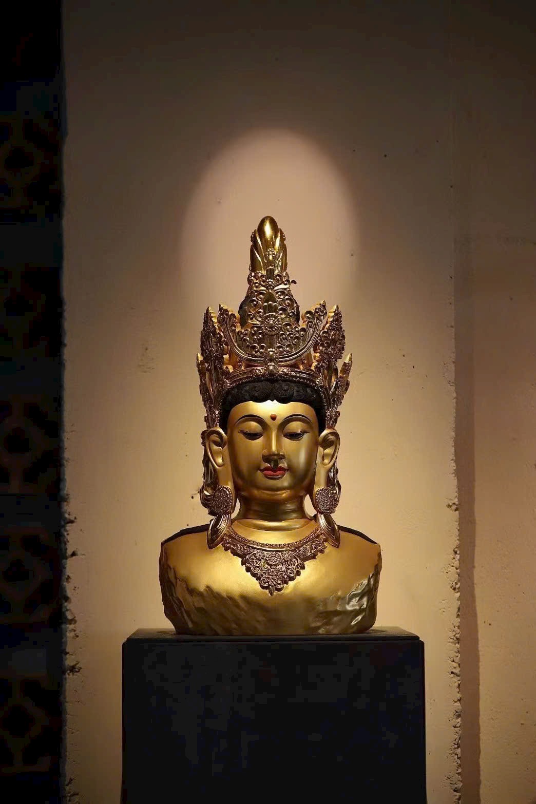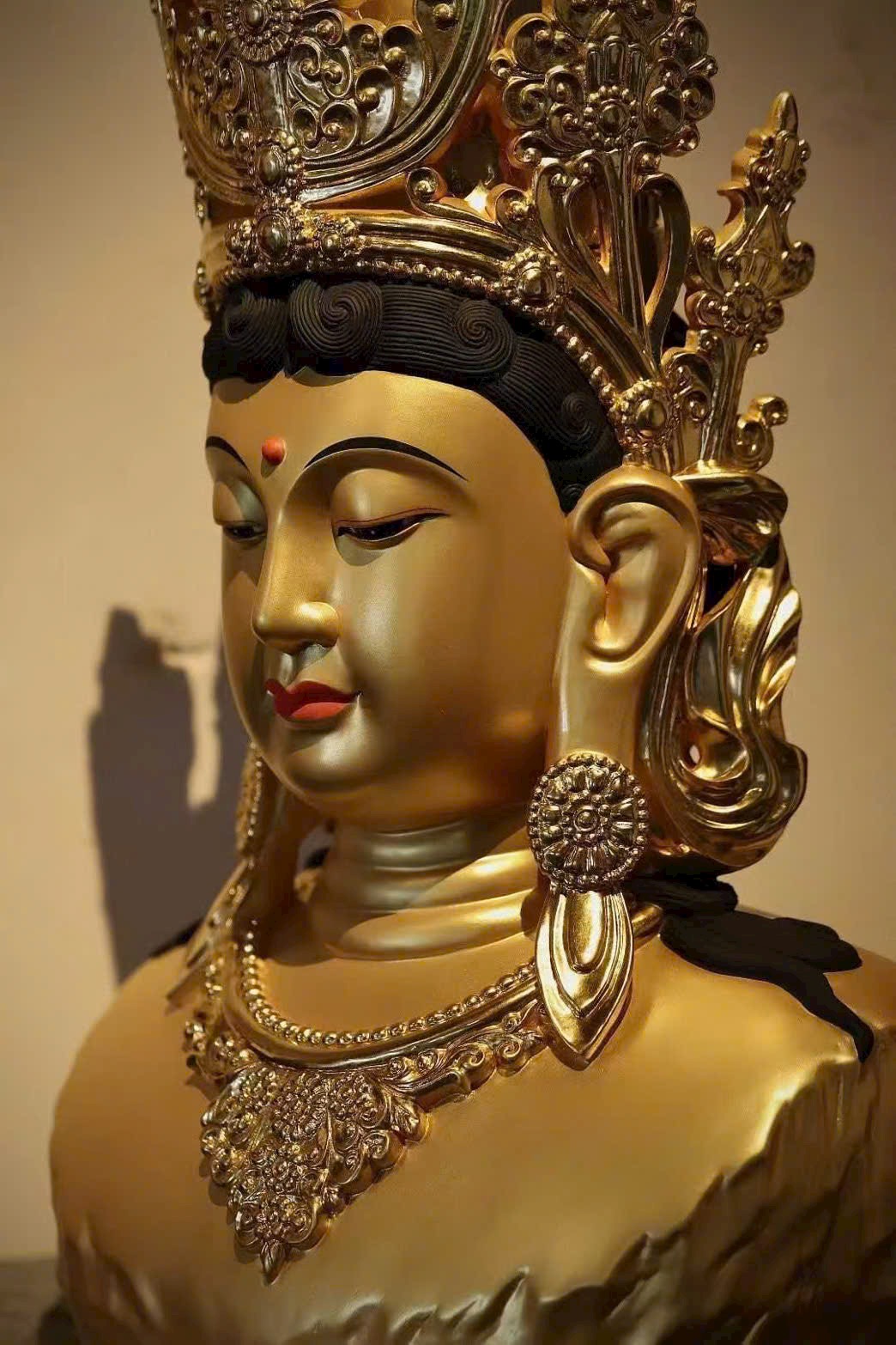 Khuôn mặt hiền hòa, miệng nở nụ cười nhẹ, thần thái điềm tĩnh nội tại. Từng sợi tóc điêu khắc tinh xảo, toàn bộ toát lên vẻ uy nghi trang trọng, gương mặt từ bi sinh động, mang lại cảm giác thiện lành và bình an.