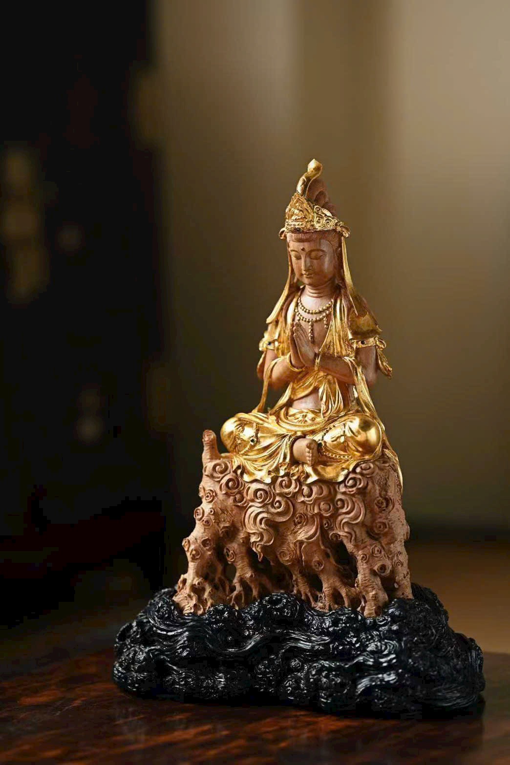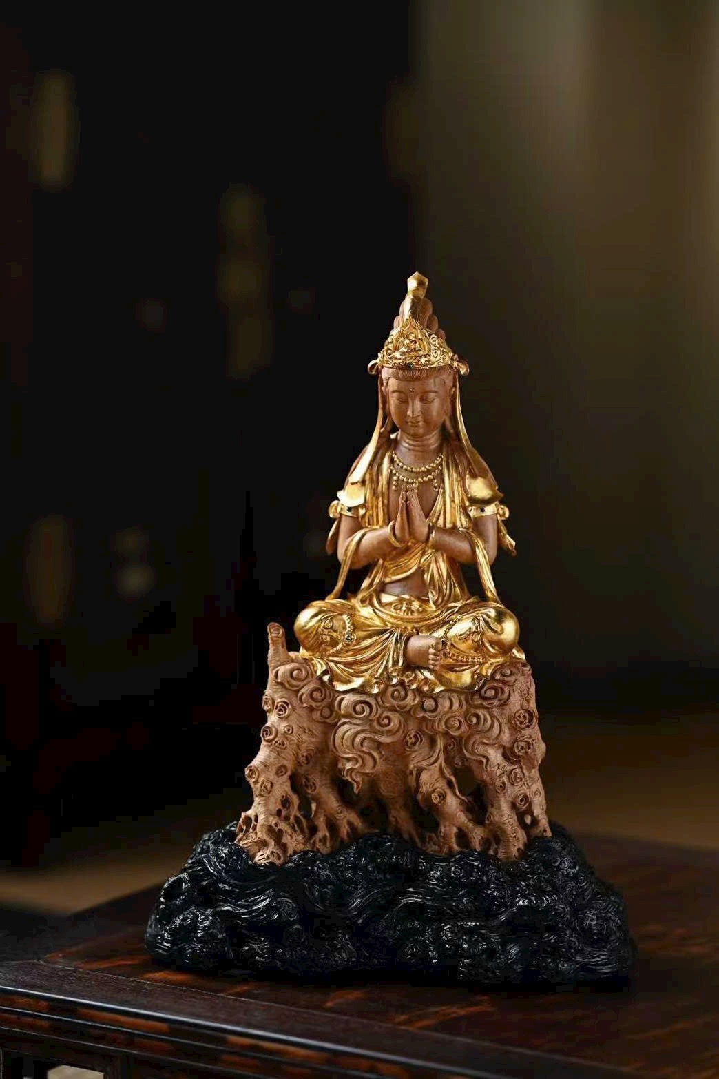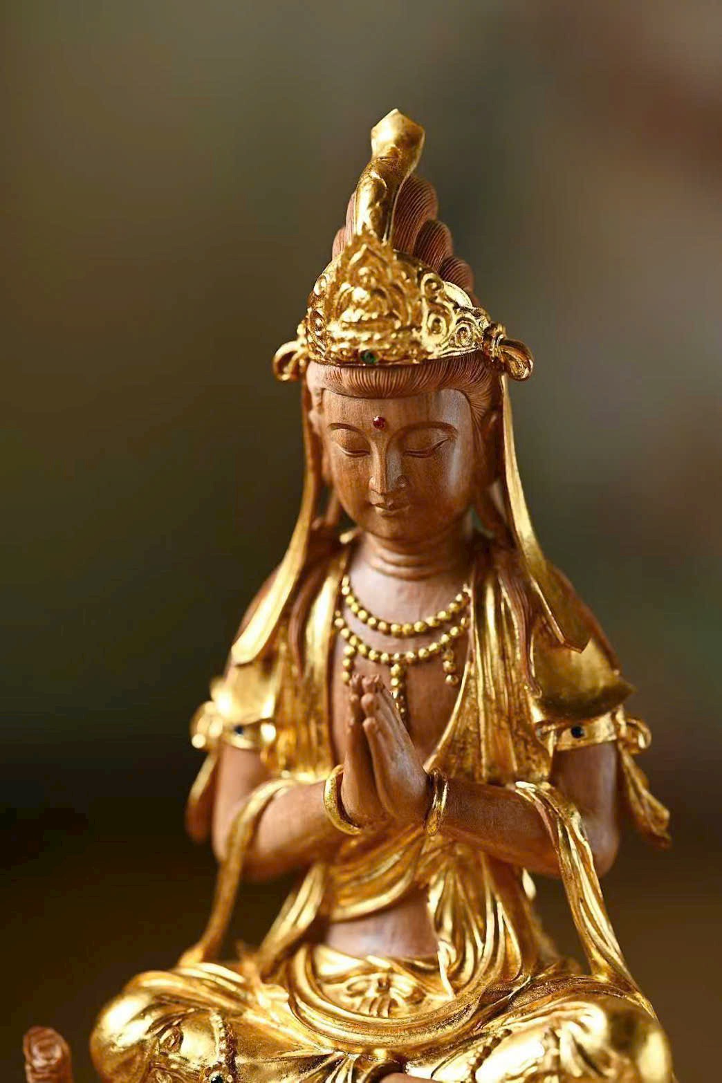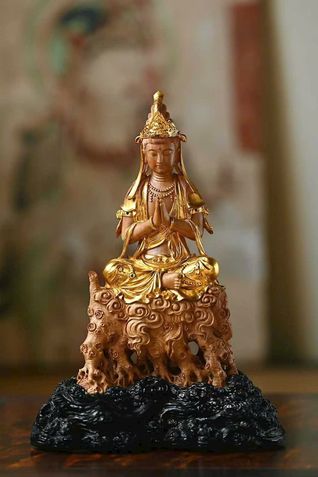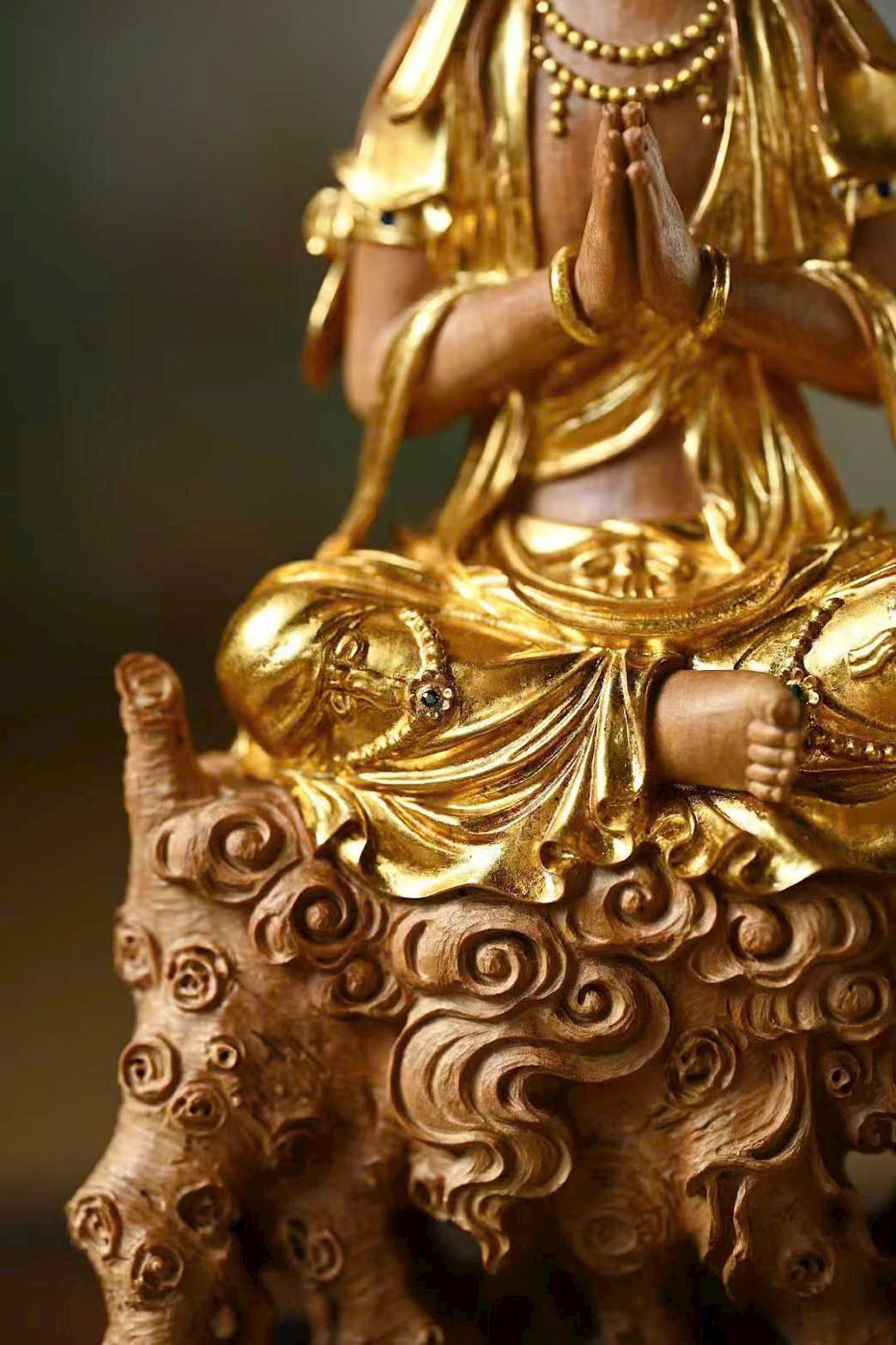 Sắc gỗ ấm nhuận cổ mộc, dung nhan từ hòa, mắt khép hờ an tĩnh, y phục uyển chuyển, hai tay hợp chưởng, trang nghiêm thù thắng.