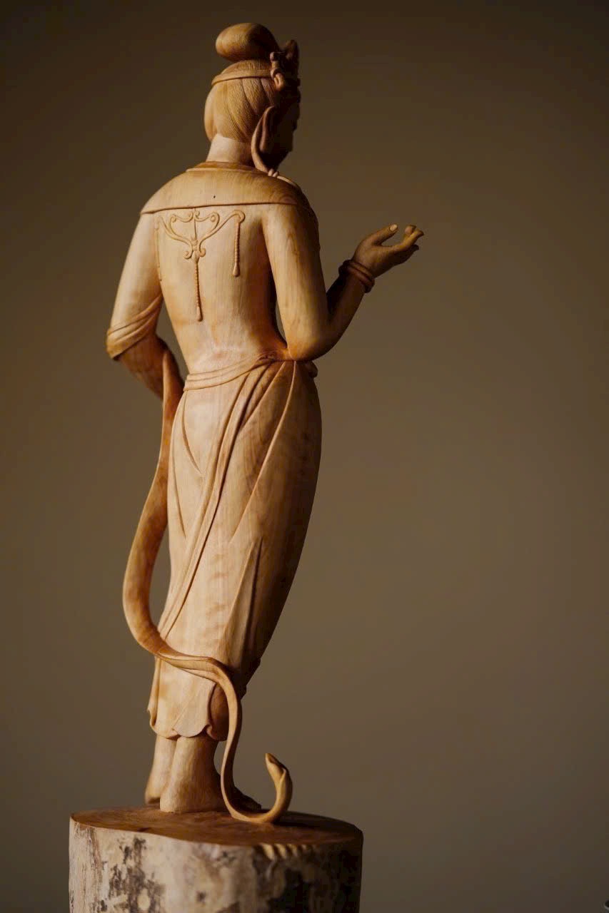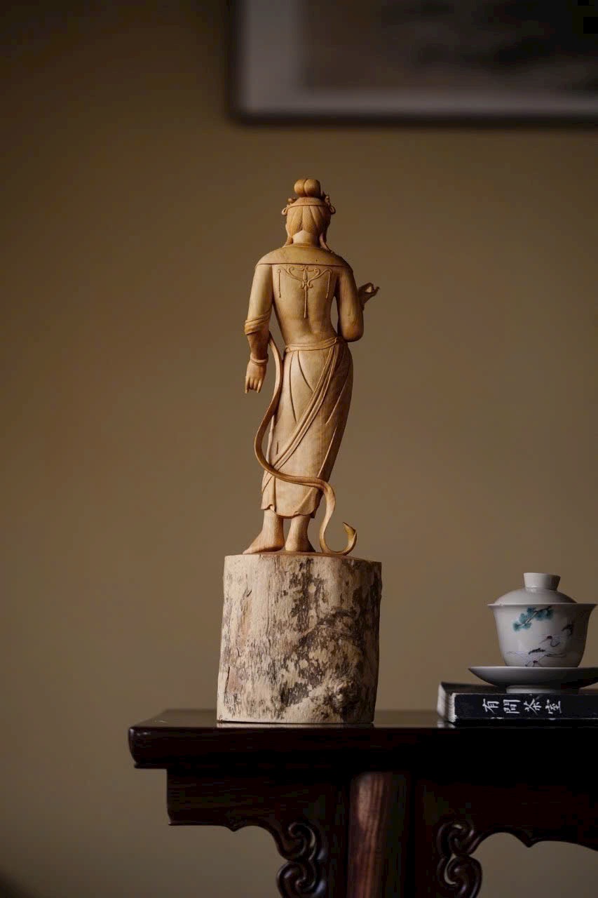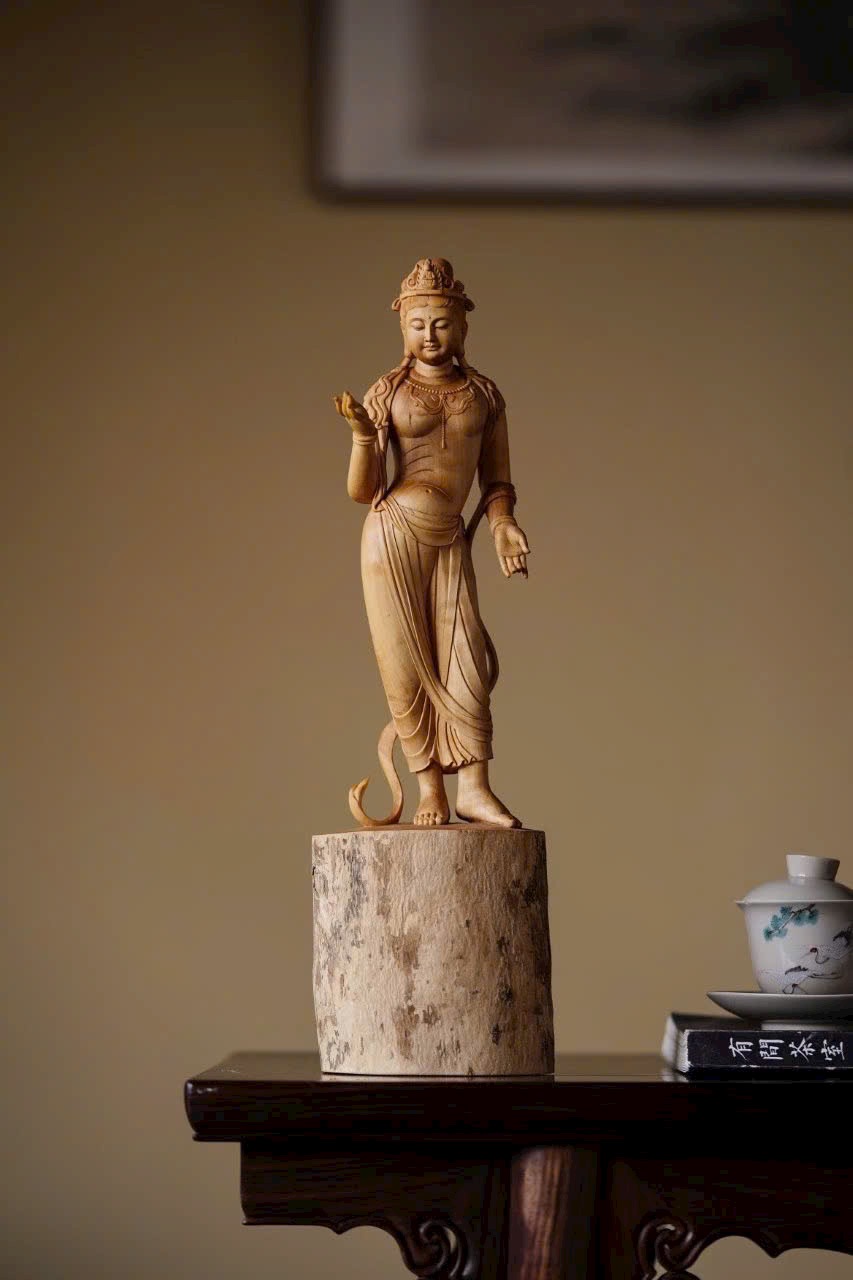 Tượng Quan Âm chế tác thủ công, dáng vẻ an tĩnh, áo lụa bay mềm mại.