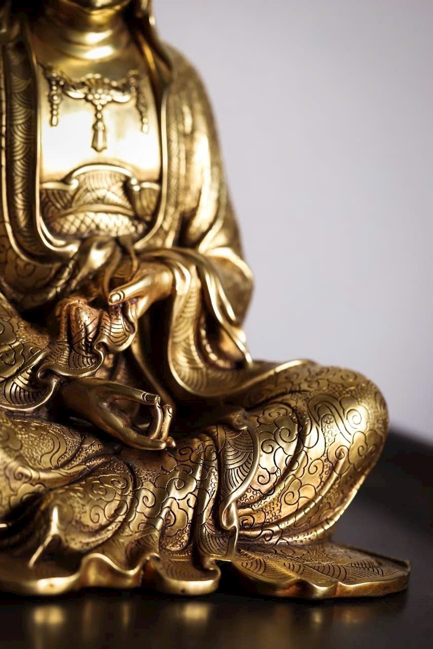Thân vàng tỏa ánh Phật quang, tà y buông rủ như thác, mắt nhìn xuống mỉm cười, toát lên lòng từ bi. Mạ vàng rực rỡ, sáng ngời linh khí. Trưng bày nơi án thờ, không gian trở nên thanh tịnh, mát lành trí tuệ.