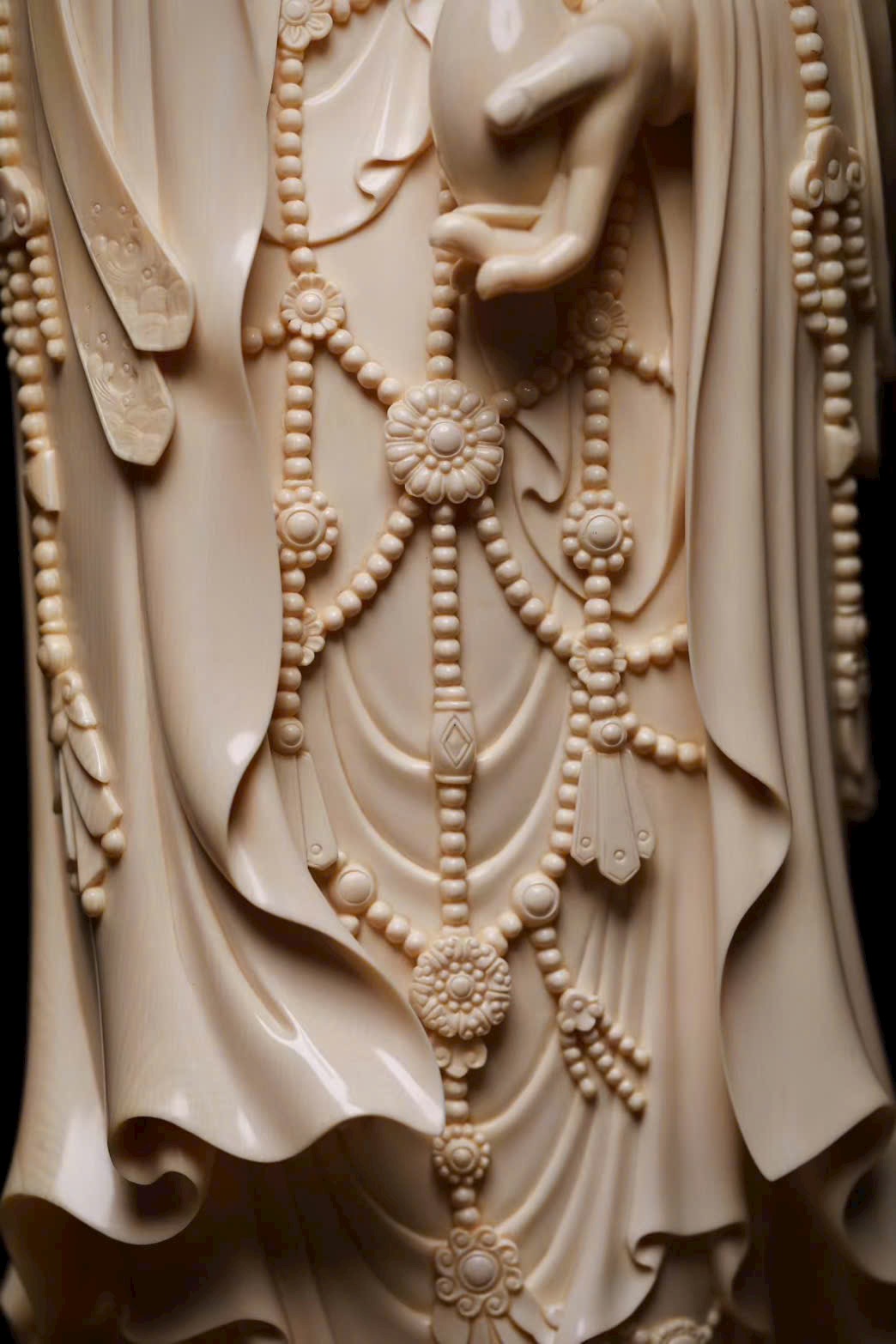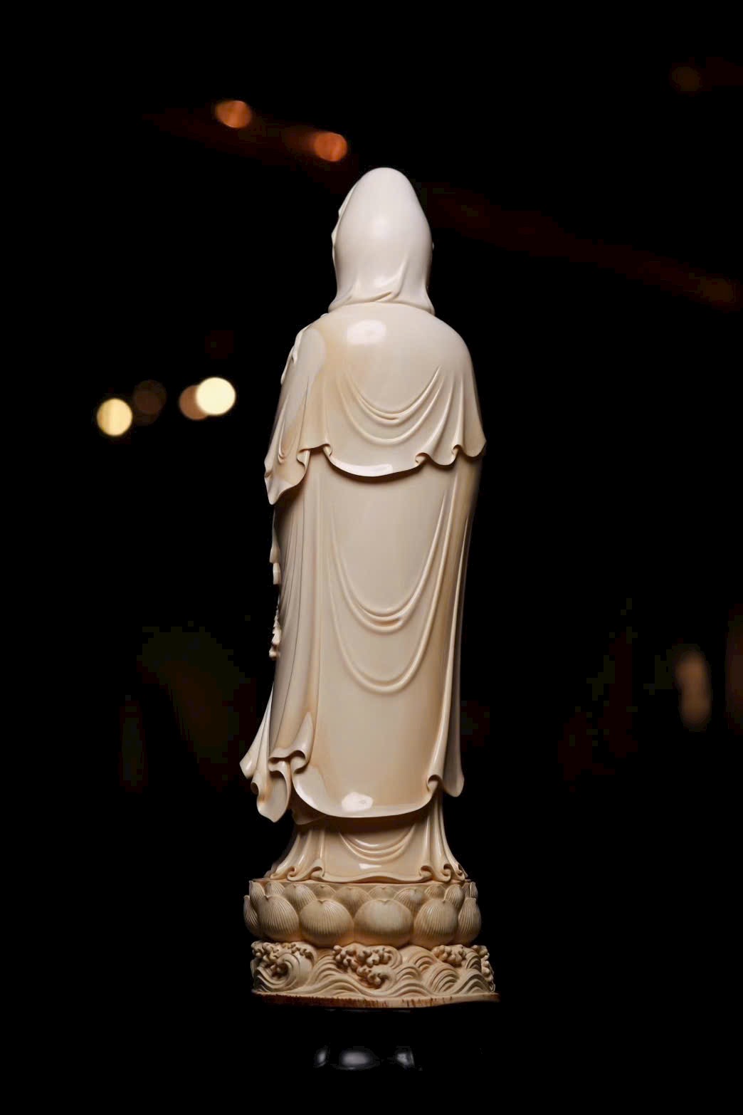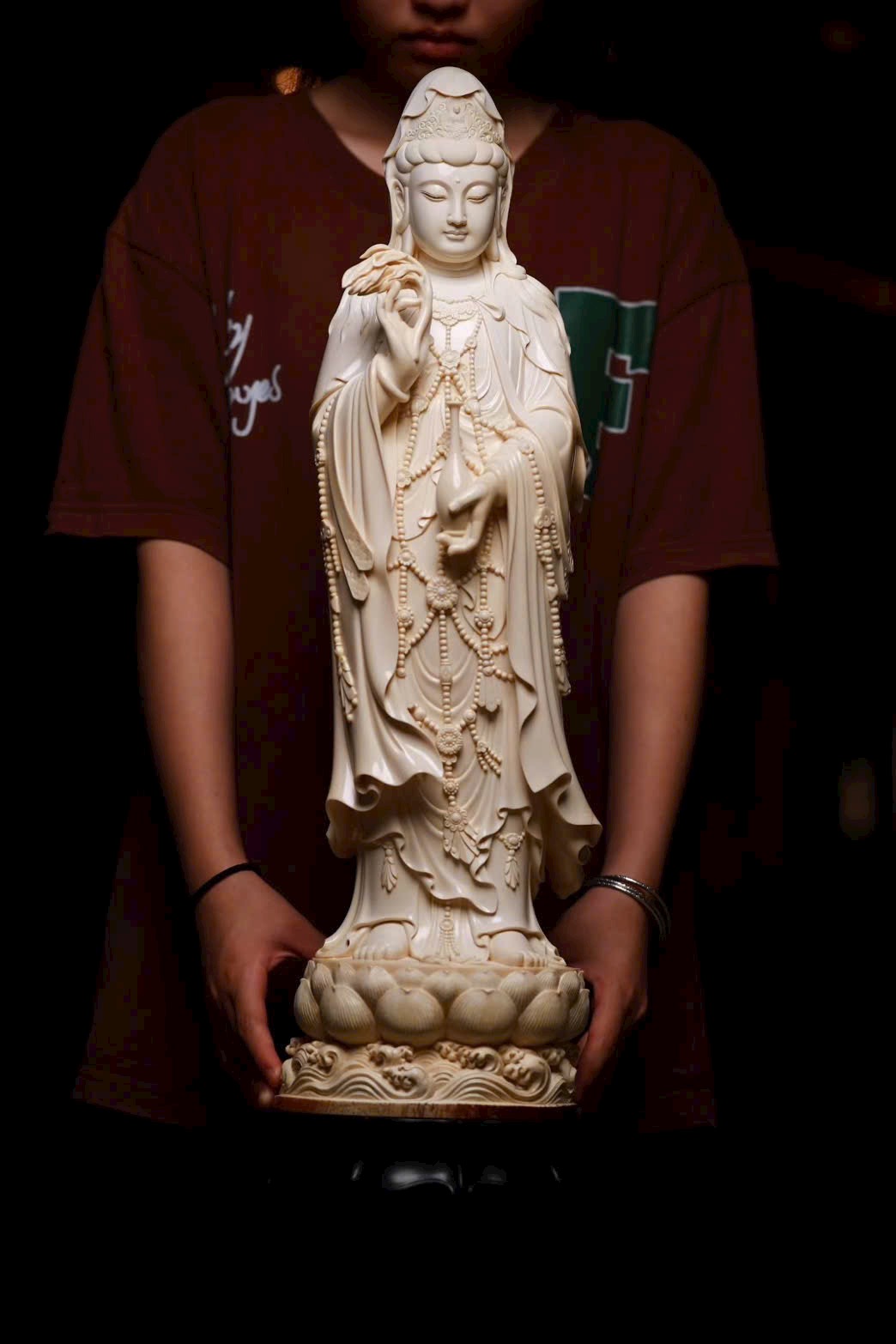 Tác phẩm trọng khí, trọng công, do Đại Sư đích thân chế tác. Chọn chất liệu ng.à voi ma mút 5A nguyên khối, điêu khắc toàn khối tinh xảo. Thế đao vận lực đều đặn, khí mạch tĩnh lặng. Khuôn diện đầy đặn sinh động, mày mắt hiền từ, nụ cười thân ái. Tay trái cầm tịnh bình, tay phải nâng nhành dương liễu, như rưới cam lộ, che chở muôn loài.