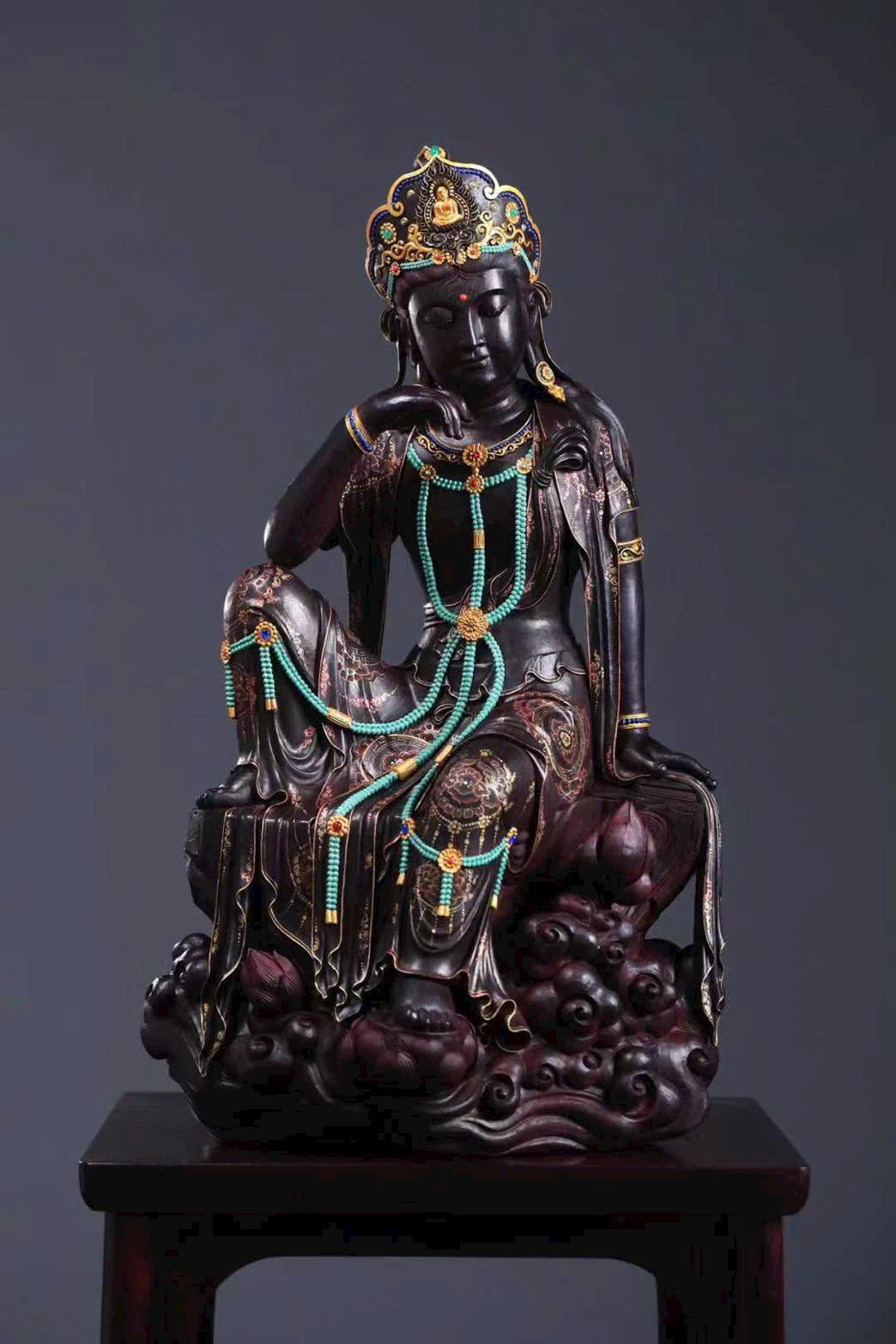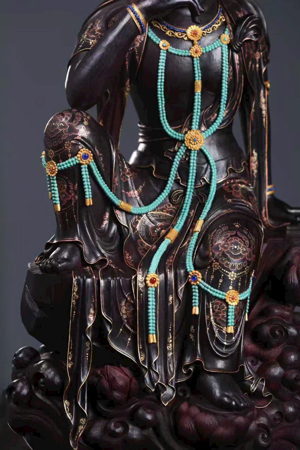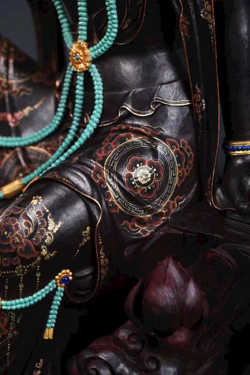 Trên thân và y phục được trang trí họa kim và tô màu thủ công, đường nét trang sức và y văn tỉ mỉ, sắc thái trang nhã rực rỡ. Toàn bộ tư thế thanh thoát, thần thái an hòa, toát lên vẻ uyển chuyển và cao khiết, thể hiện trình độ nghệ thuật xuất sắc của người sáng tác.
