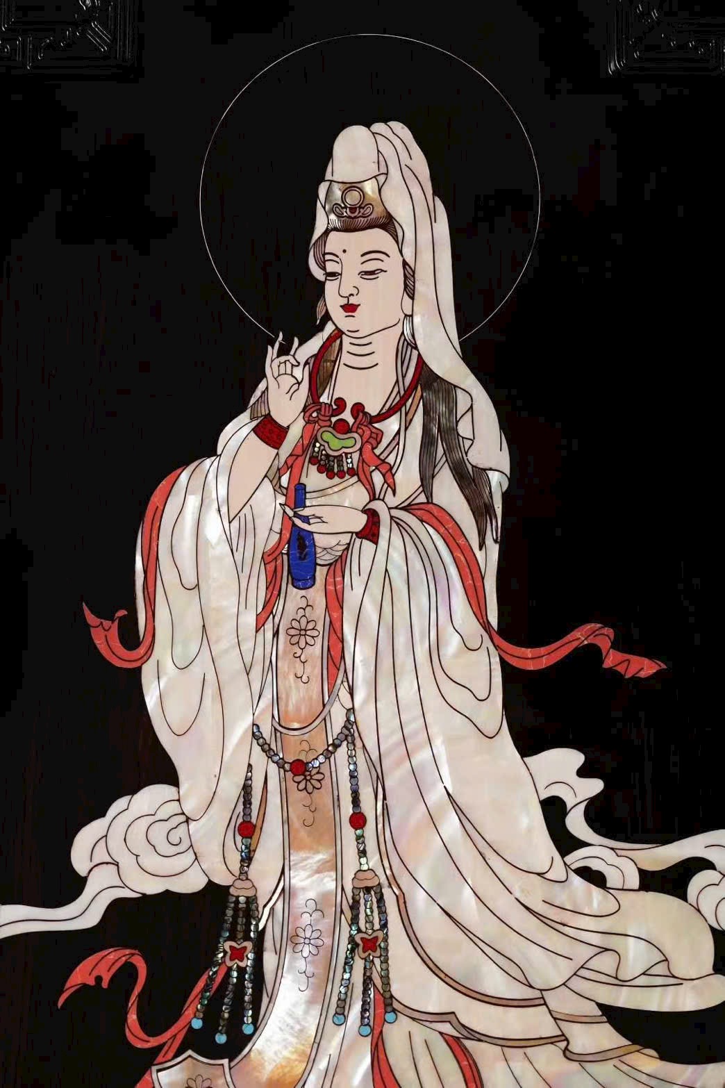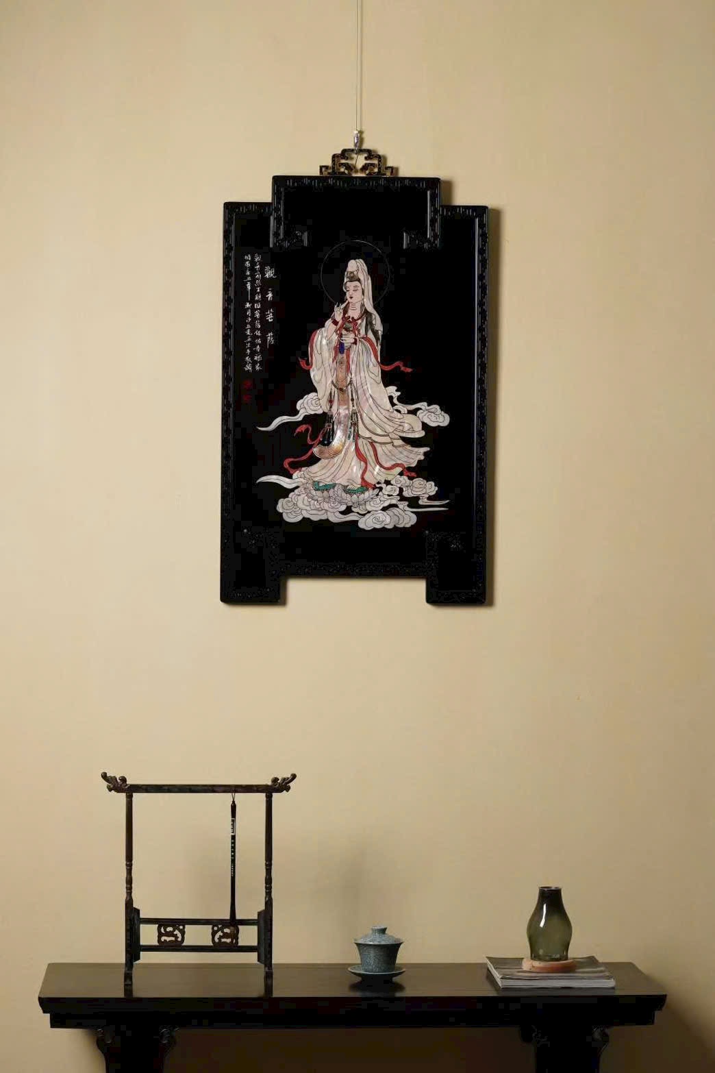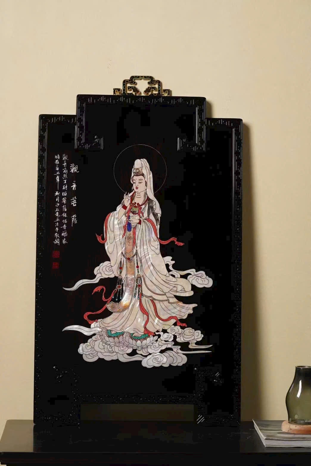 Kỹ nghệ khảm xà cừ được thực hiện công phu tinh xảo, tôn tượng Quán Âm hiện lên trang nghiêm. Trên nền gỗ tử quang đàn trầm tĩnh, sắc óng ánh của xà cừ hòa cùng màu họa tiết, tạo nên hiệu ứng lung linh rực rỡ. Vạt áo nhẹ bồng như mây, đài sen khởi lành khí, toát lên trọn vẹn vẻ từ hòa và trang tĩnh.