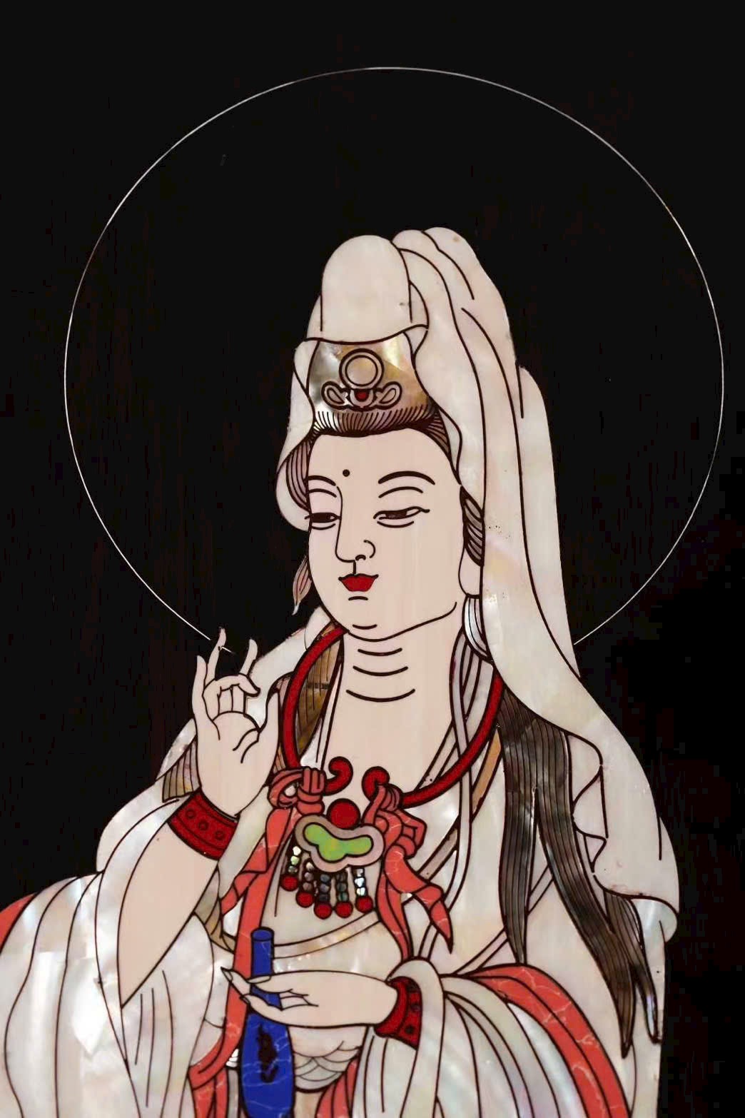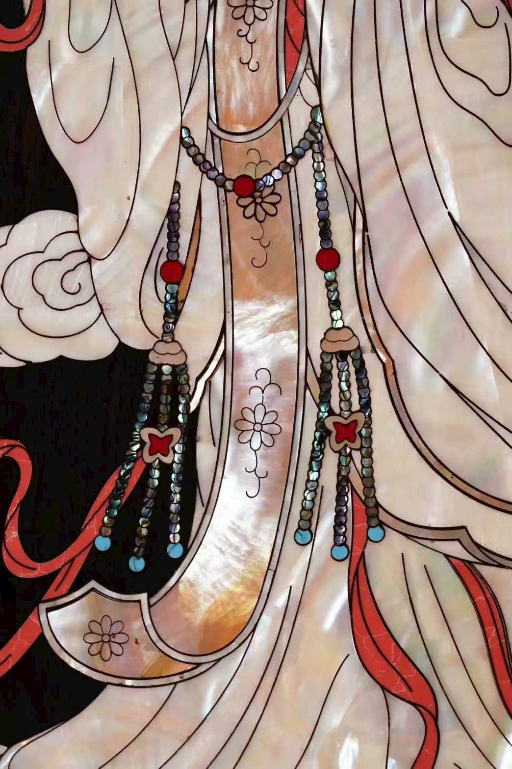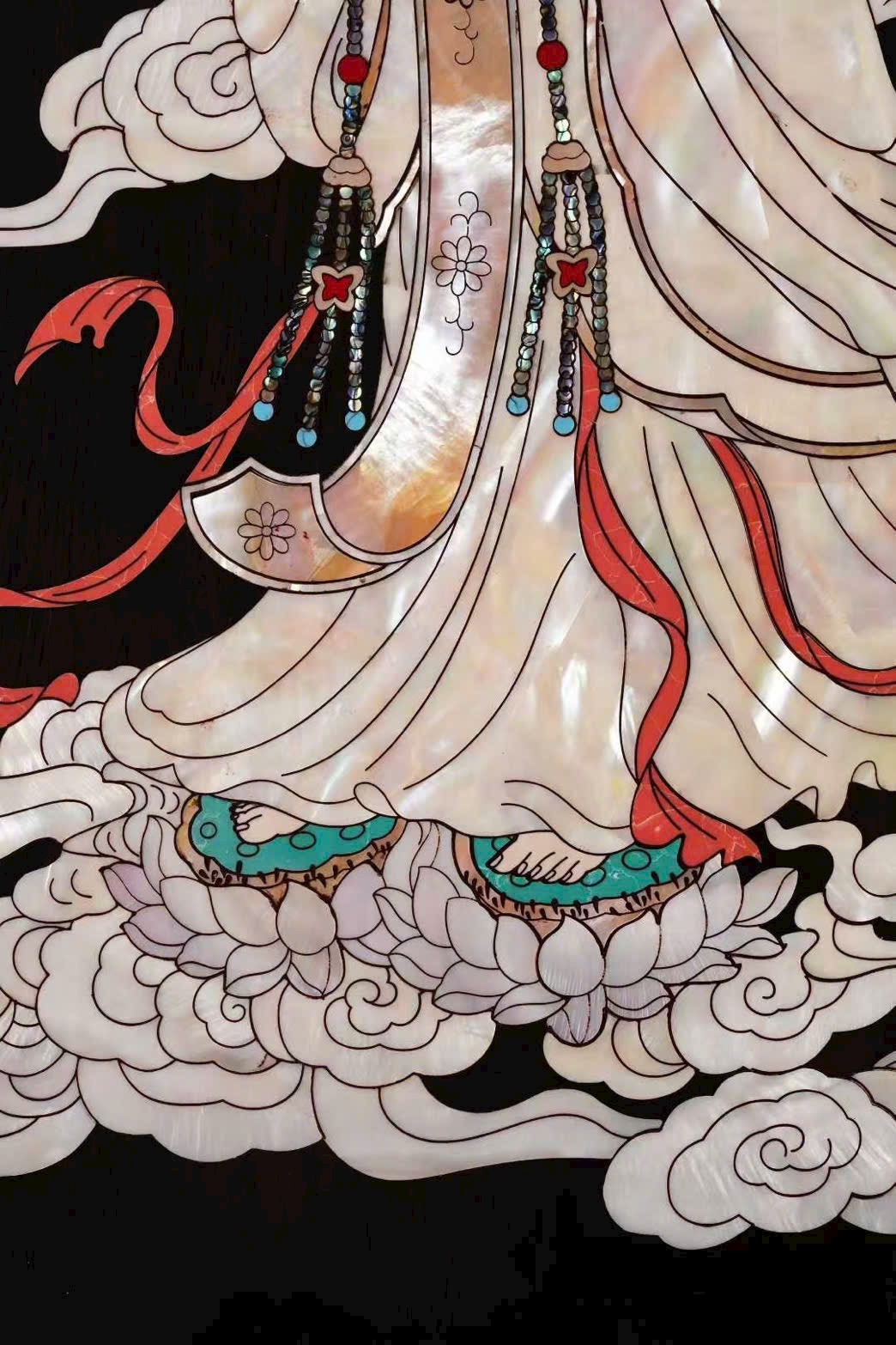 Kỹ nghệ khảm xà cừ được thực hiện công phu tinh xảo, tôn tượng Quán Âm hiện lên trang nghiêm. Trên nền gỗ tử quang đàn trầm tĩnh, sắc óng ánh của xà cừ hòa cùng màu họa tiết, tạo nên hiệu ứng lung linh rực rỡ. Vạt áo nhẹ bồng như mây, đài sen khởi lành khí, toát lên trọn vẹn vẻ từ hòa và trang tĩnh.