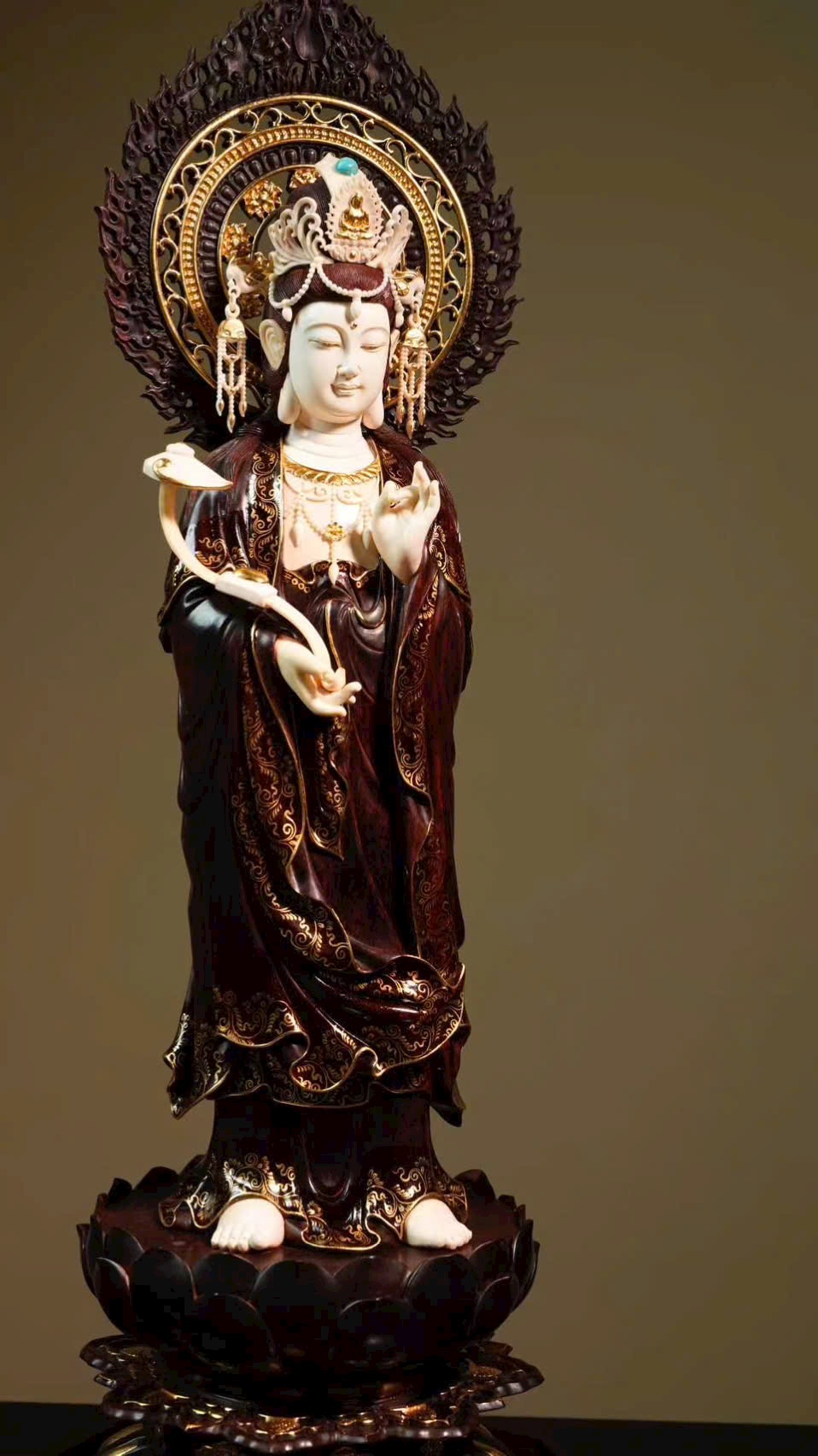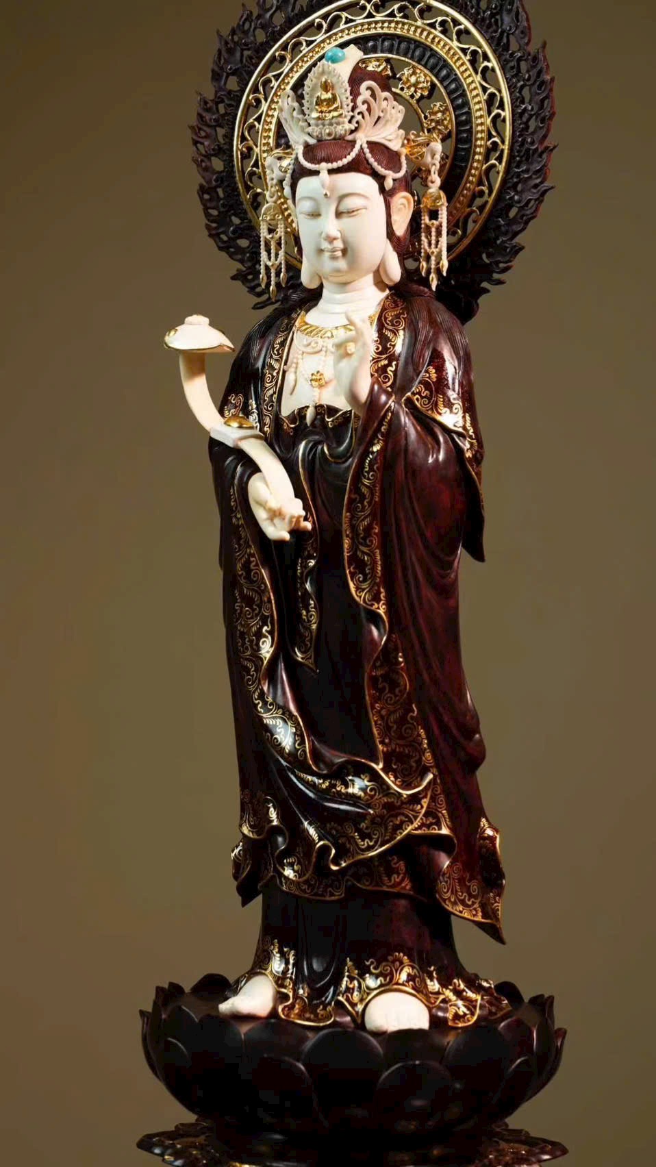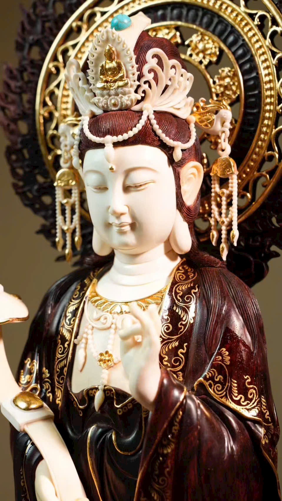 Tuyển chọn liệu gỗ tử đàn lá nhỏ quý hiếm, thủ công đục chạm tinh xảo, khảm ngà voi ma mút, toàn thể tác phẩm chế tác tuyệt mỹ. Diện tướng Bồ Tát đầy đặn, chân mày mắt dài thanh thoát, khoác choàng vai, hạ thân mặc xiêm, tay cầm Như Ý, ngồi kiết già trên tòa sen, thần thái an tĩnh từ hòa, pháp tướng trang nghiêm.