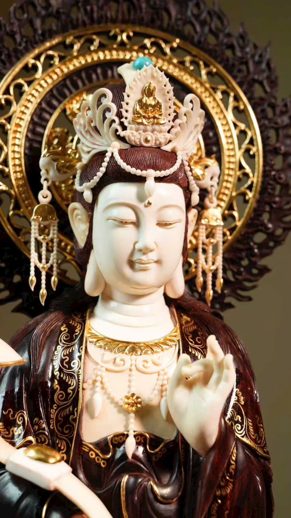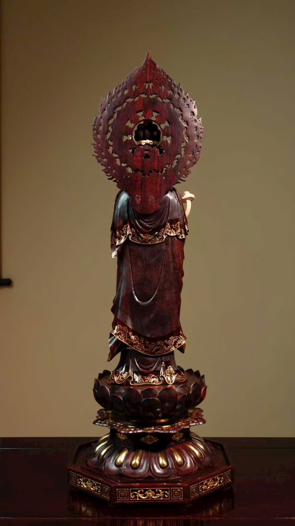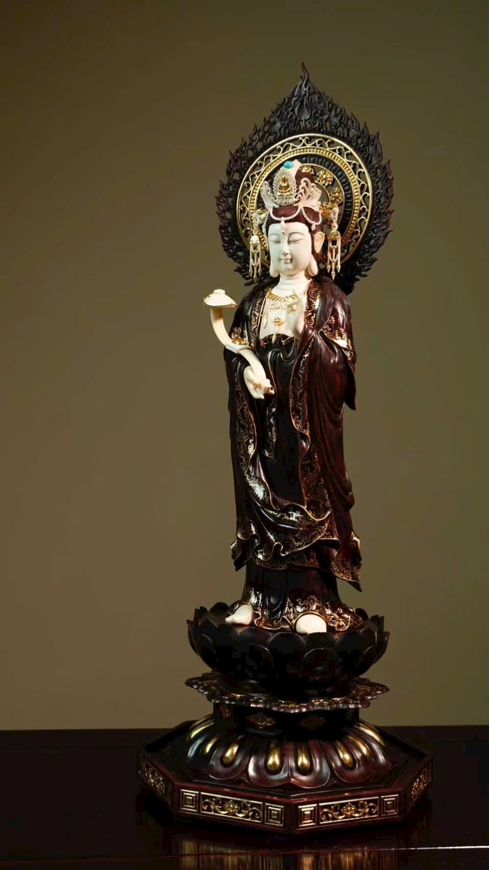 Tuyển chọn liệu gỗ tử đàn lá nhỏ quý hiếm, thủ công đục chạm tinh xảo, khảm ngà voi ma mút, toàn thể tác phẩm chế tác tuyệt mỹ. Diện tướng Bồ Tát đầy đặn, chân mày mắt dài thanh thoát, khoác choàng vai, hạ thân mặc xiêm, tay cầm Như Ý, ngồi kiết già trên tòa sen, thần thái an tĩnh từ hòa, pháp tướng trang nghiêm.