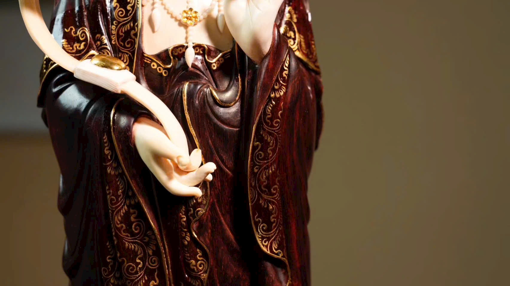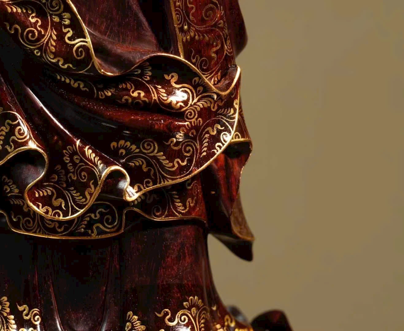 Đường đao khéo léo, y phục buông rủ tự nhiên, chi tiết tinh vi. Một tay cầm Như Ý, một tay kết pháp ấn, mang ý nghĩa cát tường cứu độ chúng sinh, trừ bệnh tiêu tai, hóa giải khổ nạn.