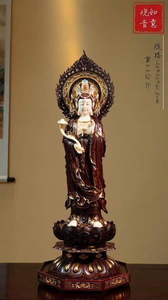 Đường đao khéo léo, y phục buông rủ tự nhiên, chi tiết tinh vi. Một tay cầm Như Ý, một tay kết pháp ấn, mang ý nghĩa cát tường cứu độ chúng sinh, trừ bệnh tiêu tai, hóa giải khổ nạn.