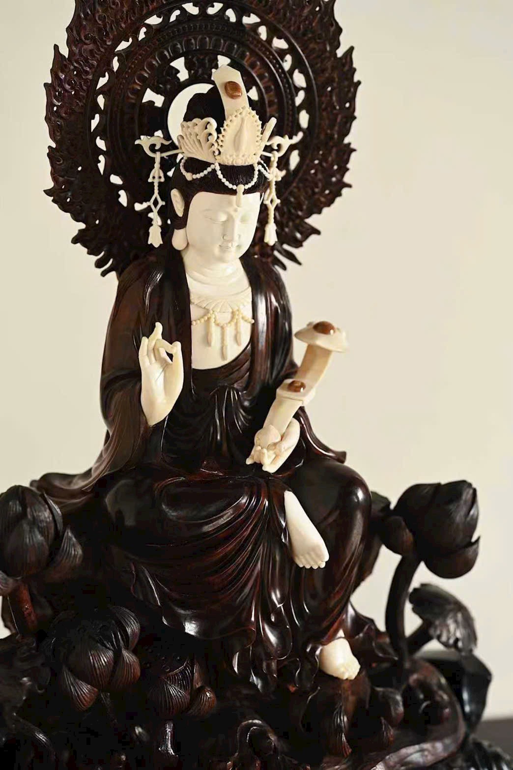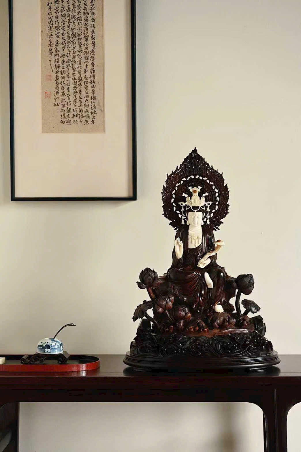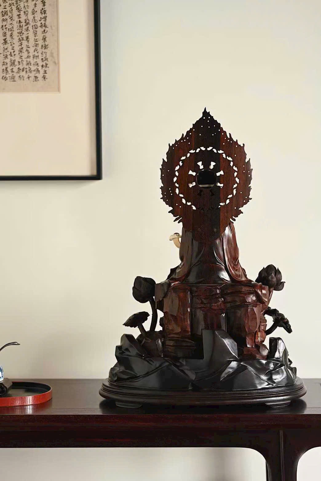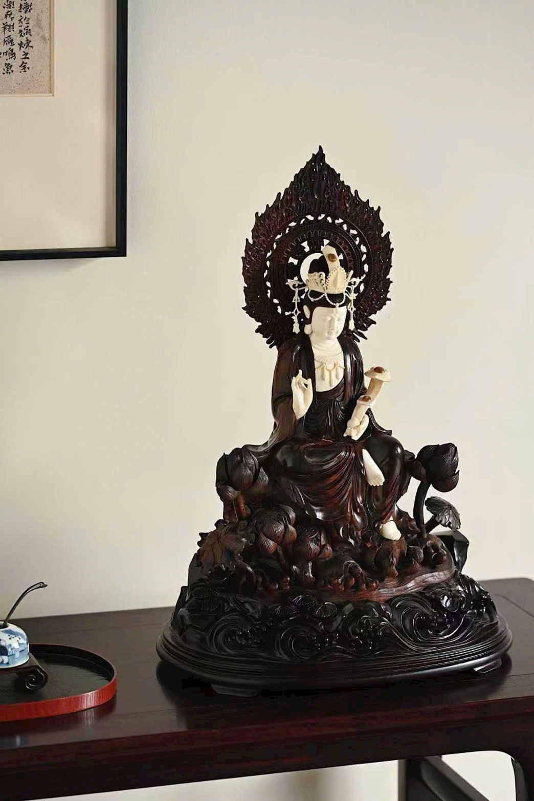 Tượng Quan Âm cúi đầu, ánh mắt hiền từ, dung nhan đầy đặn phúc hậu, biểu cảm chan chứa từ bi. Y phục buông rủ tự nhiên, nếp áo mềm mại uyển chuyển. Tay Ngài cầm như ý an nhiên tọa thiền trên tòa sen nở rộ, toàn thể tác phẩm toát lên vẻ thanh nhã, cao quý và trang nghiêm siêu phàm.