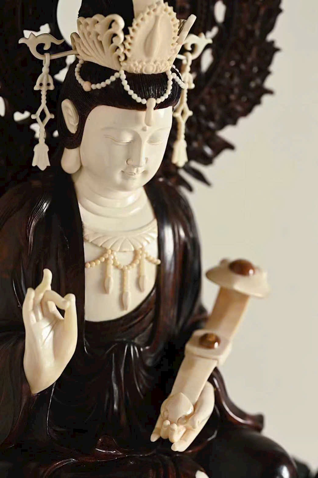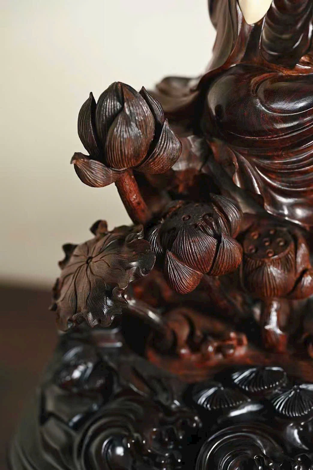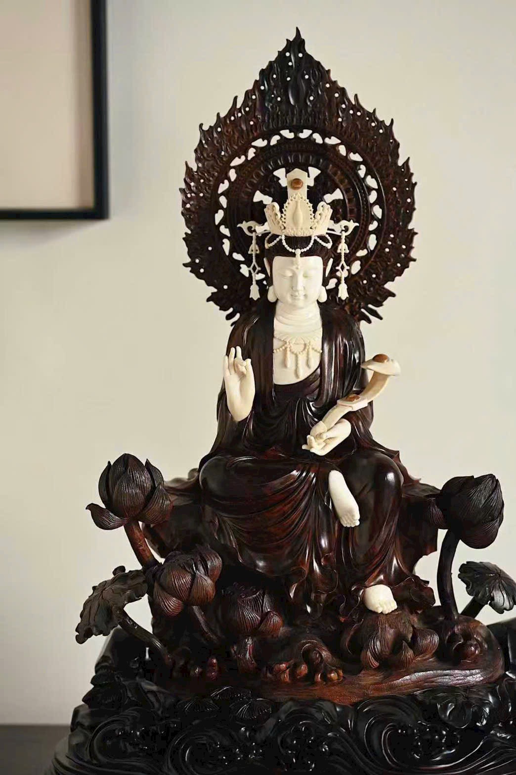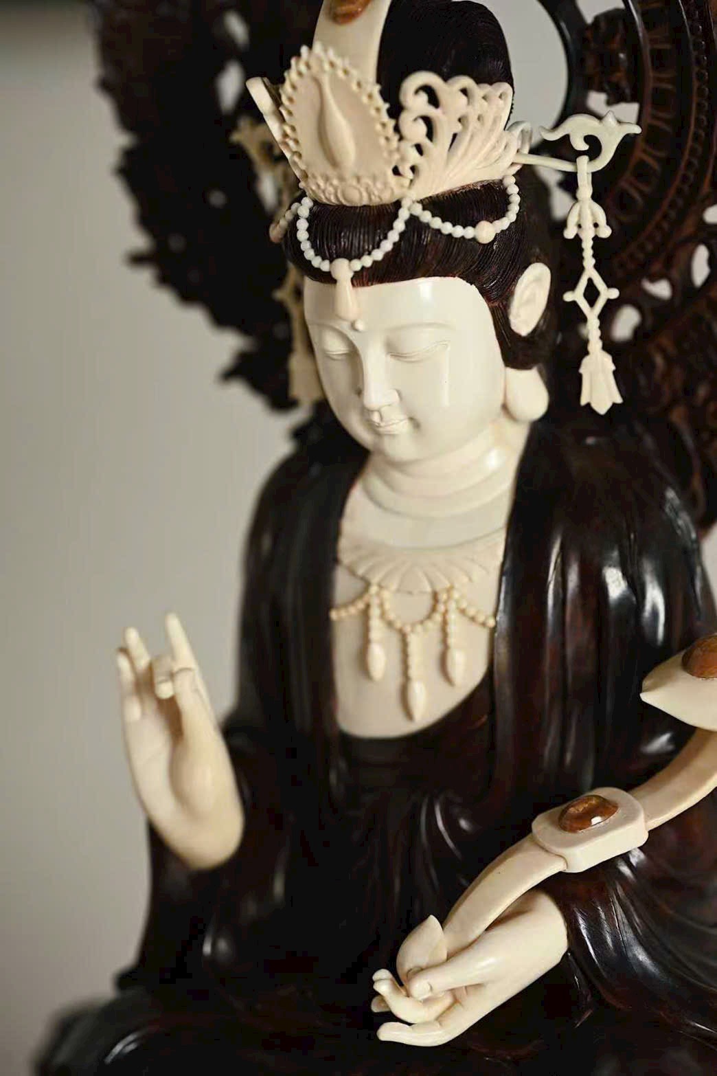 Tượng Quan Âm cúi đầu, ánh mắt hiền từ, dung nhan đầy đặn phúc hậu, biểu cảm chan chứa từ bi. Y phục buông rủ tự nhiên, nếp áo mềm mại uyển chuyển. Tay Ngài cầm như ý an nhiên tọa thiền trên tòa sen nở rộ, toàn thể tác phẩm toát lên vẻ thanh nhã, cao quý và trang nghiêm siêu phàm.