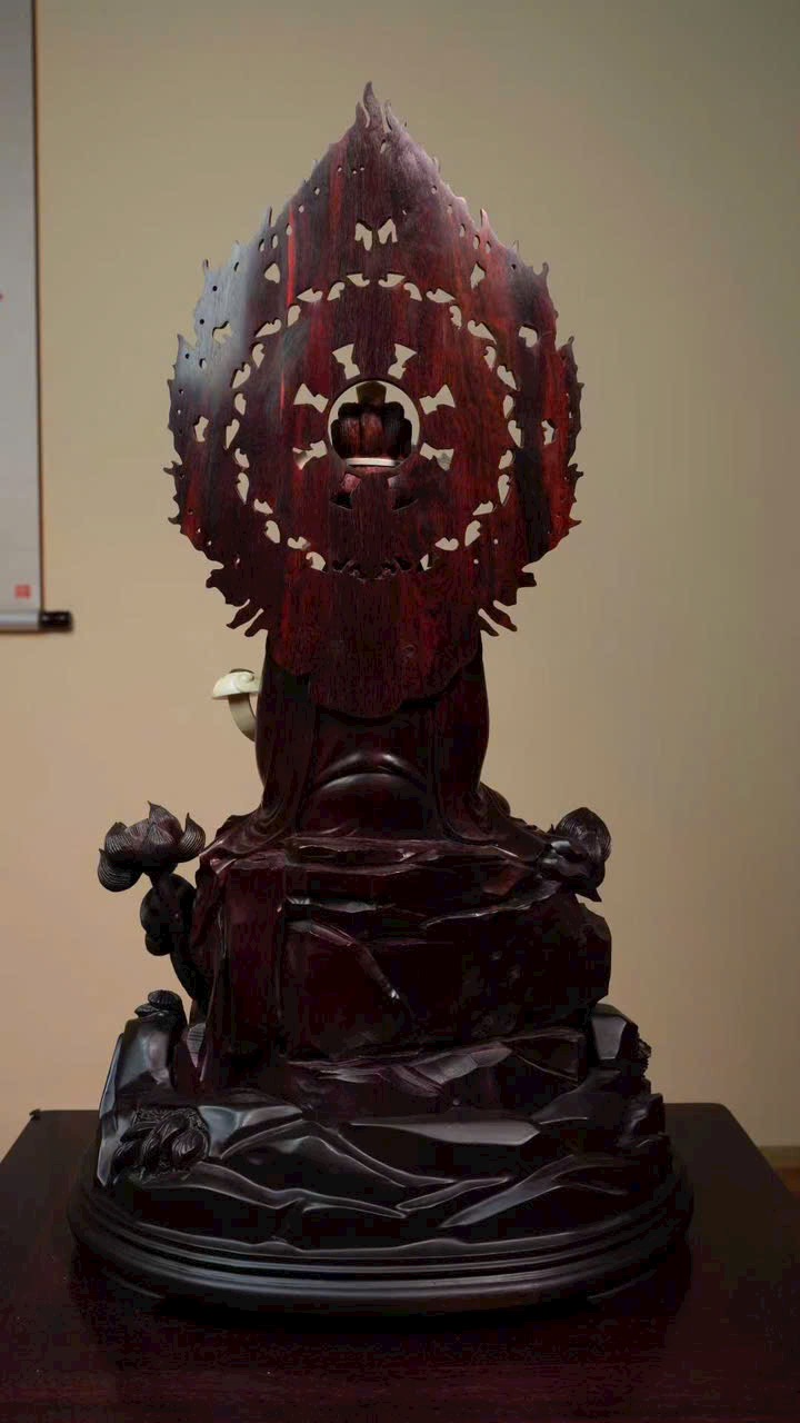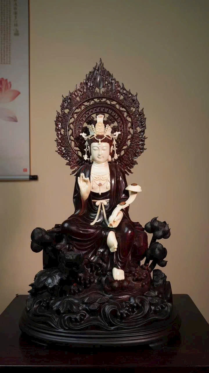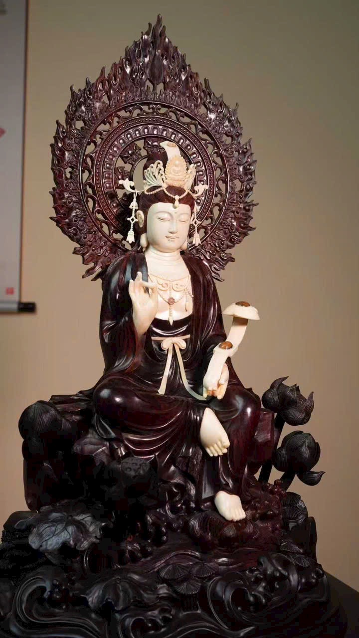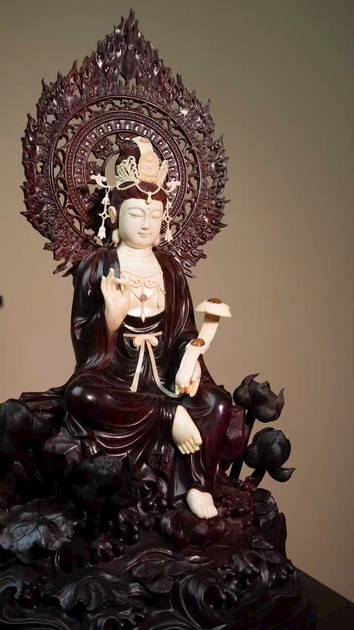 Gương mặt Quan Âm đầy đặn, thần thái từ bi tĩnh lặng. Tay cầm như ý, y phục chạm khắc tinh tế, đường nét thanh thoát cổ điển. Tư thế tự tại trên đài sen, tôn vẻ đẹp tự nhiên và khí chất trang nhã.