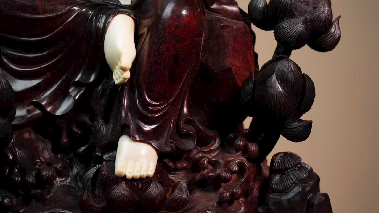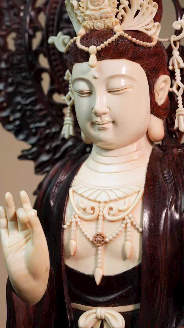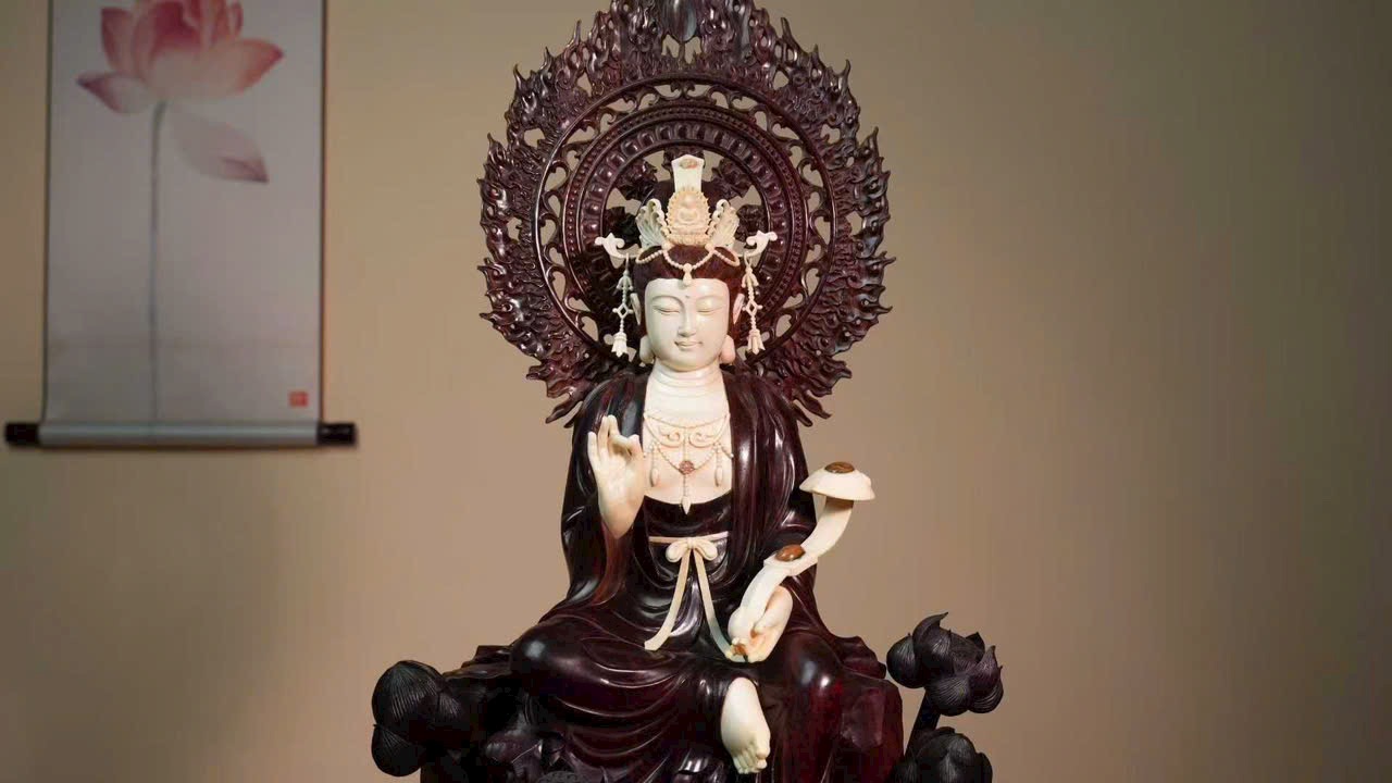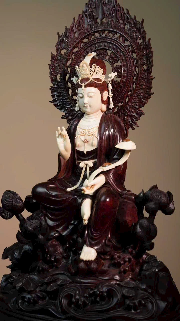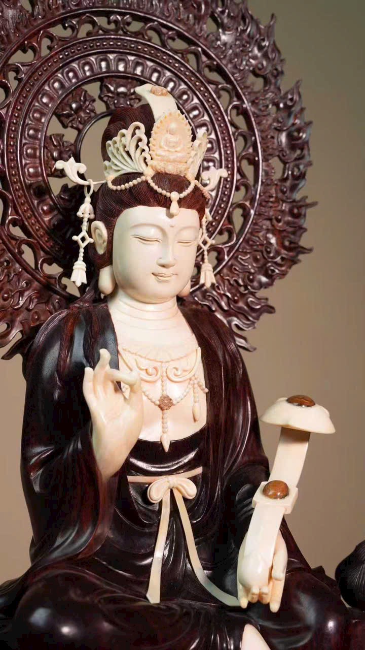 Gương mặt Quan Âm đầy đặn, thần thái từ bi tĩnh lặng. Tay cầm như ý, y phục chạm khắc tinh tế, đường nét thanh thoát cổ điển. Tư thế tự tại trên đài sen, tôn vẻ đẹp tự nhiên và khí chất trang nhã.