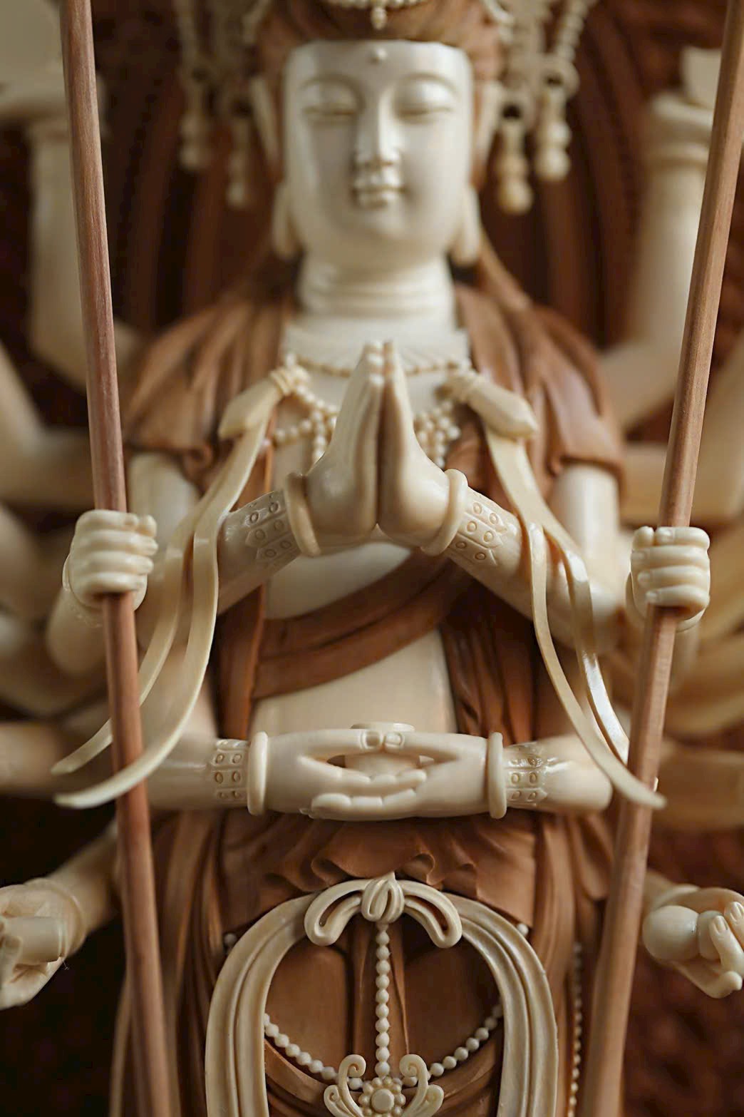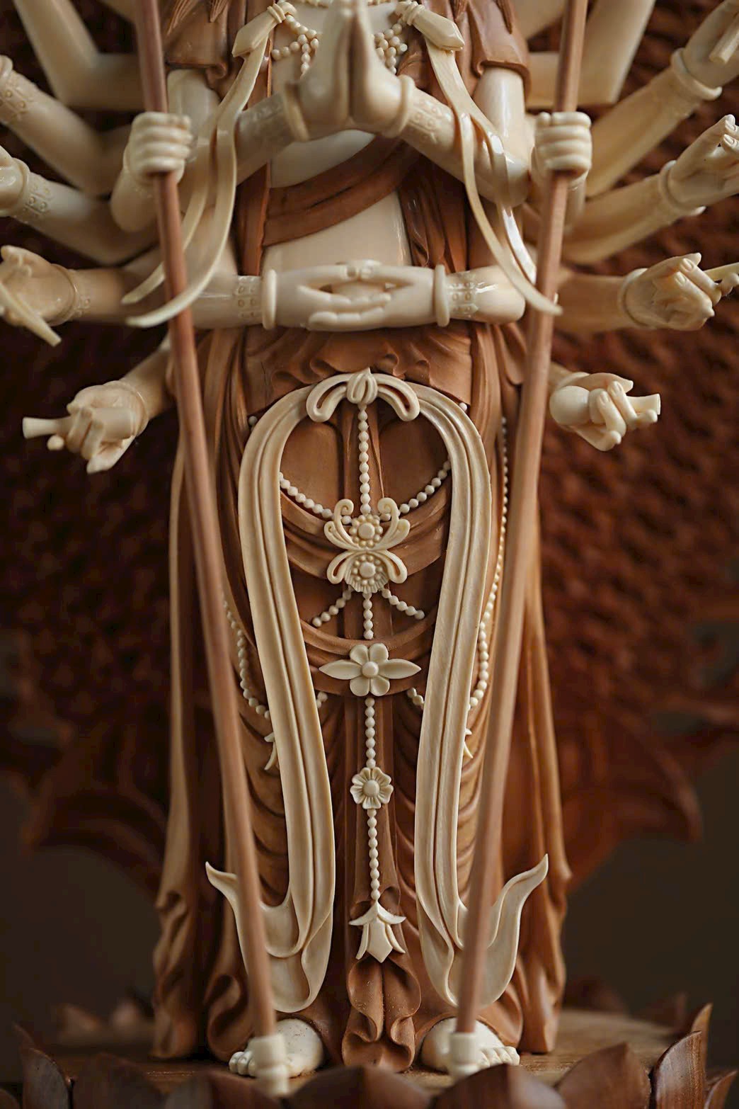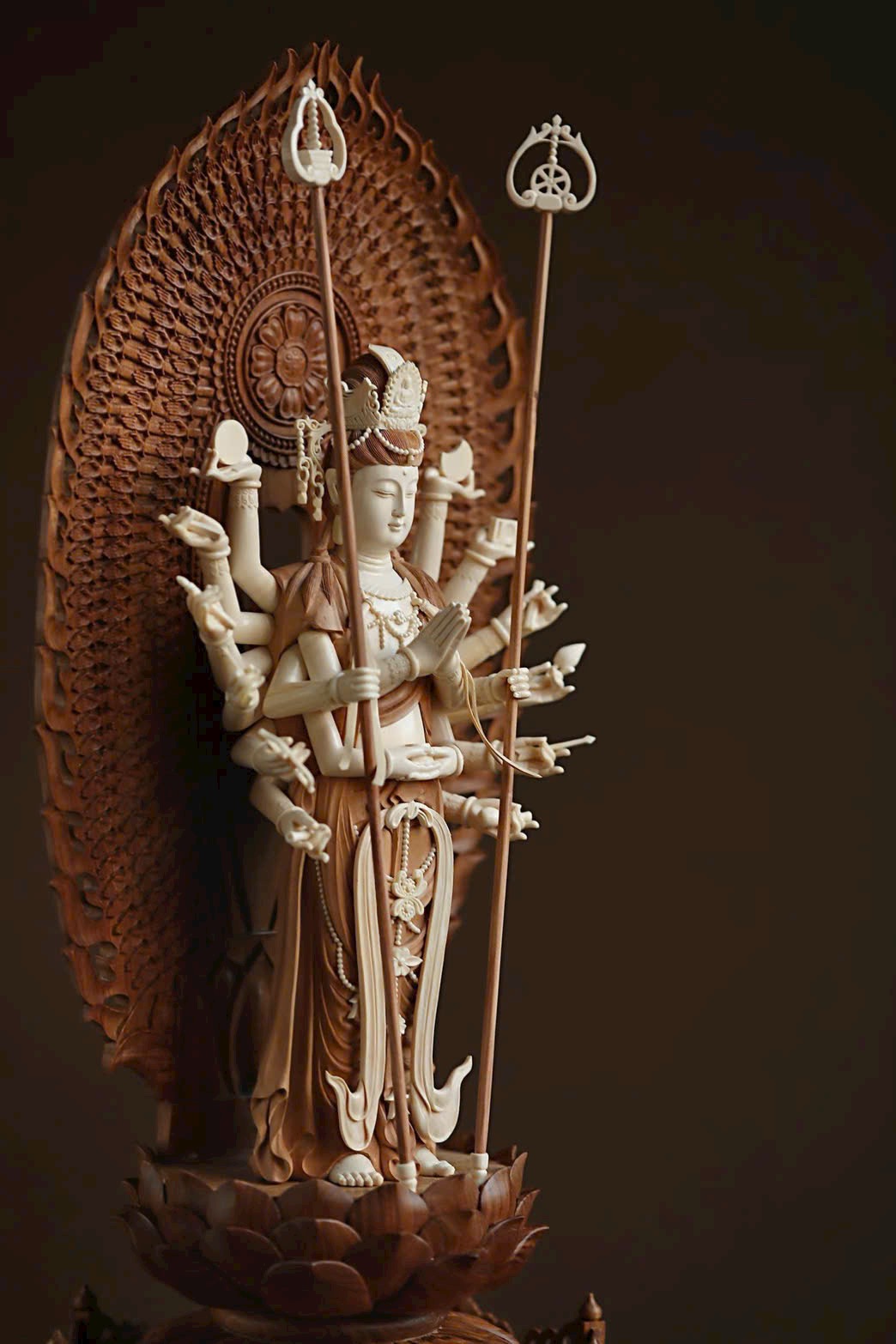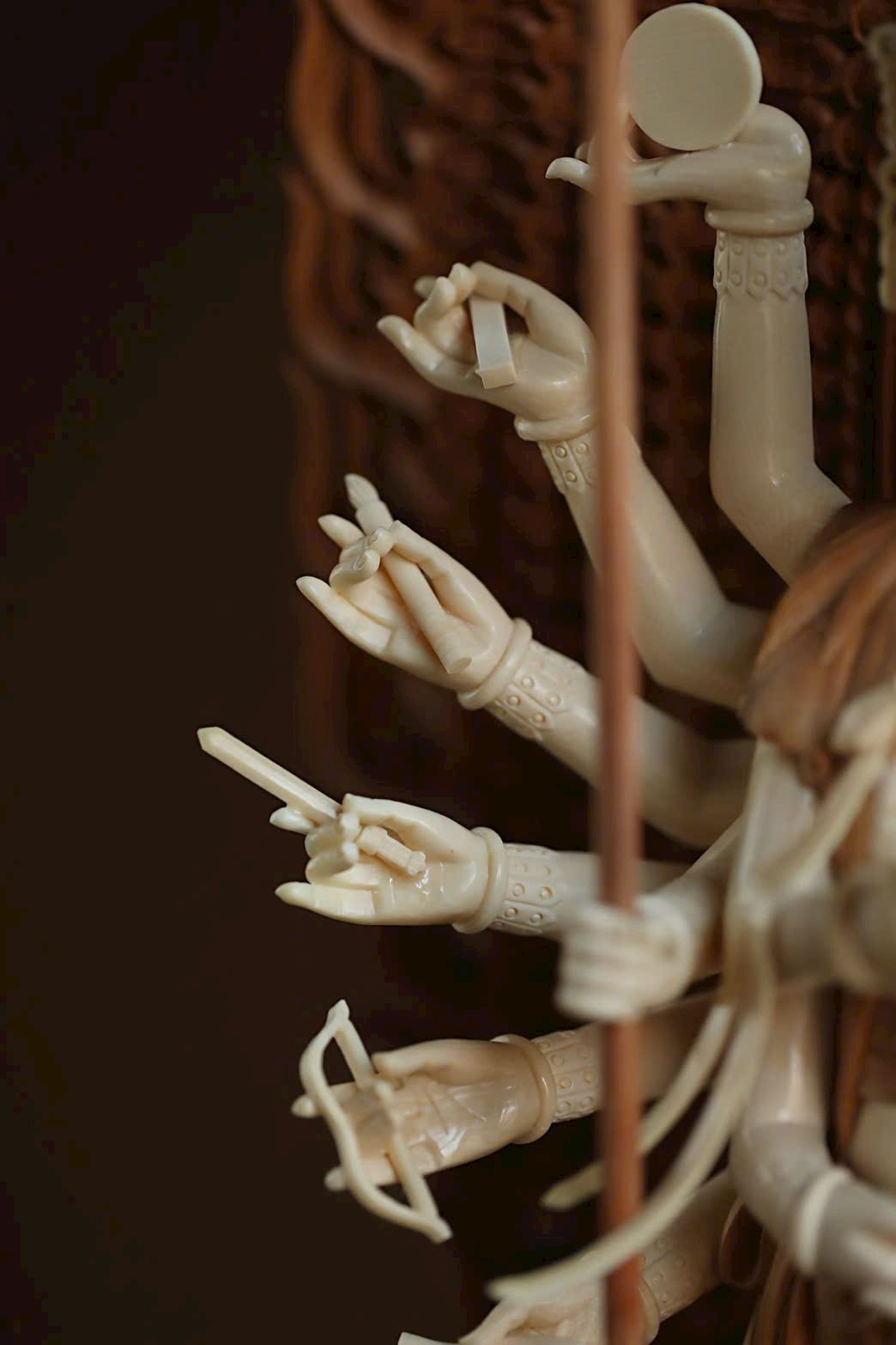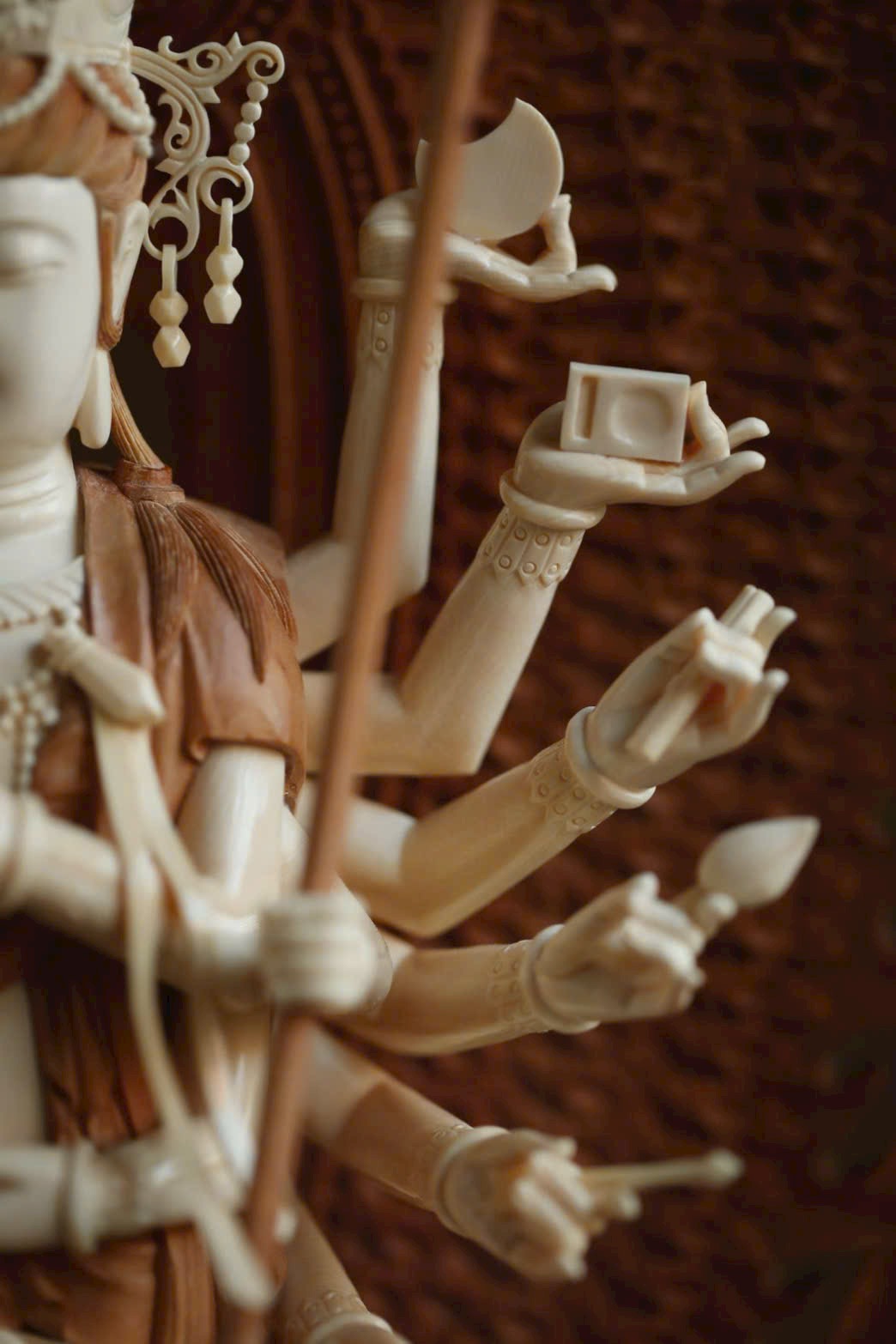 Cánh tay chính chắp lại trước ngực, tay cầm pháp khí, các cánh tay còn lại mở ra hai bên, tuy dày đặc như bình phong, nhưng không rối rắm, bố cục hợp lý, mỗi tay một pháp khí.