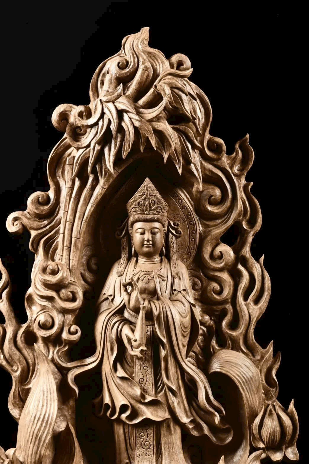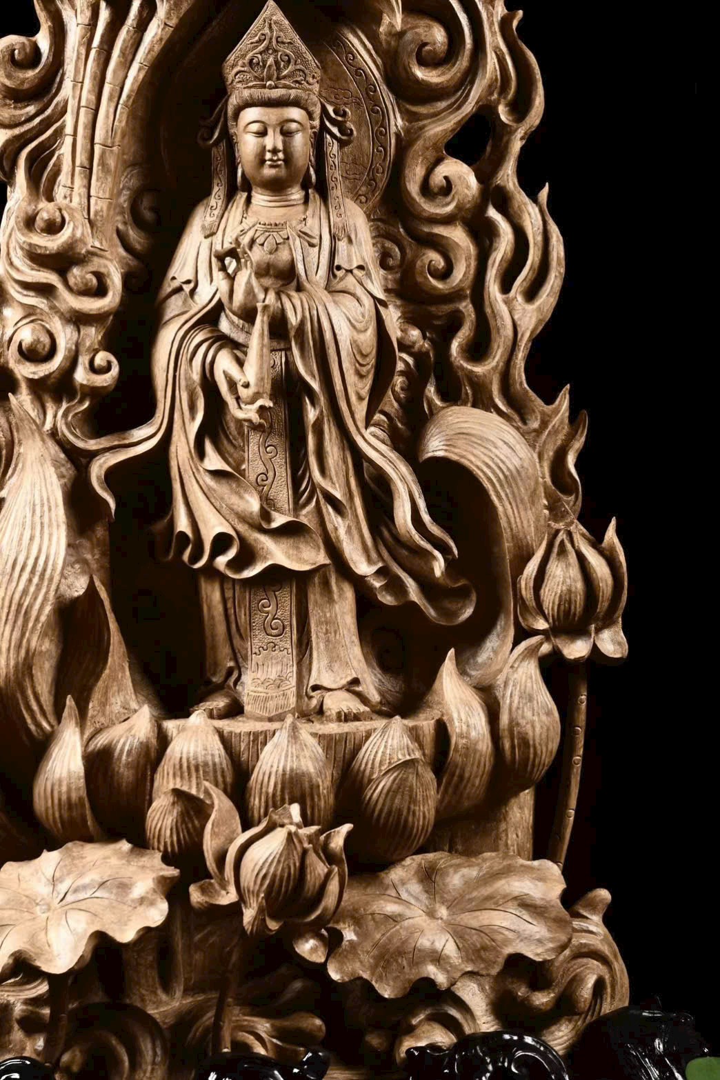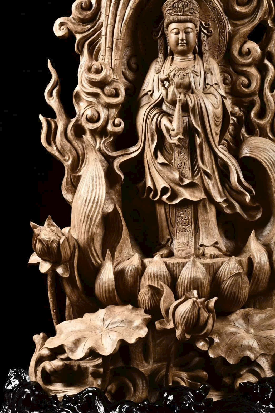 Toàn bộ tượng được điêu khắc thủ công tinh xảo, từng chi tiết đều mềm mại, trang nghiêm mà hiền hòa.