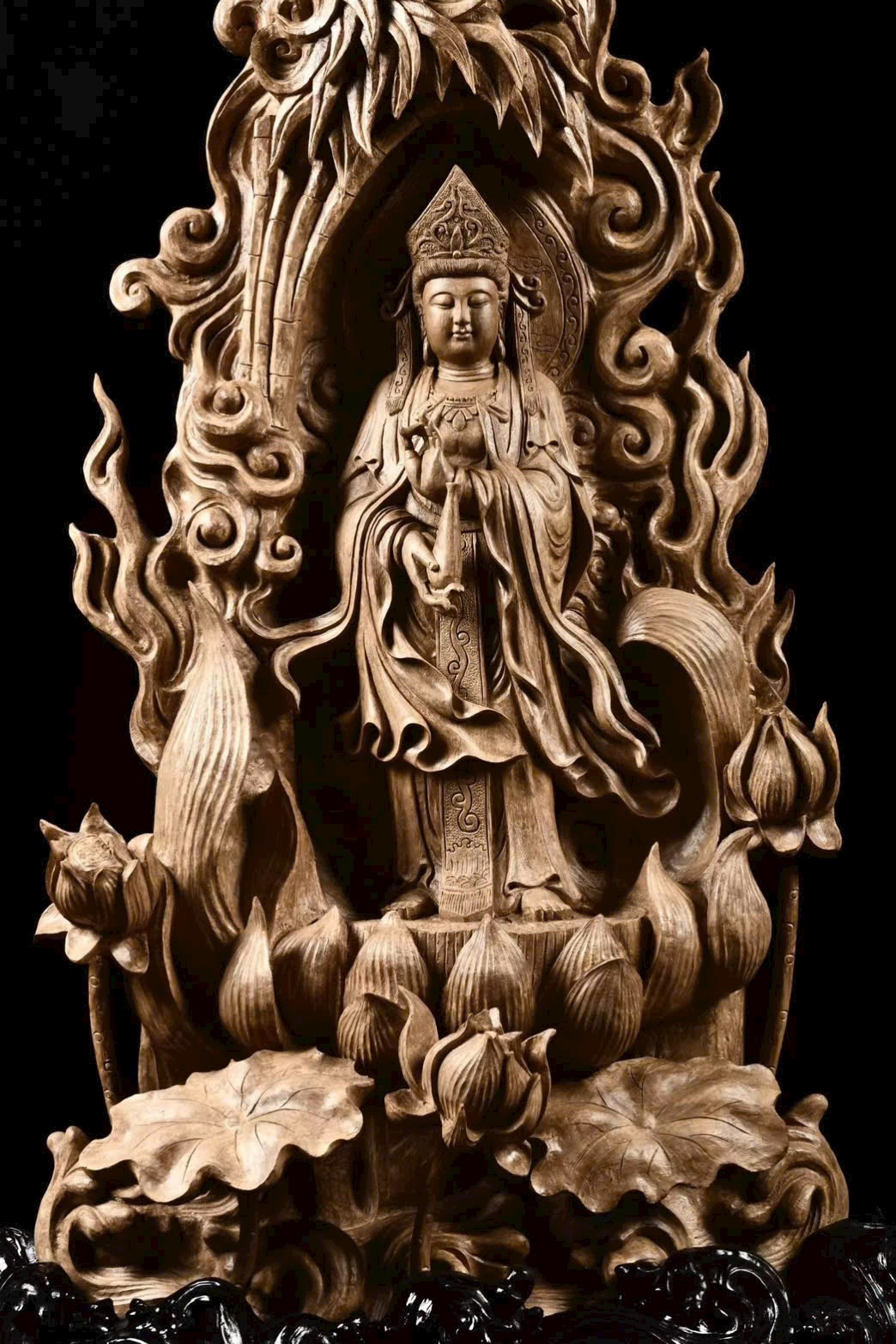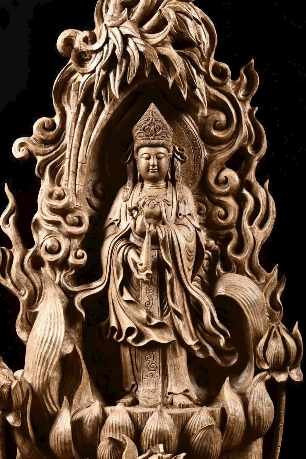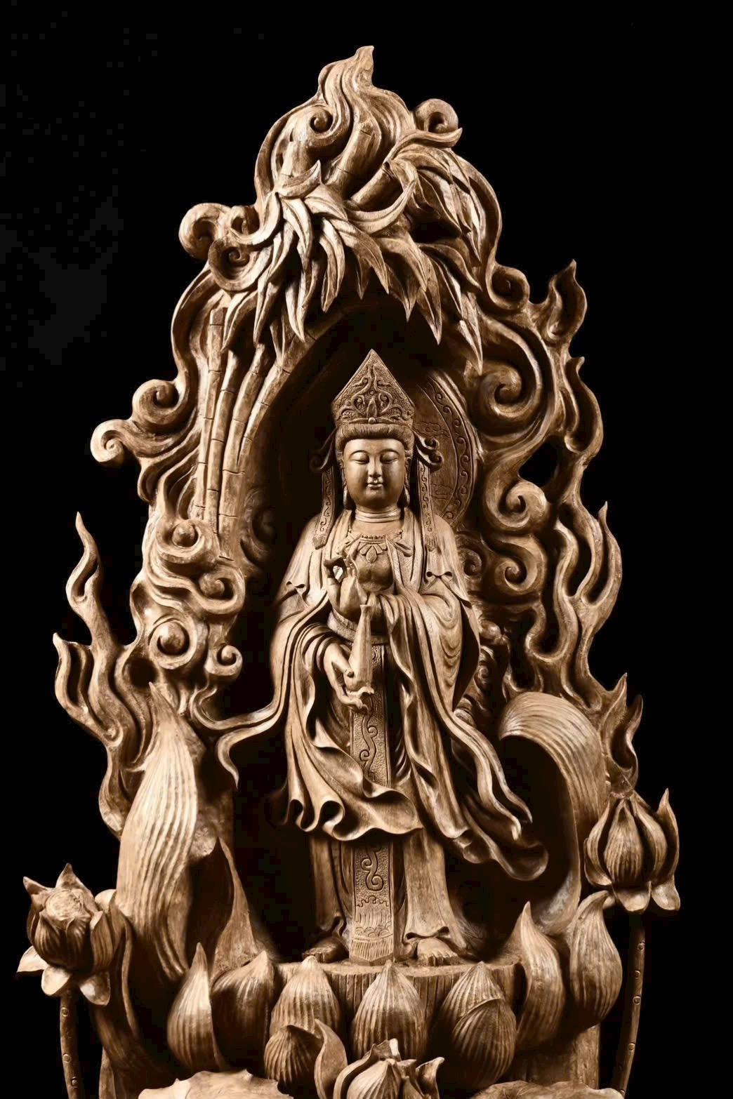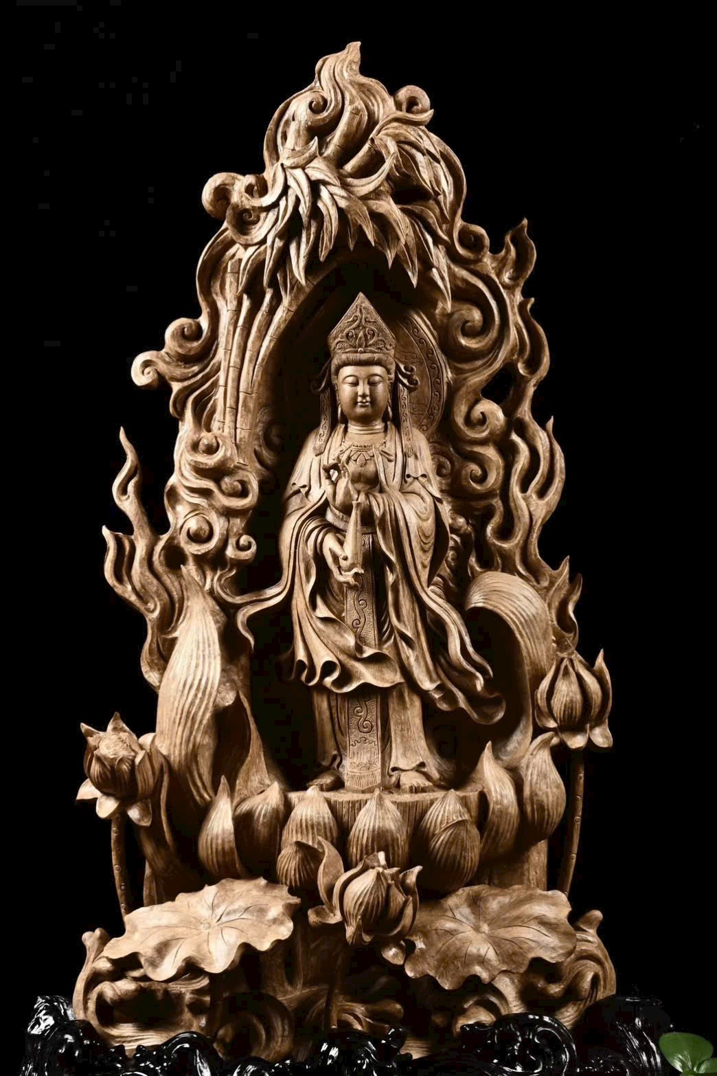 Toàn bộ tượng được điêu khắc thủ công tinh xảo, từng chi tiết đều mềm mại, trang nghiêm mà hiền hòa.